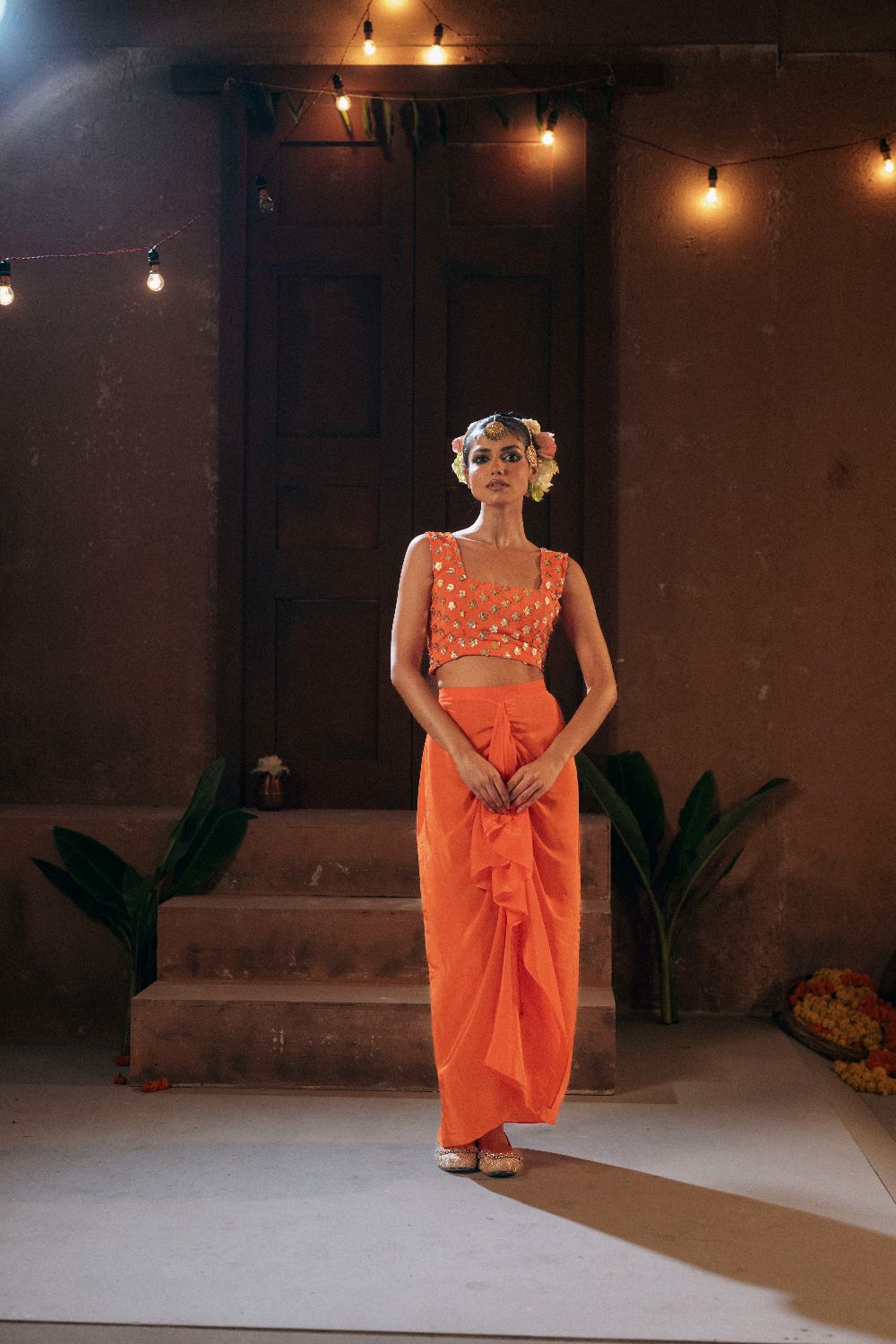 Make a statement with this Phool Blouse, Skirt & Cape Set. The structured blouse pairs perfectly with a fusion skirt, while the flowy cape adds drama and movement to the silhouette. Ideal for weddings,pre-weddings festive occasions, and curated celebrations. Model wears size S.