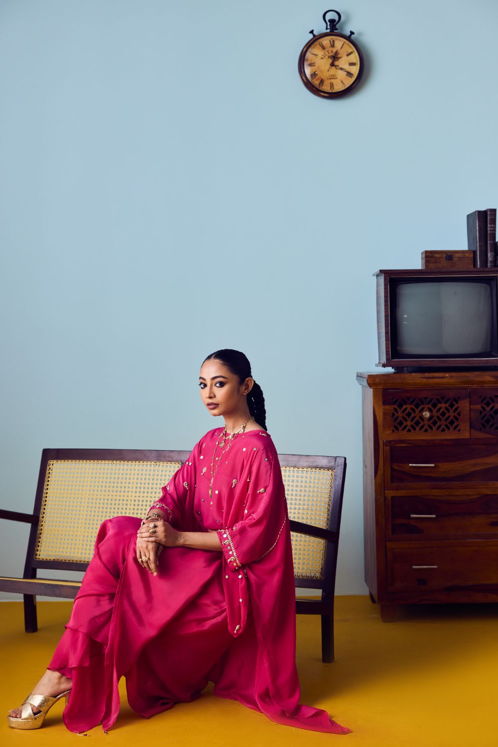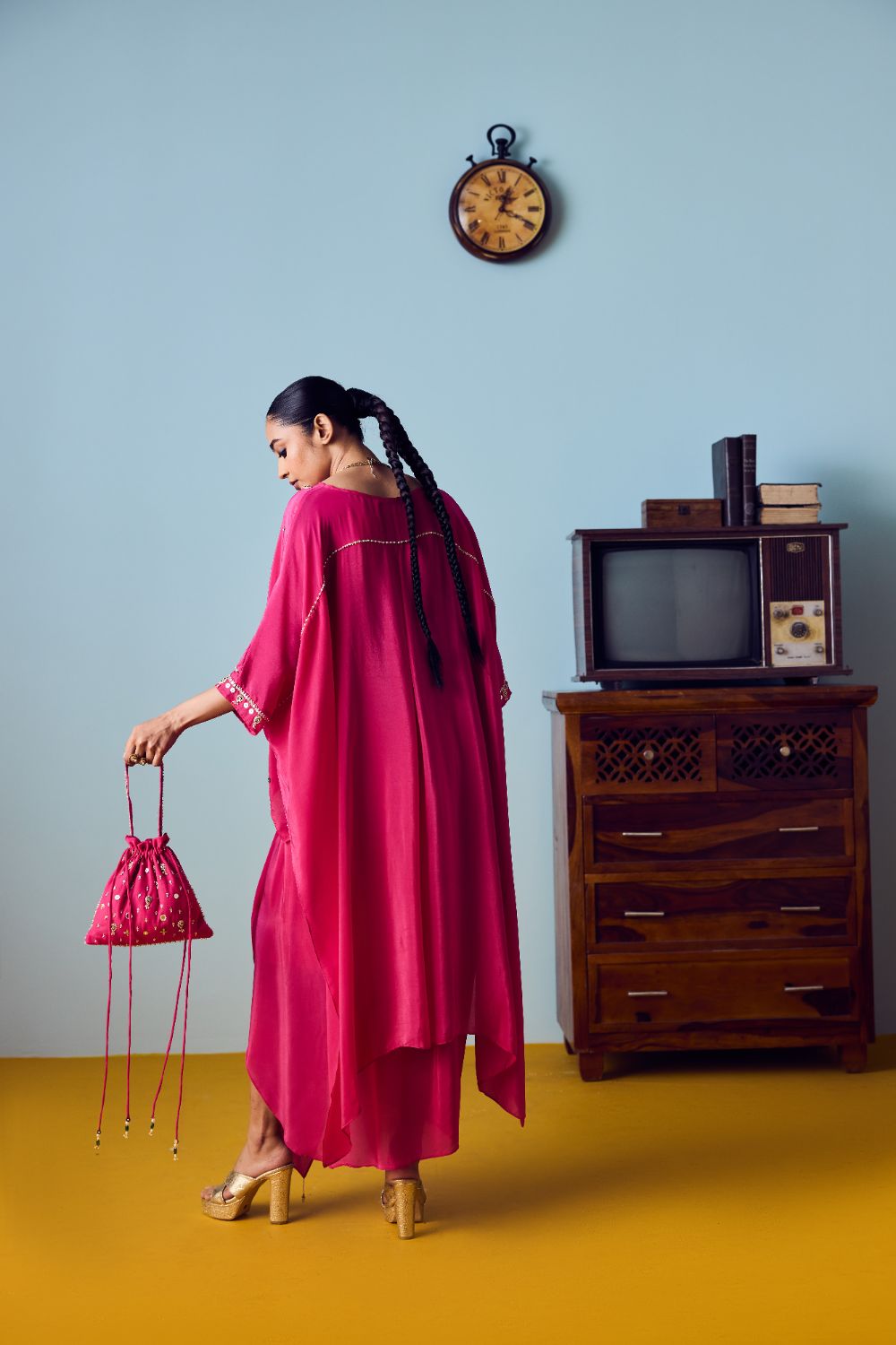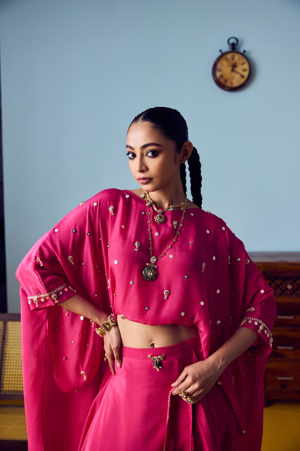 Fabric: Crepe silk blend that breathes beautifully, offering a soft touch and an elegant silhouette.