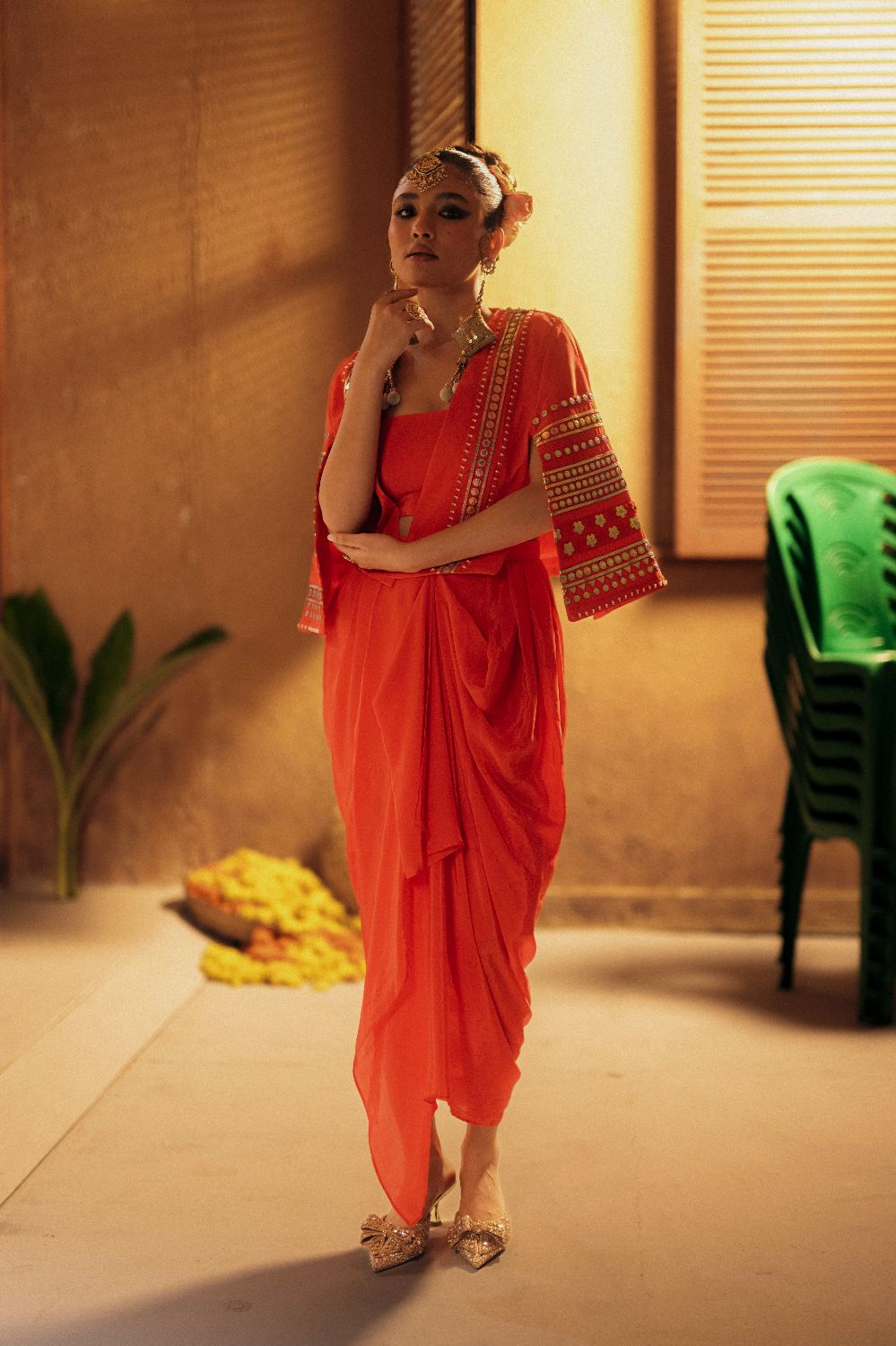 Embroidery Type: Gota Inspired Vegan Leather applique.Crafted using original in-house design patterns.This light weight leather applique evokes the look of gota work and is further hand embellished with pearls in varying sizes.