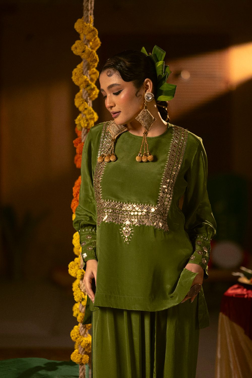Sunira Green Tunic Top & Dhoti Skirt Set- Mehendi