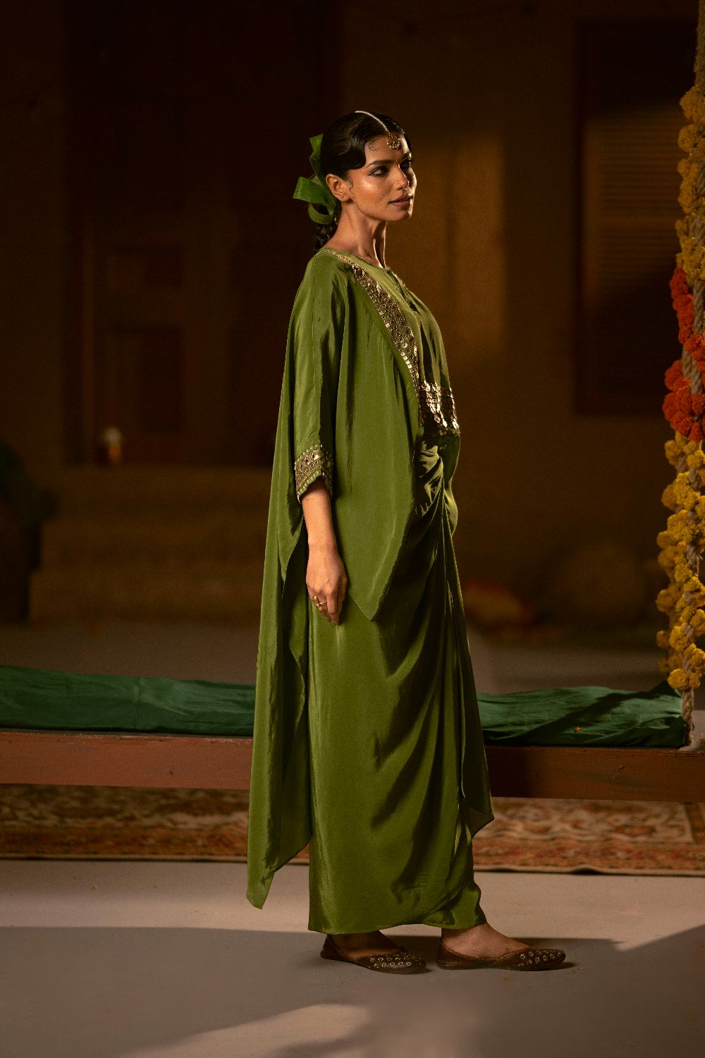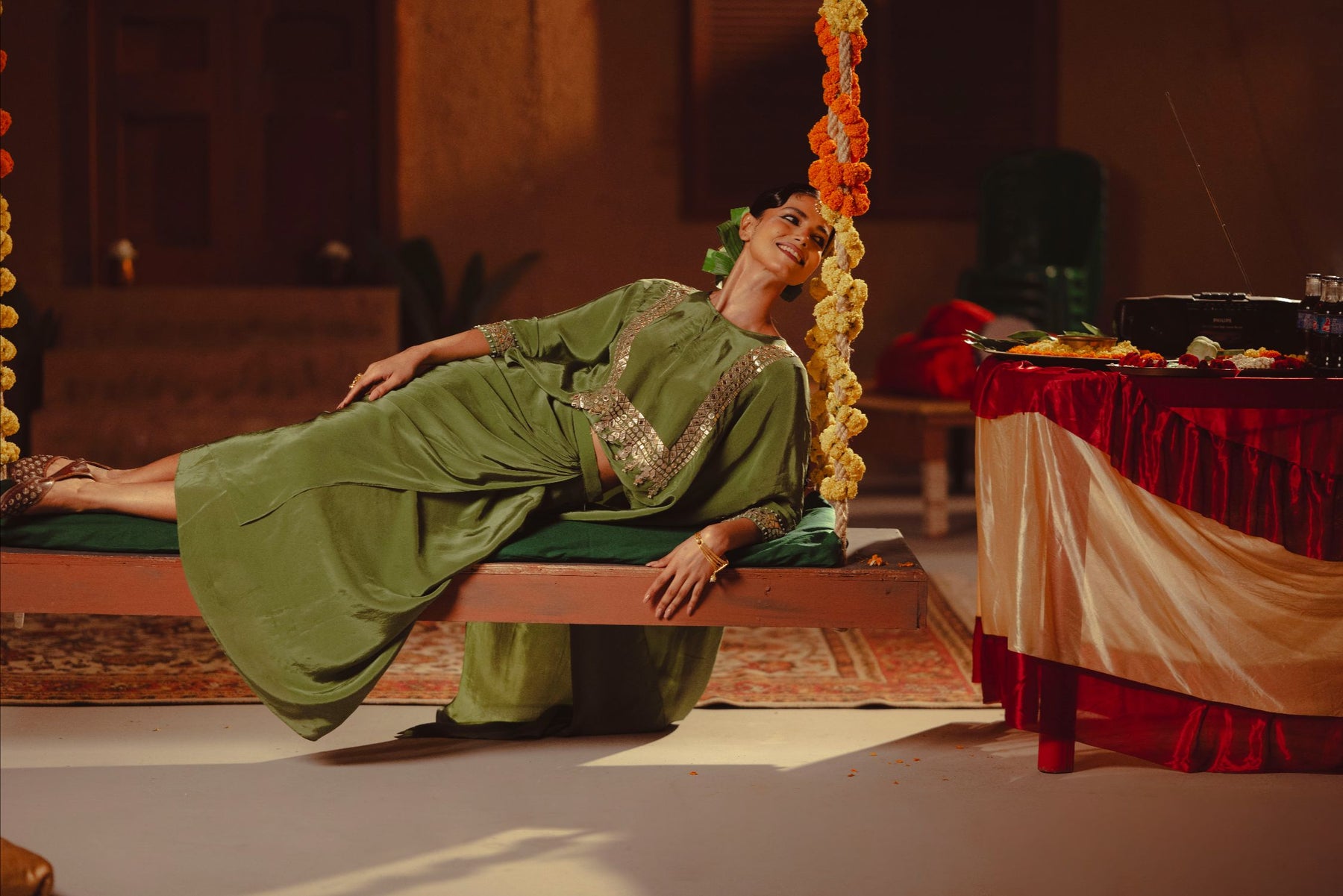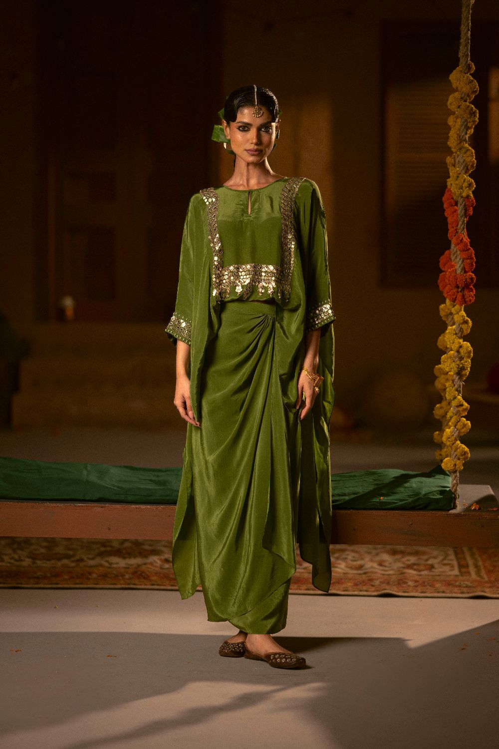 Sunira Nexa Red Hi Low Top & Wrap Skirt Set- Mehendi