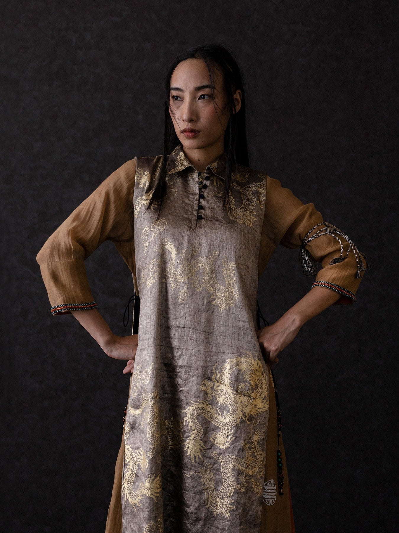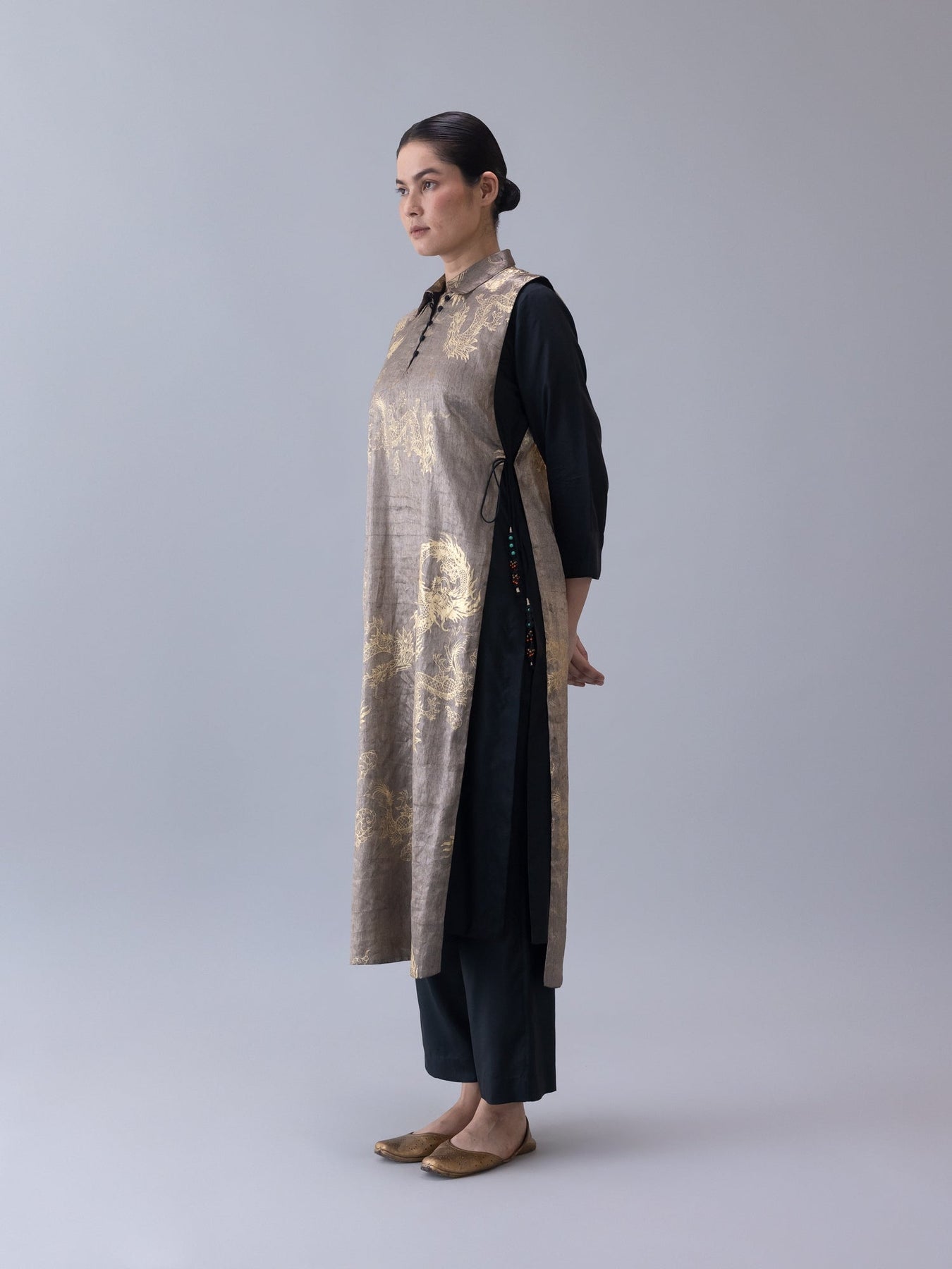 Trinpa overlay in antique black tissue twill munga, featuring dragon motifs with a refined shirt collar, voile buttons, and zari-beaded doris. Fully lined, it balances intricate craftsmanship with comfort and ease. Country of origin: India