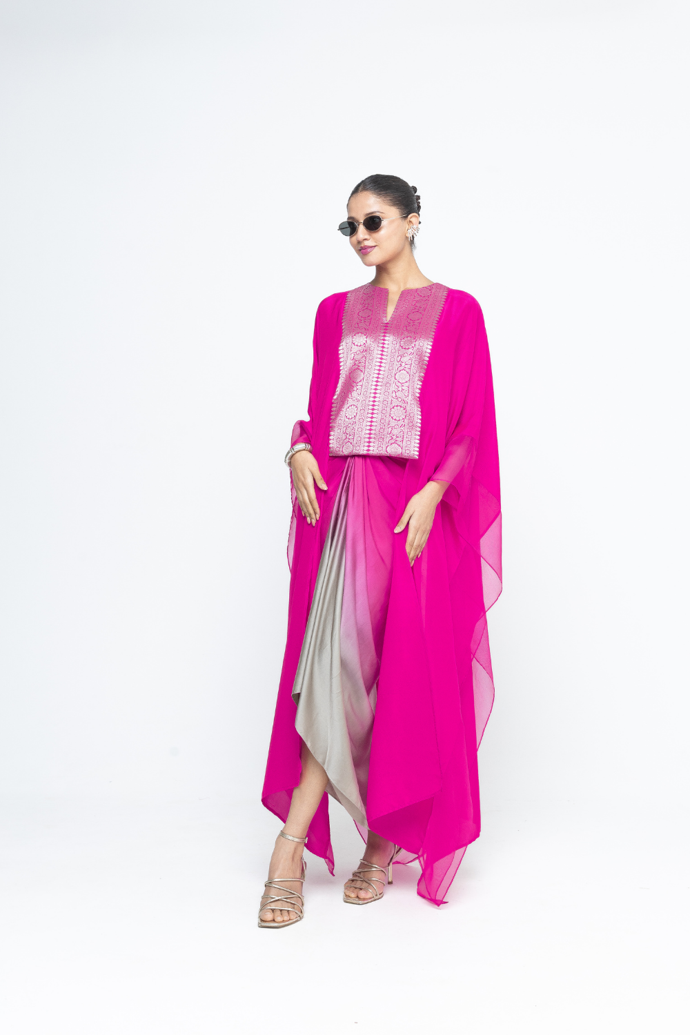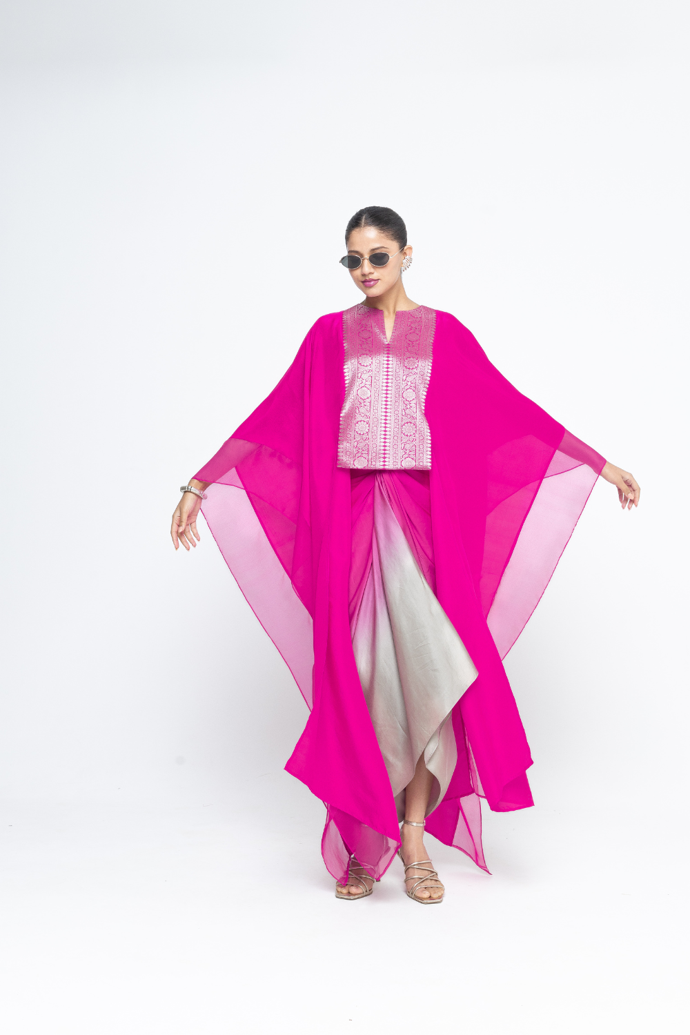 Pink Flowy Silk cape with Brocade neck and back detail and organza finish paired with an Ombre Assymetrical tie detail Dress