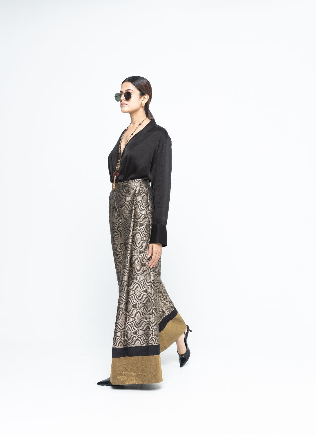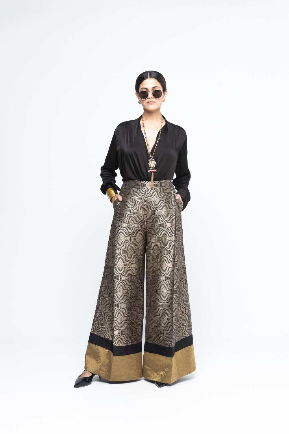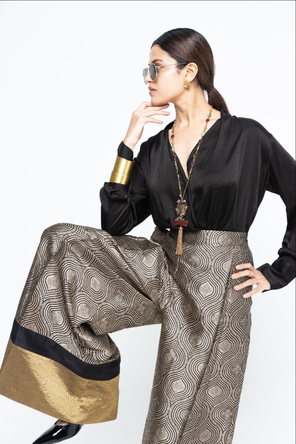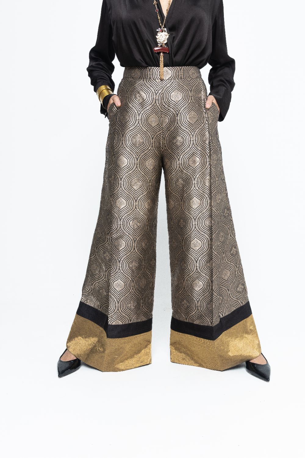 Black scallop weave statement Brocade pants paired with a statemnet wrap shirt