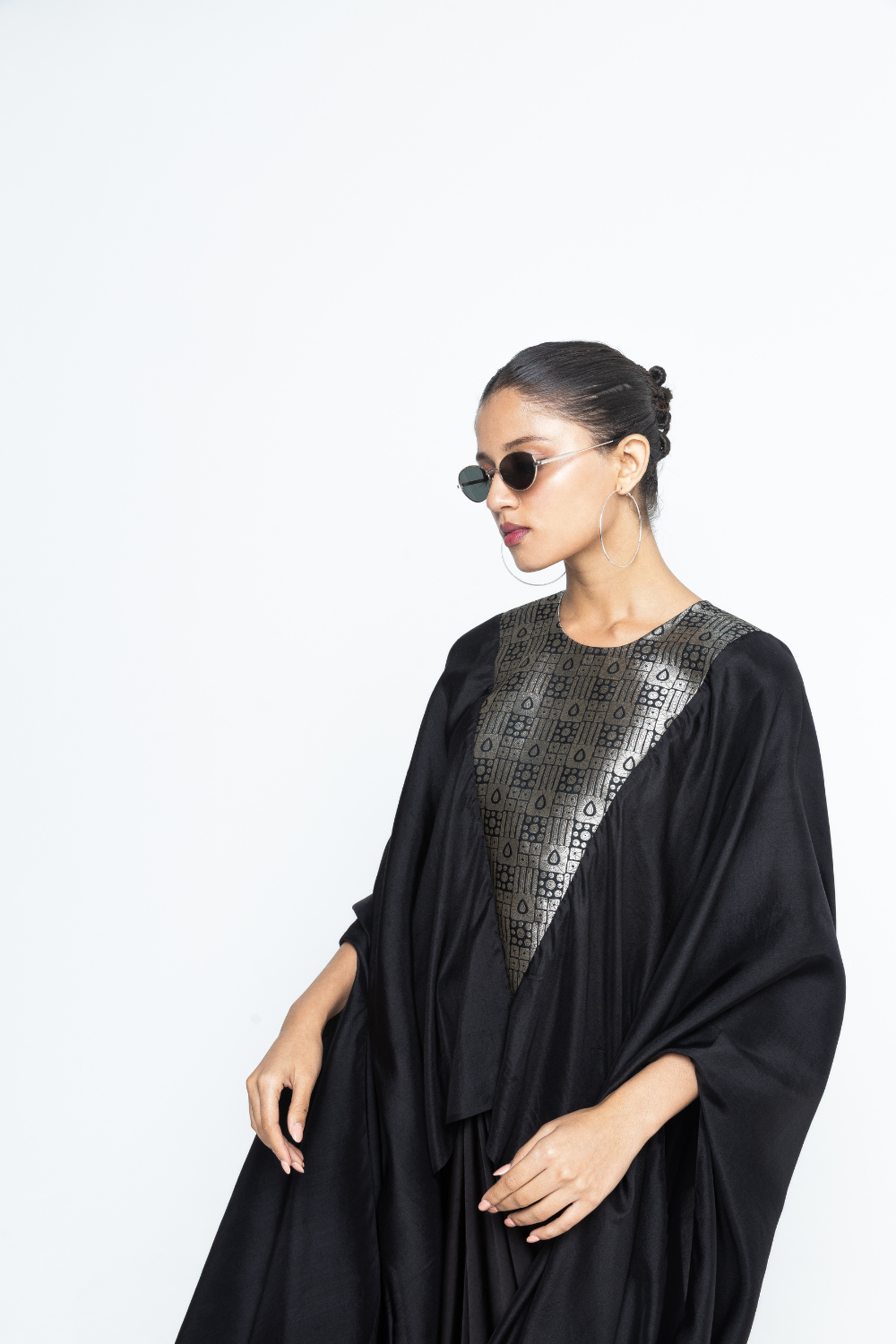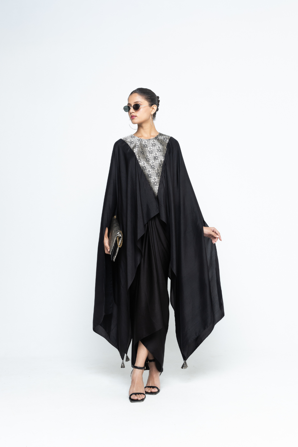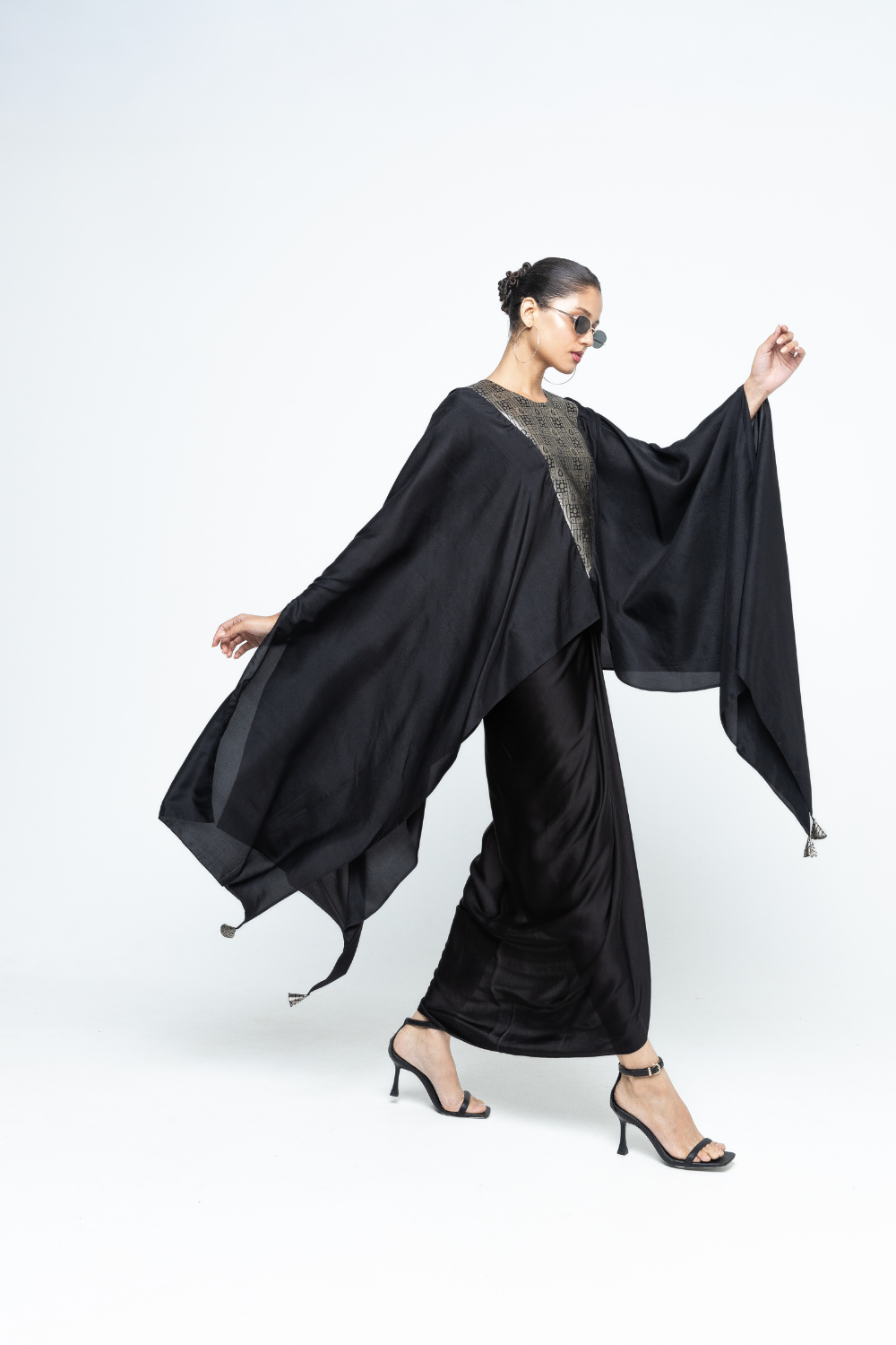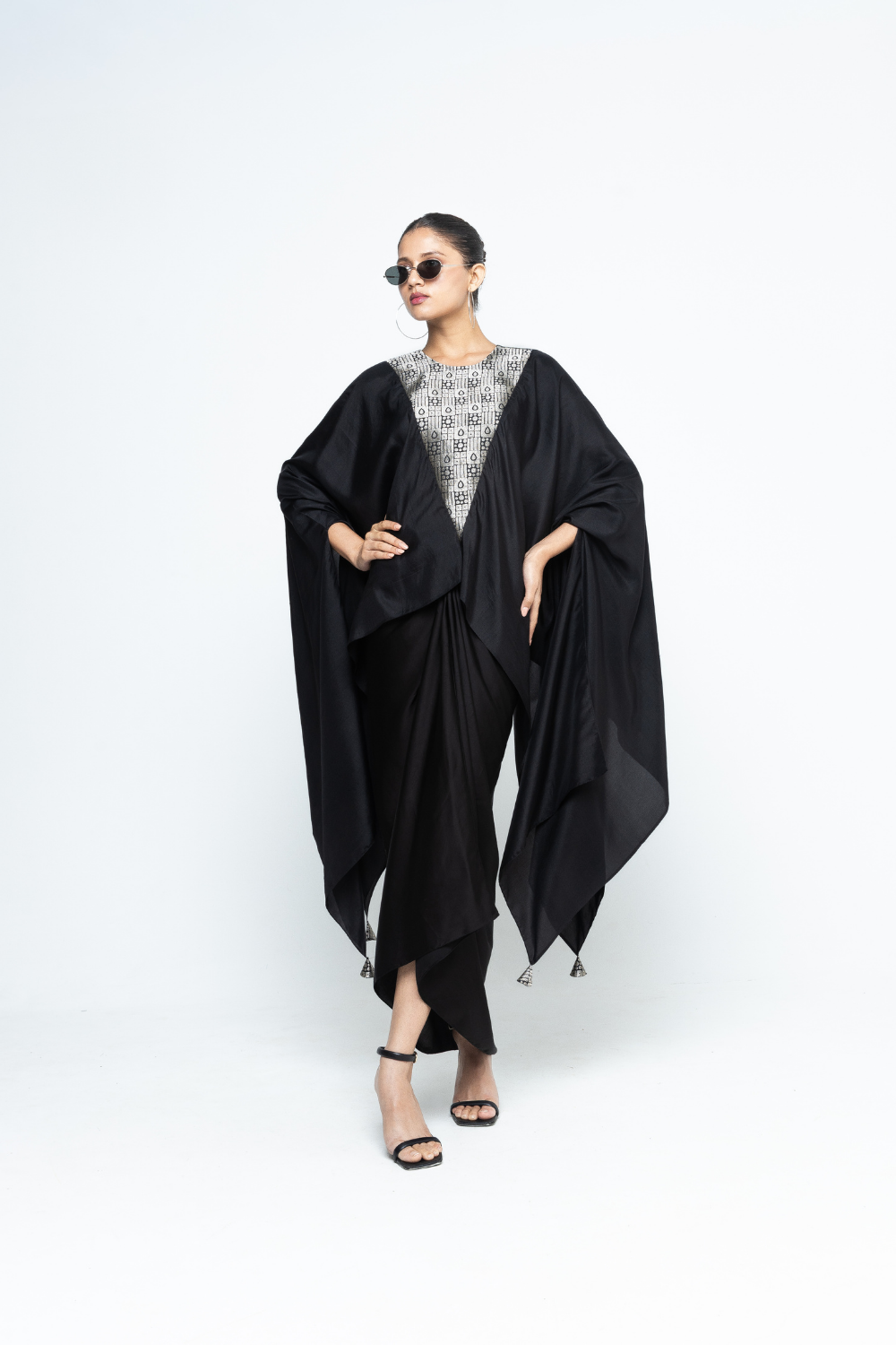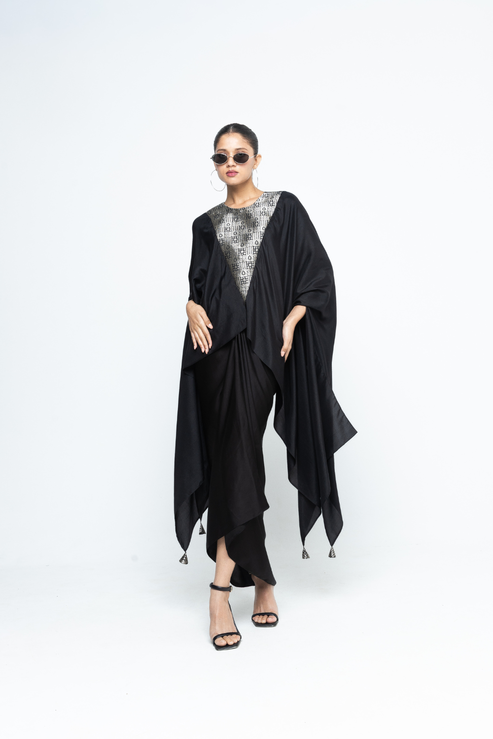Black Pure silk assymetrical cape with woven Brocade details on neck and back paired with twist detail assymetrical skirt