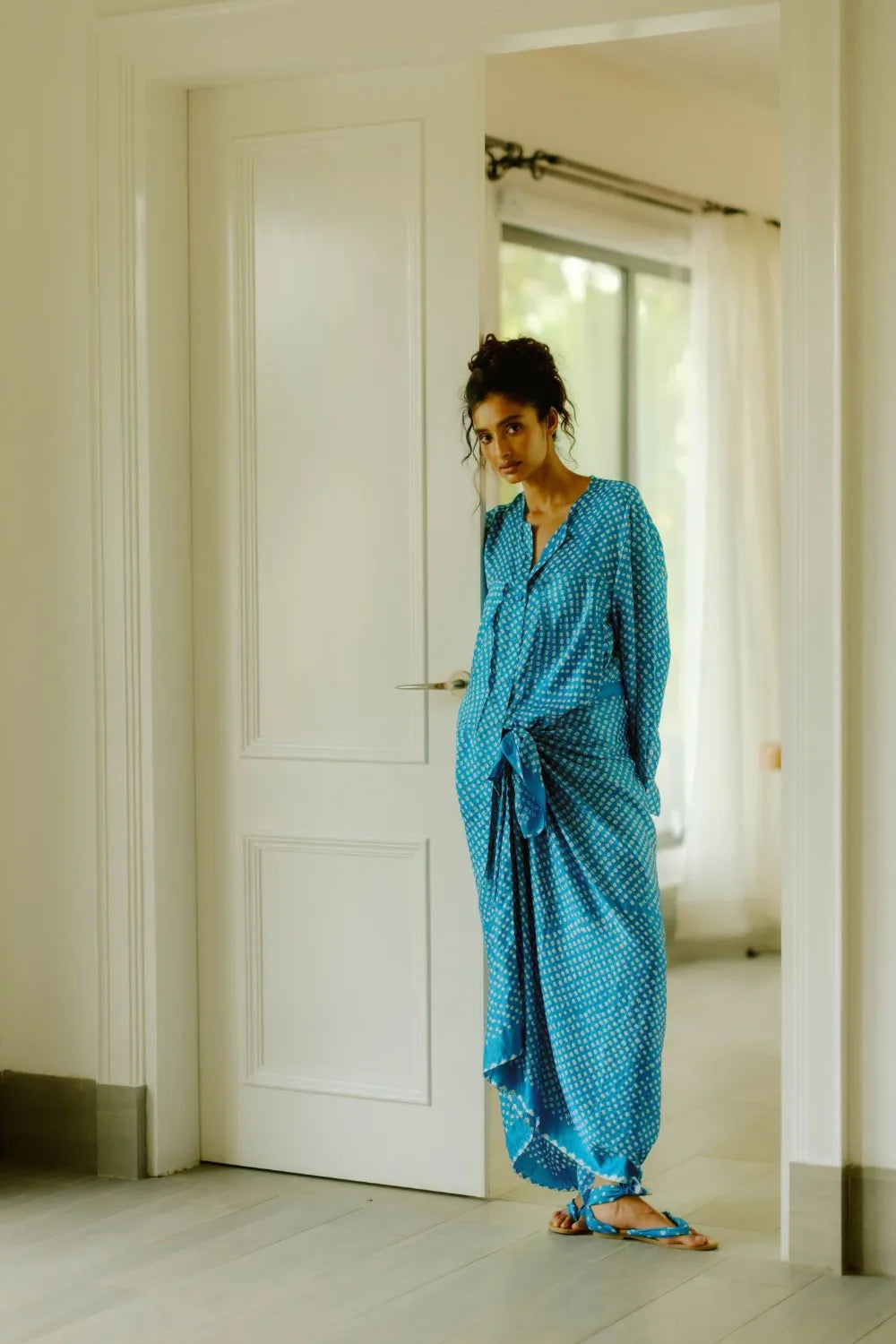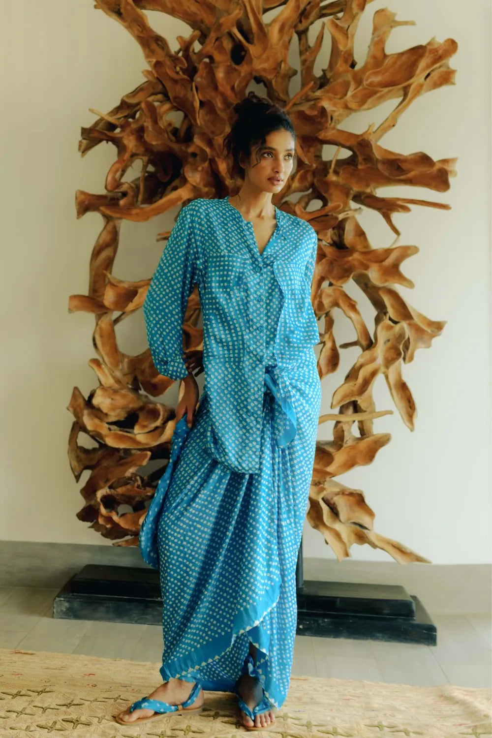 A timeless bandhani gaaji-silk style with an effortless drape, perfect for an elevated yet relaxed look.