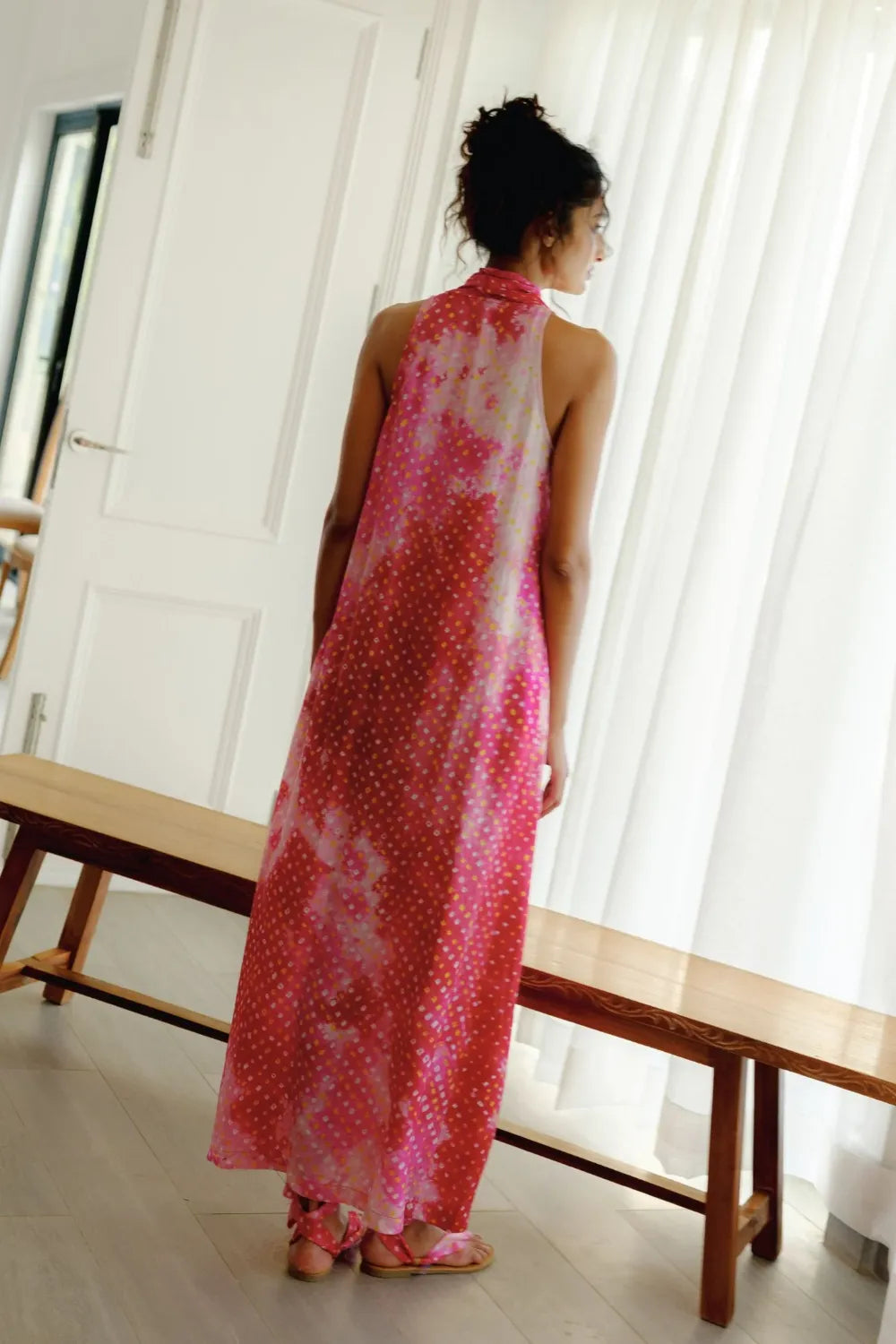 Crafted in shaded, traditionally tie-dyed bandhani gaji silk, this one-size dress features an adjustable plunge neckline and soft tie-up knots that define the waist with effortless ease.