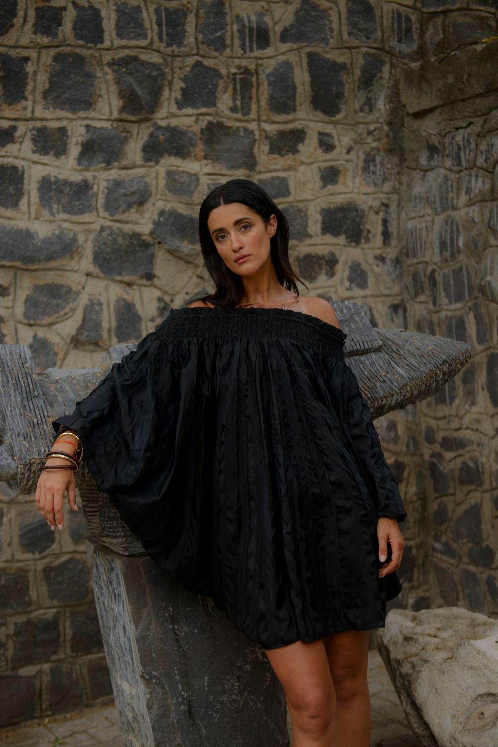 A voluminous off-shoulder dress crafted entirely in intricate appliqué, with smocked detailing along the neckline for structure and comfort. Effortlessly breezy and versatile, it can also be styled as a skirt; perfect for warm evenings or elevated daywear.