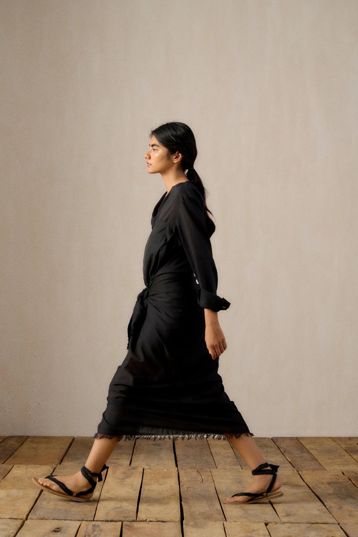 Sarong-style shirt dress with fabric button details and waist tie extensions
