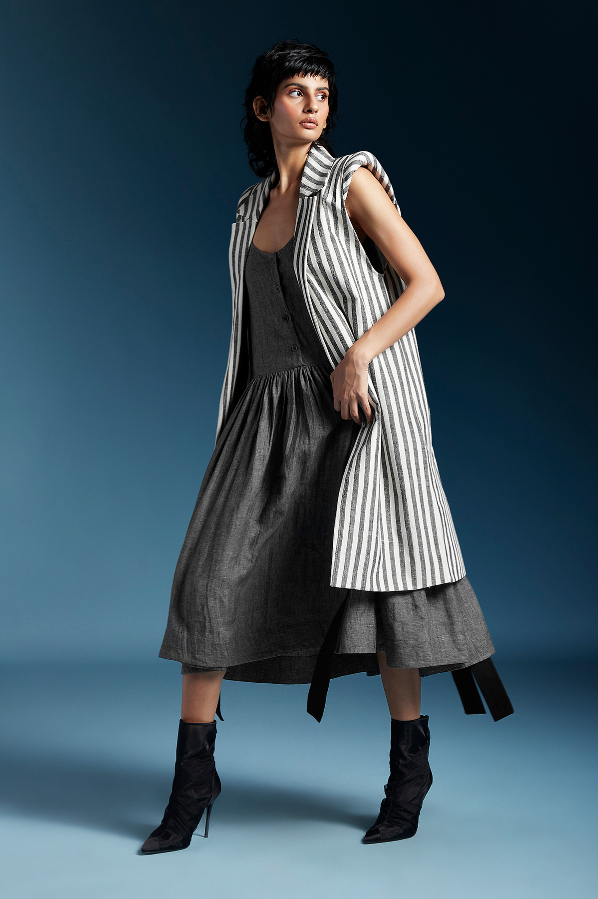 Chola’s universe begins with thoughtful materials. Recycled cottons, post-consumer fabrics, and free-cutting techniques come together in a kind of mindful choreography—one that honours form without creating waste, and prioritises movement over rigidity. This is clothing that feels lived-in yet architectural; pared-back yet quietly avant-garde.