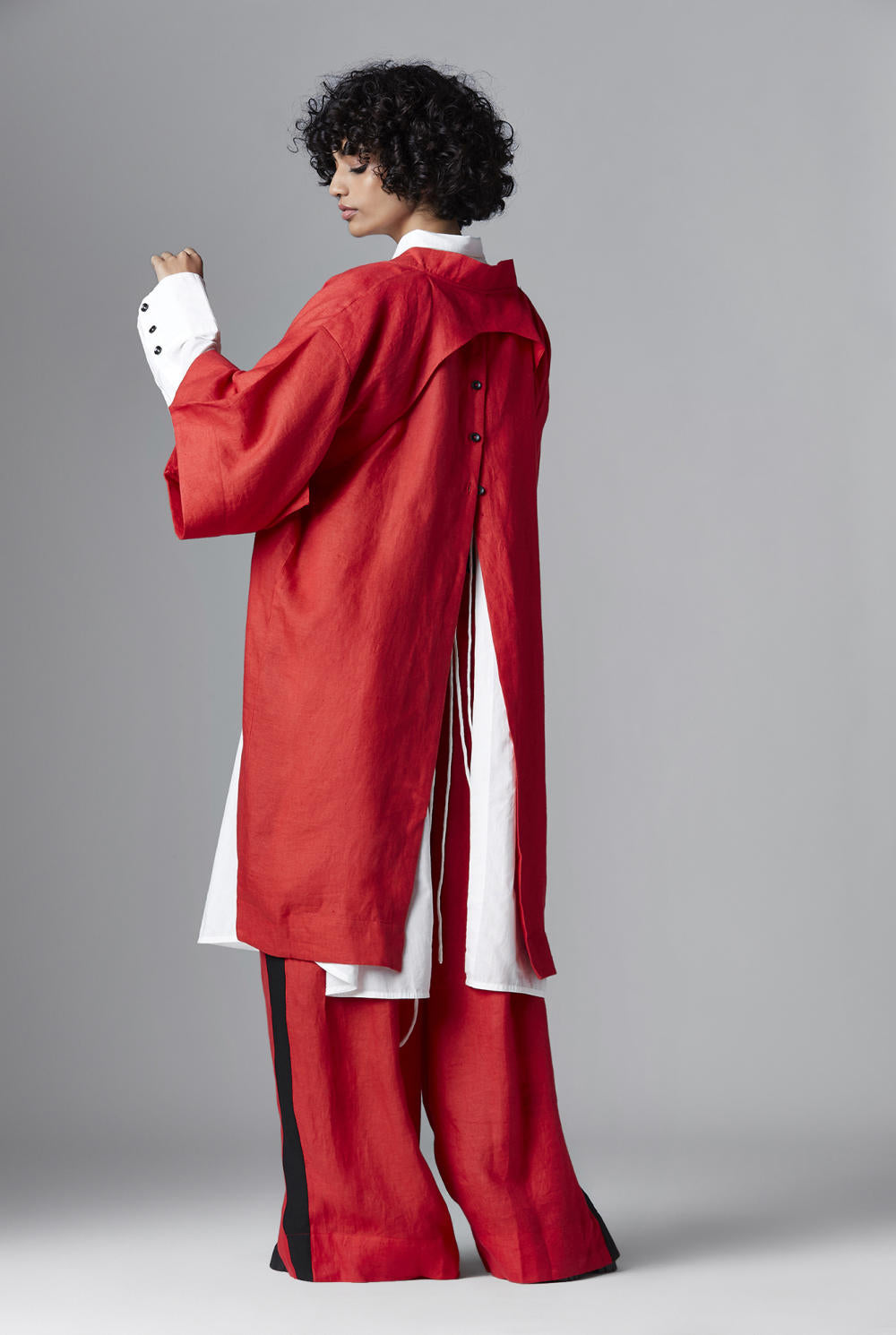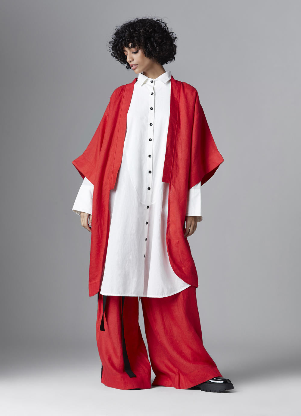 Chola’s universe begins with thoughtful materials. Recycled cottons, post-consumer fabrics, and free-cutting techniques come together in a kind of mindful choreography—one that honours form without creating waste, and prioritises movement over rigidity. This is clothing that feels lived-in yet architectural; pared-back yet quietly avant-garde.