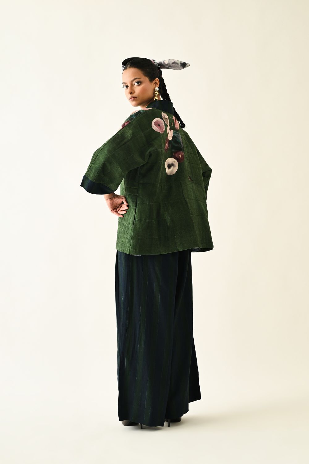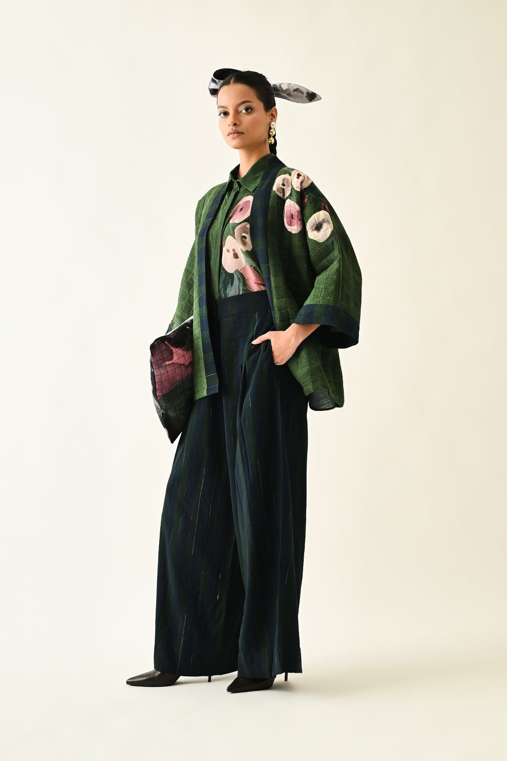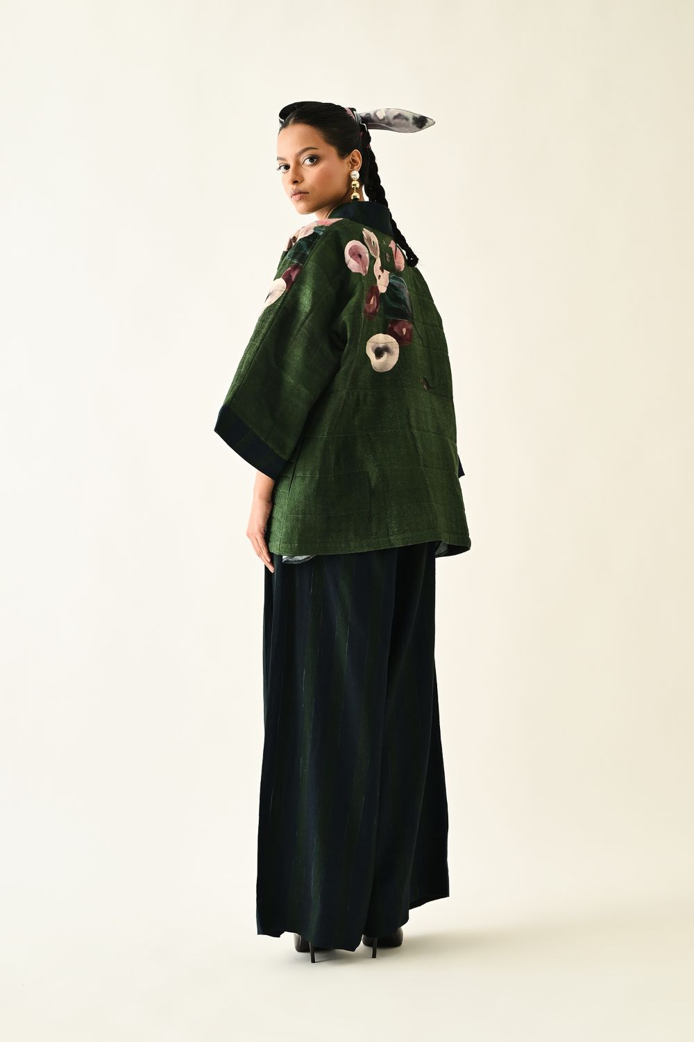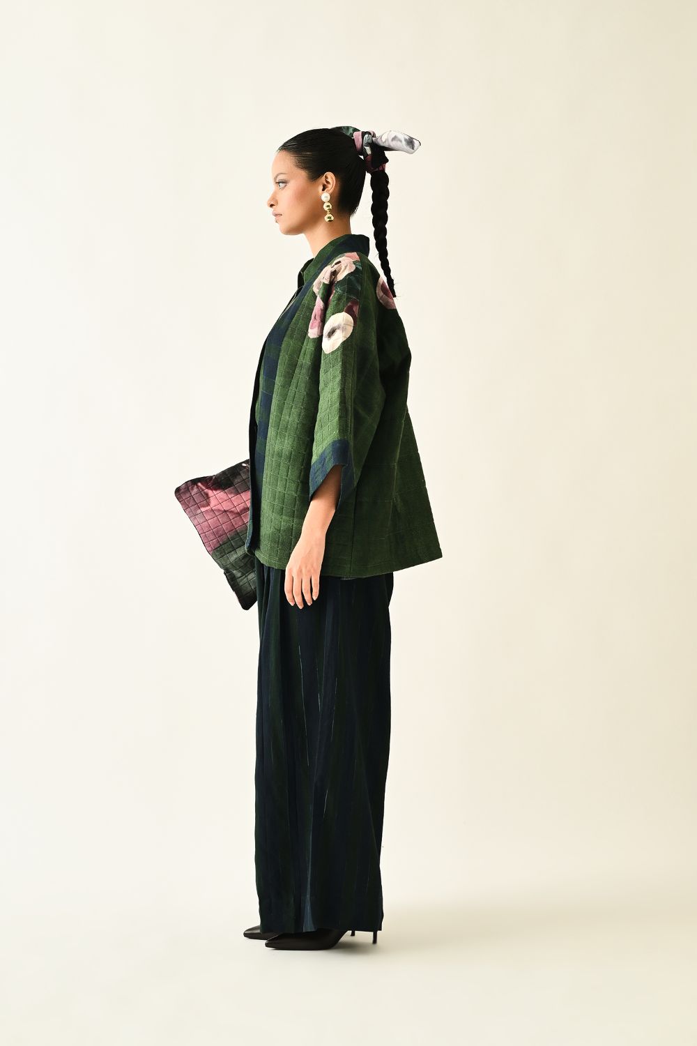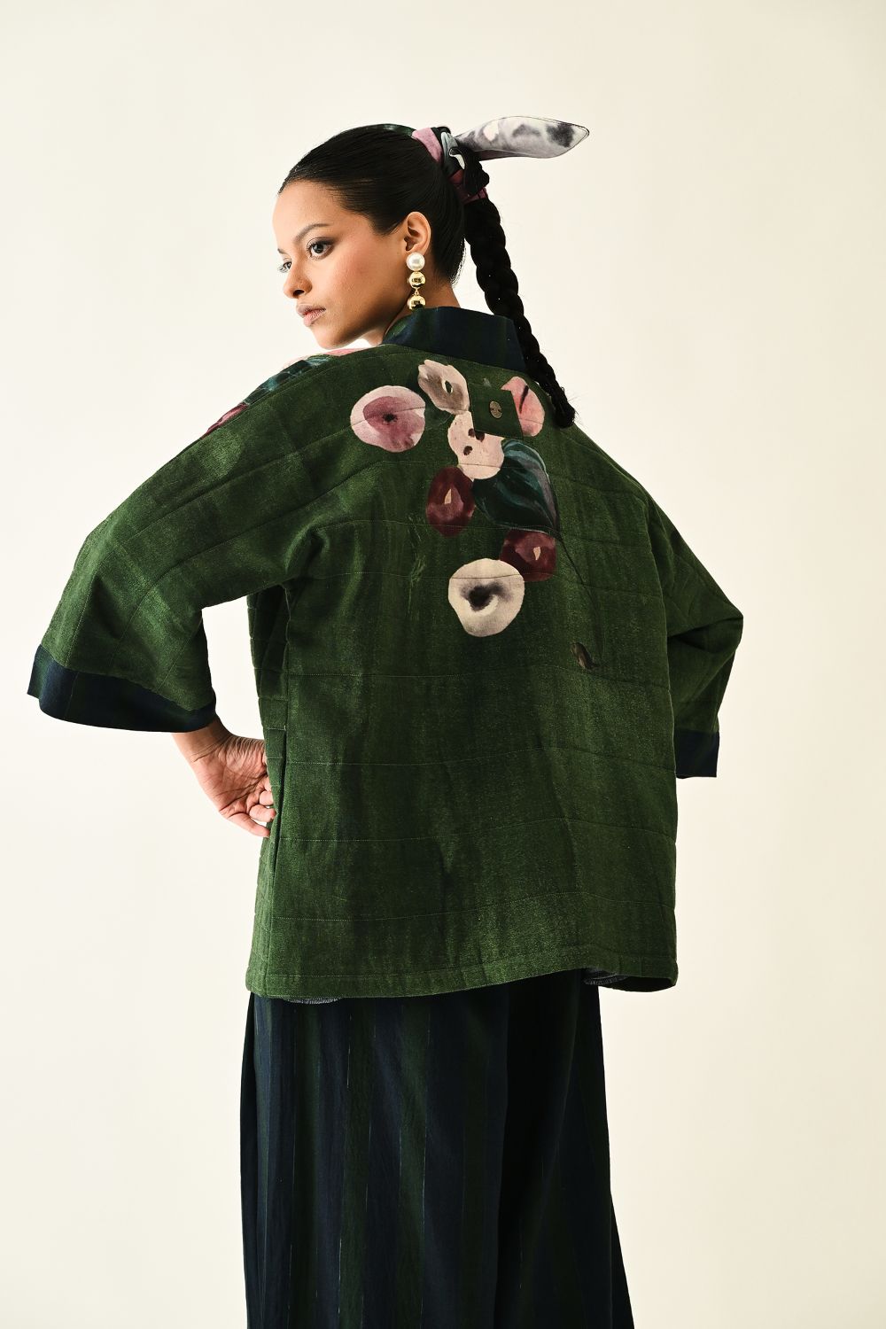 Jacket: A handcrafted quilted jacket featuring a vibrant floral hand-painted pattern on a textured grid base. Designed with a relaxed, open-front silhouette and a contrasting striped lapel.