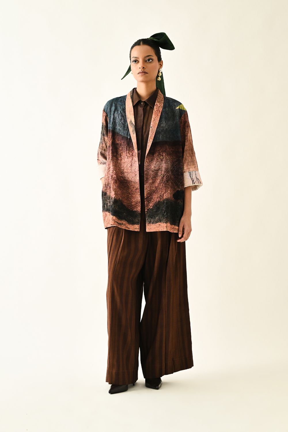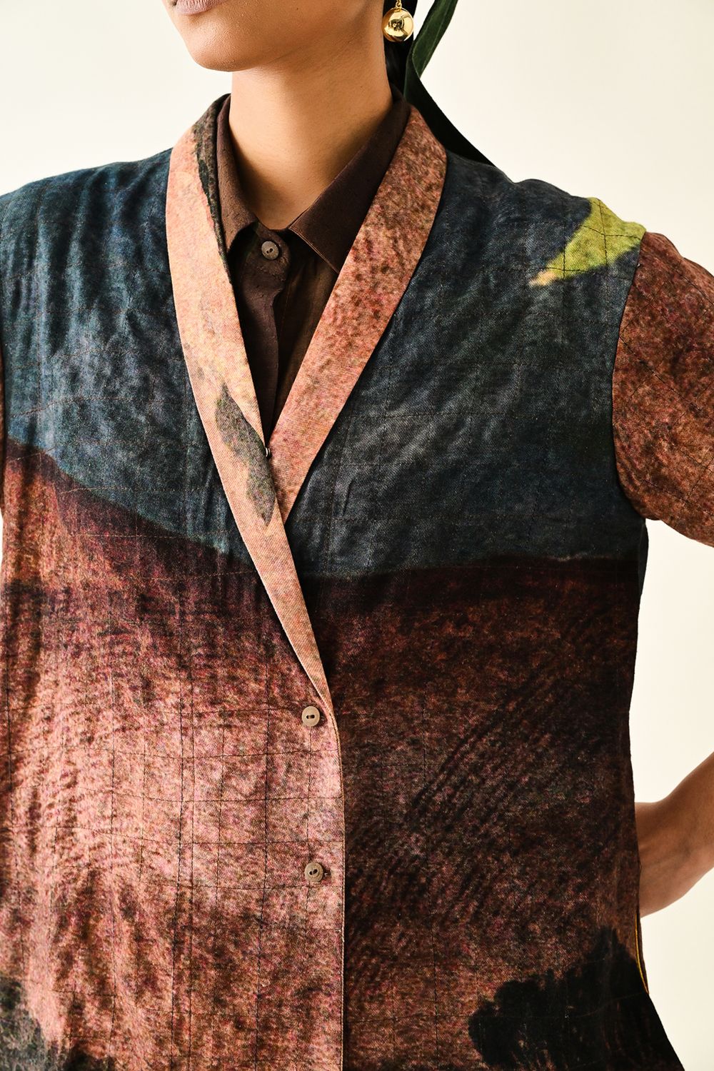 Jacket: Anti-fit jacket shirt is hand-painted abstract expressionist print, digitally transferred. The quilted shirt features a shawl collar, Kimono sleeves. Signature OFR lune embroidery at back. Print placements will varysingle piece. Model is wearing - XS/S