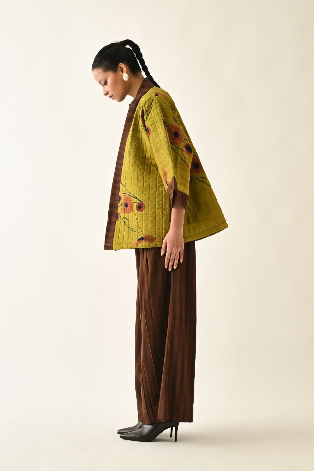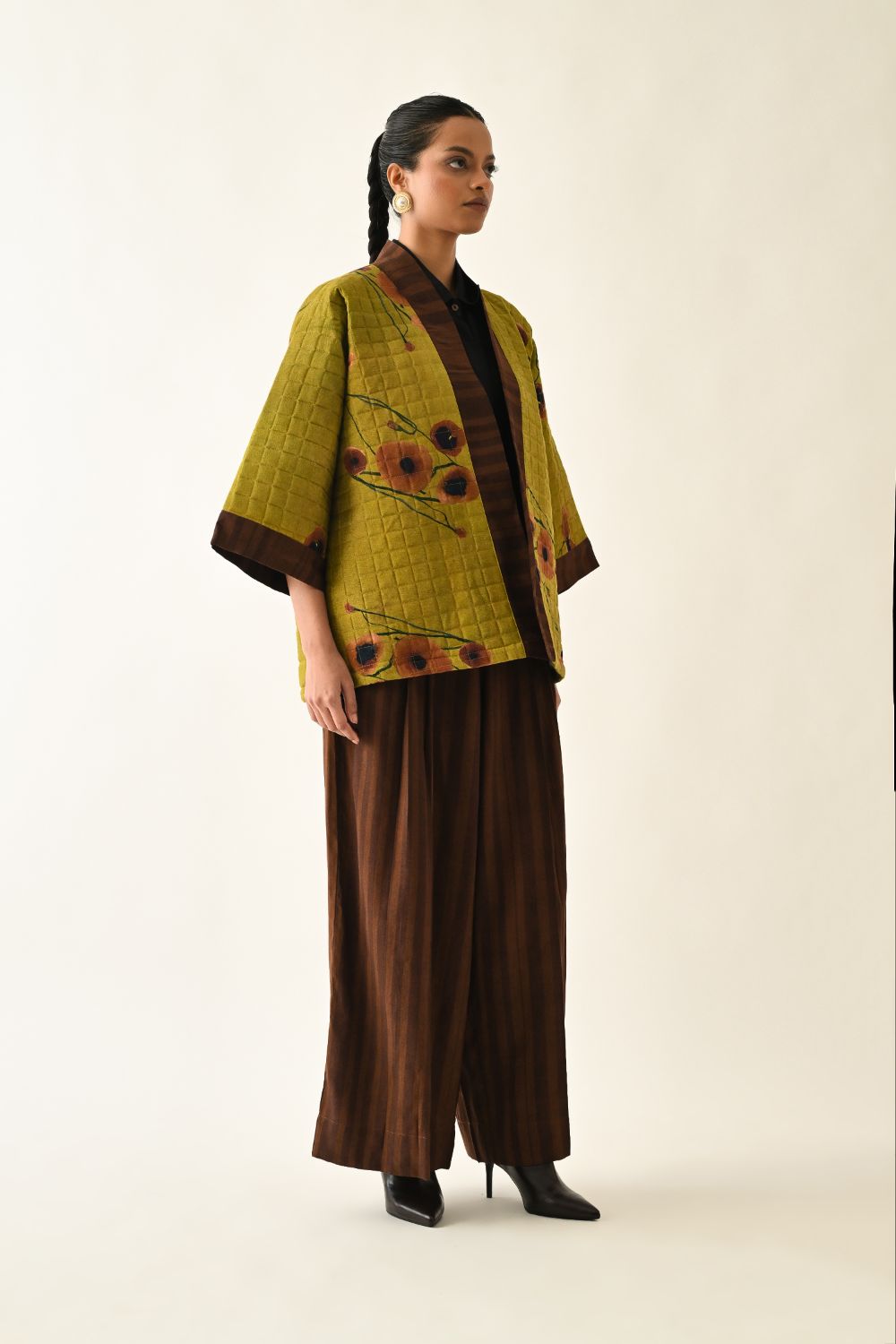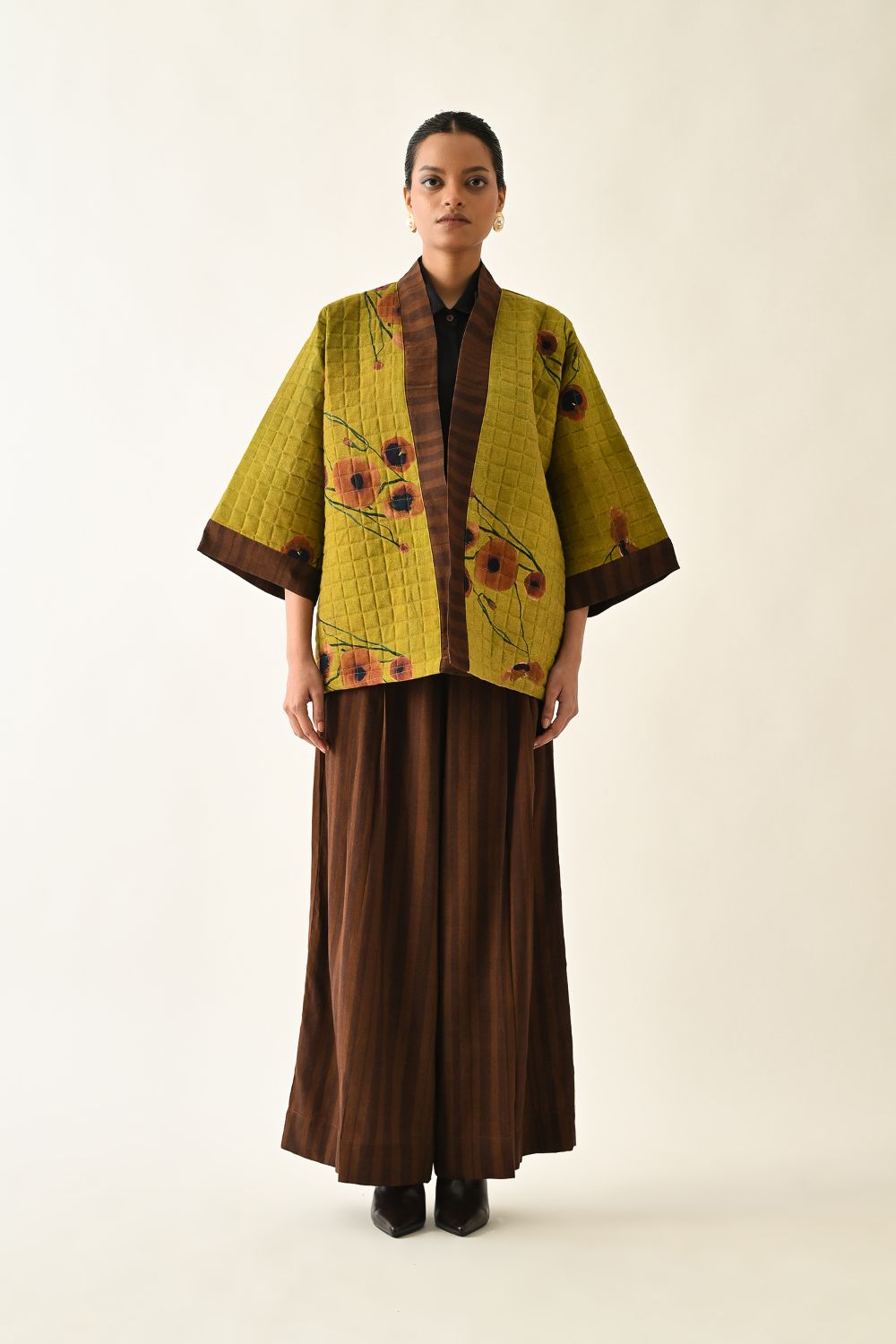 Jacket: A handcrafted quilted jacket featuring a vibrant floral hand-painted pattern on a textured grid base. Designed with a relaxed, open-front silhouette and a contrasting striped lapel.