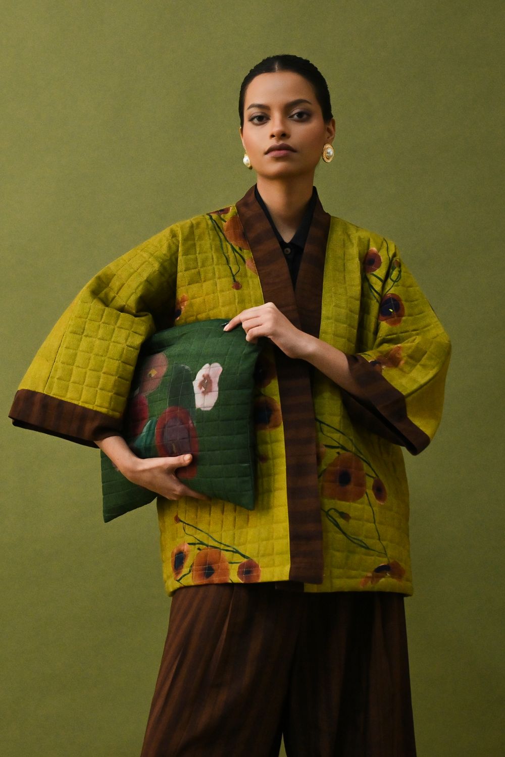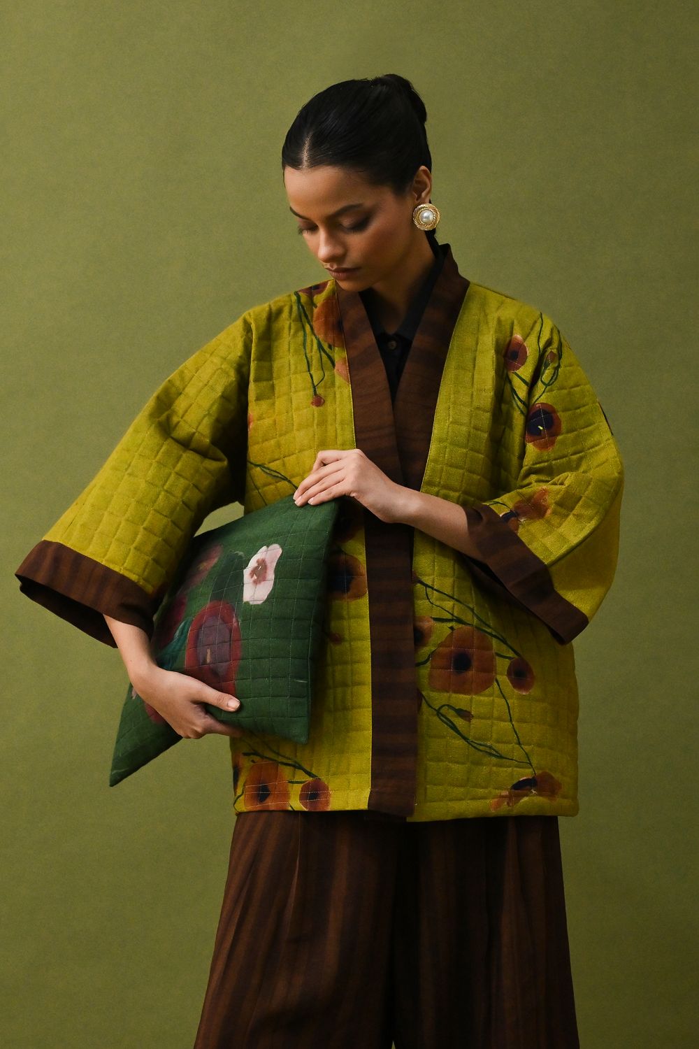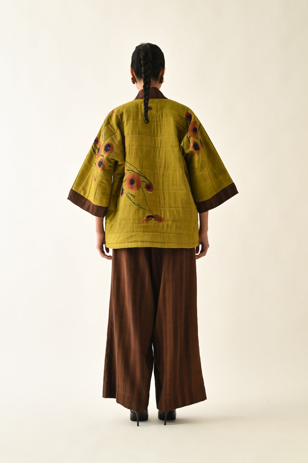 Jacket: A handcrafted quilted jacket featuring a vibrant floral hand-painted pattern on a textured grid base. Designed with a relaxed, open-front silhouette and a contrasting striped lapel.