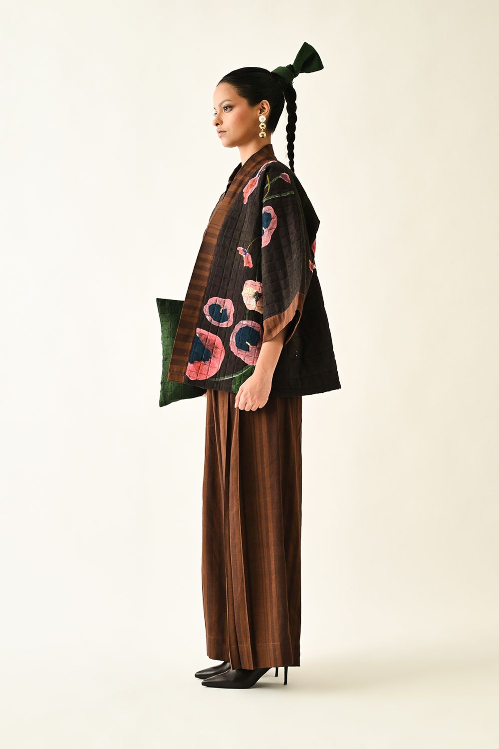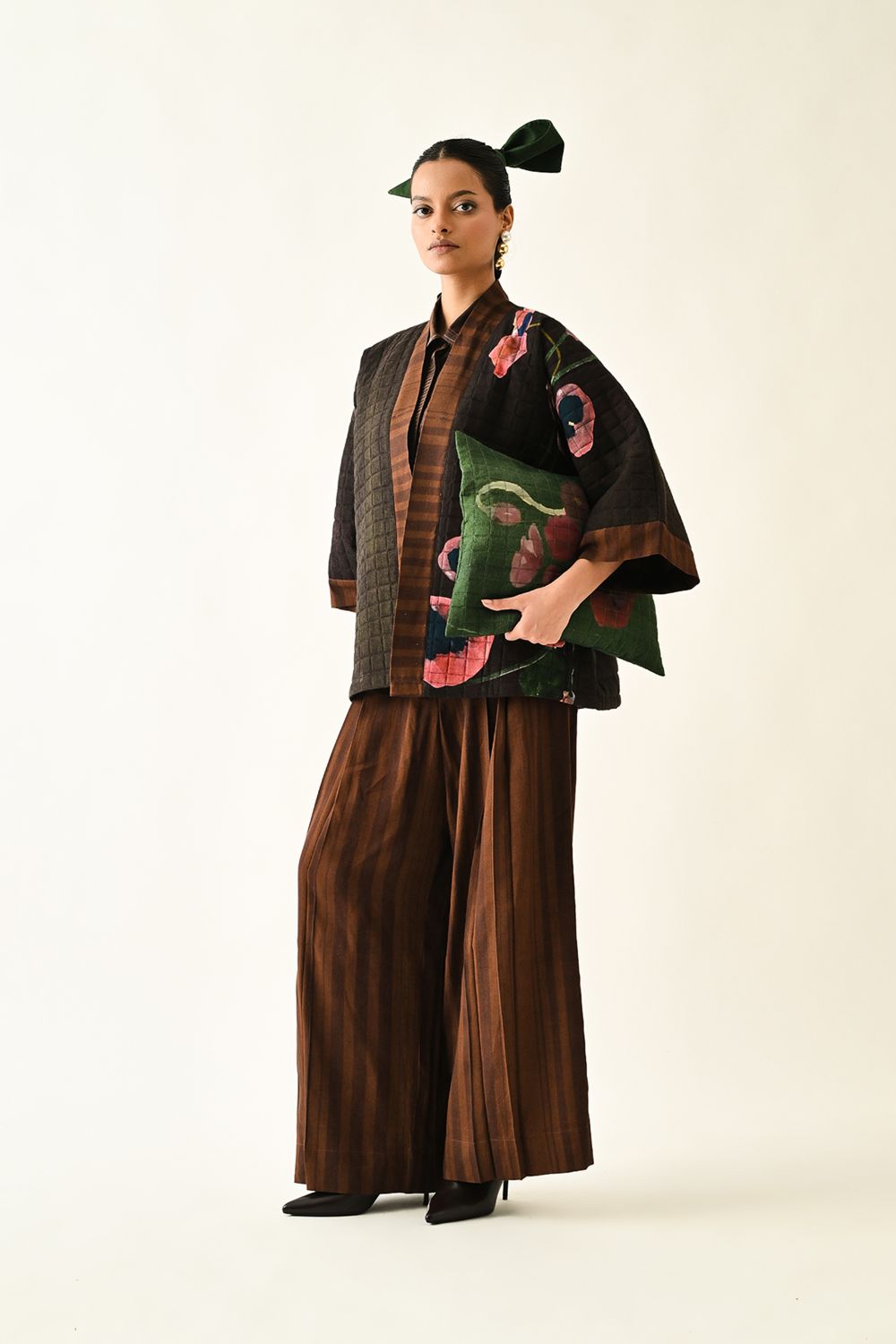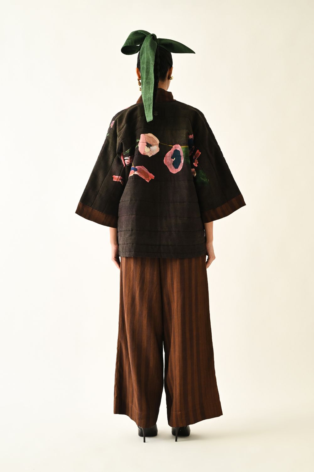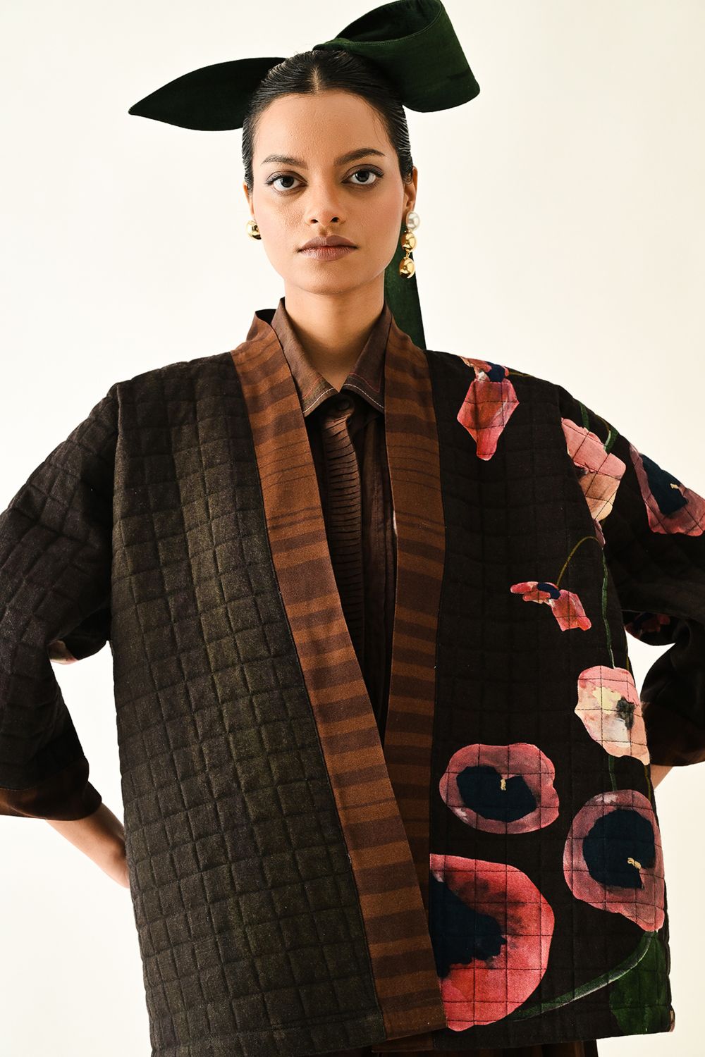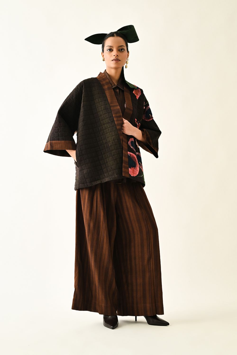 Jacket: A handcrafted quilted jacket featuring a vibrant floral hand-painted pattern on a textured grid base. Designed with a relaxed, open-front silhouette and a contrasting striped lapel.