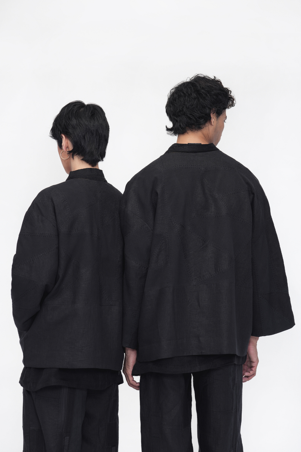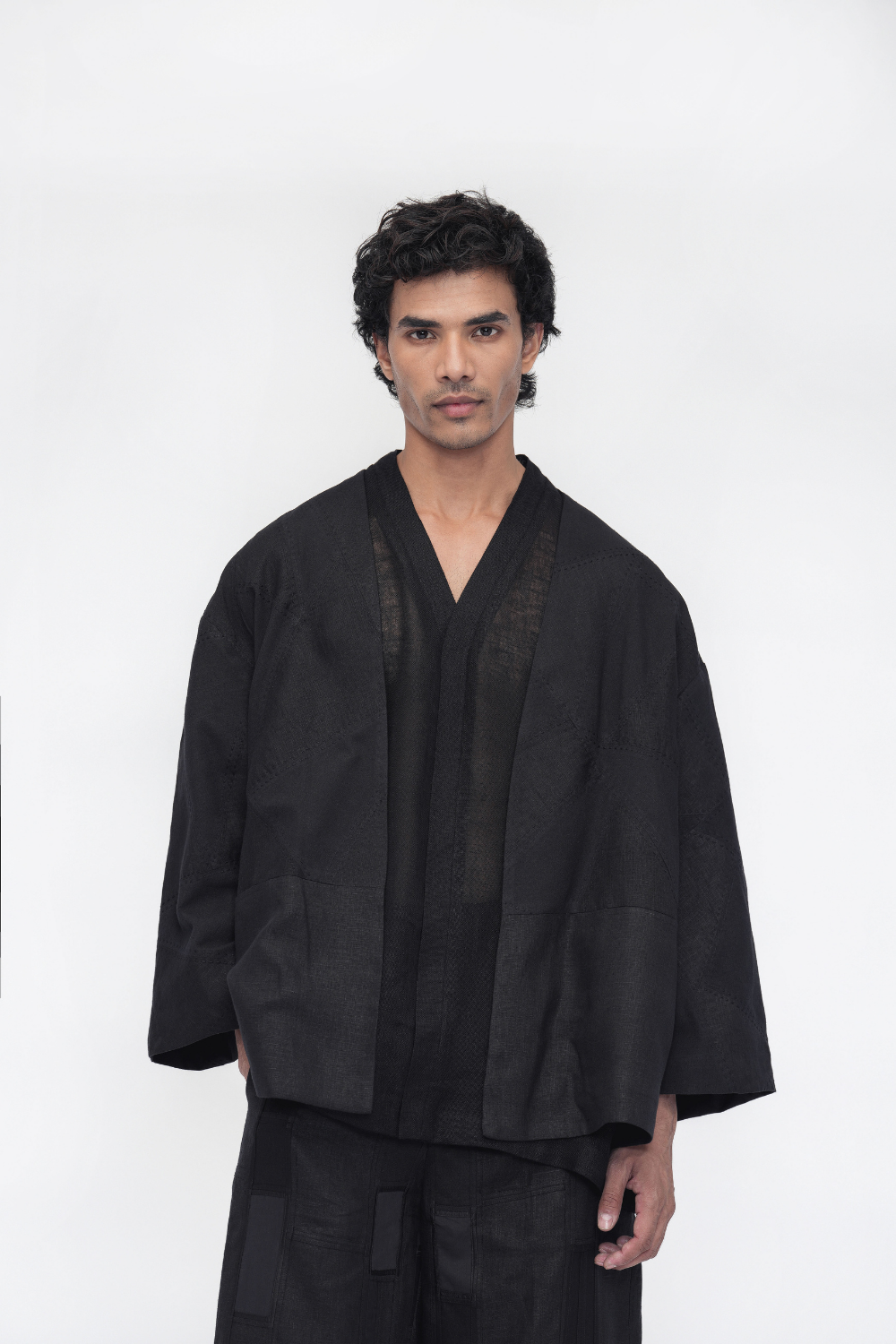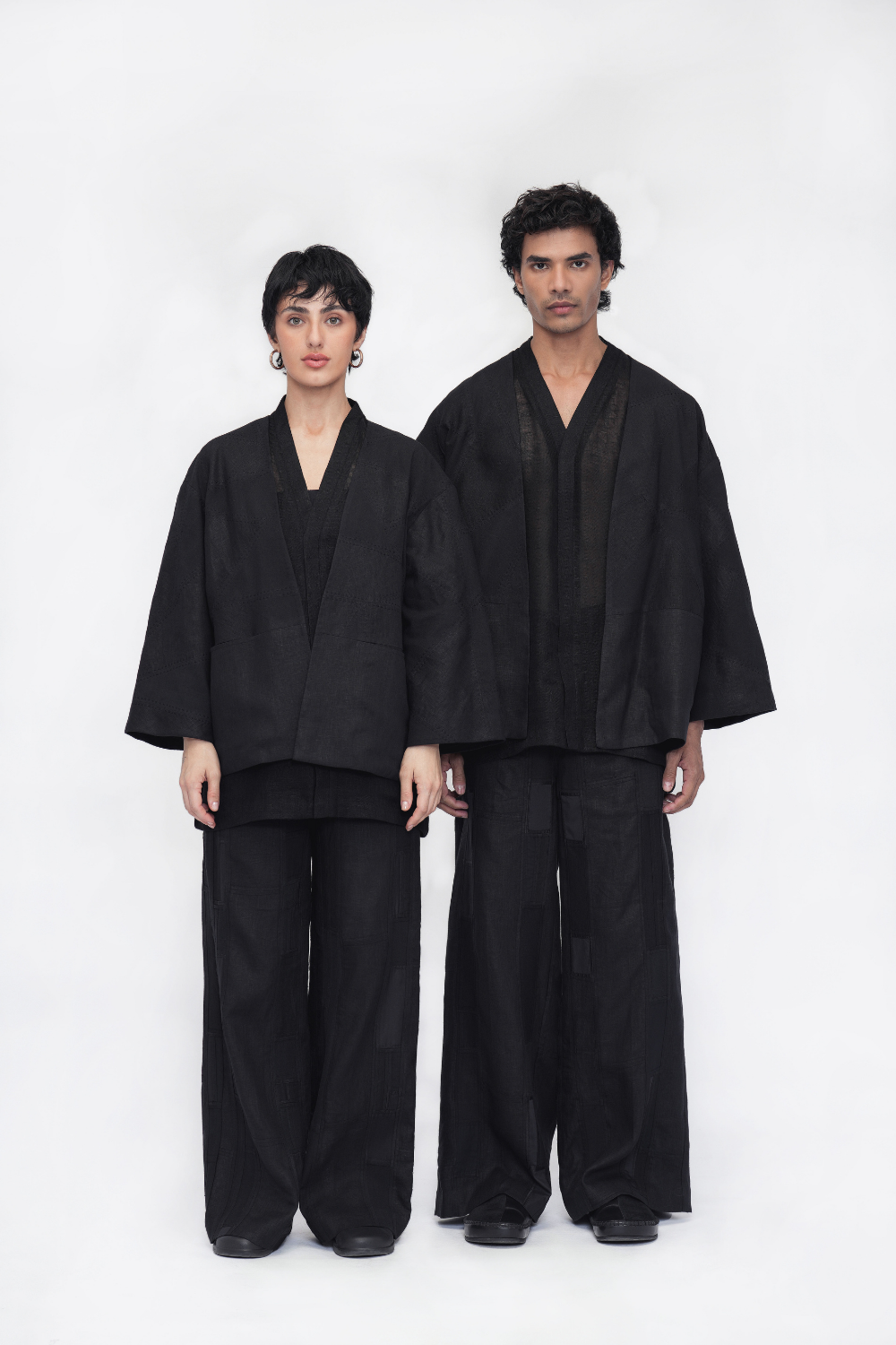 An oversized, fully lined unisex overlay crafted in a patchwork of linen and handloom cotton, elevated with intricate kantha embroidery. Designed with a front opening, drop shoulders, three-quarter sleeves, and welt pockets—an ode to comfort and craft. Overlay Comes in Size: ONE (2XS,XS,S), TWO (M,L,XL), THREE (2XL,3XL,4XL)