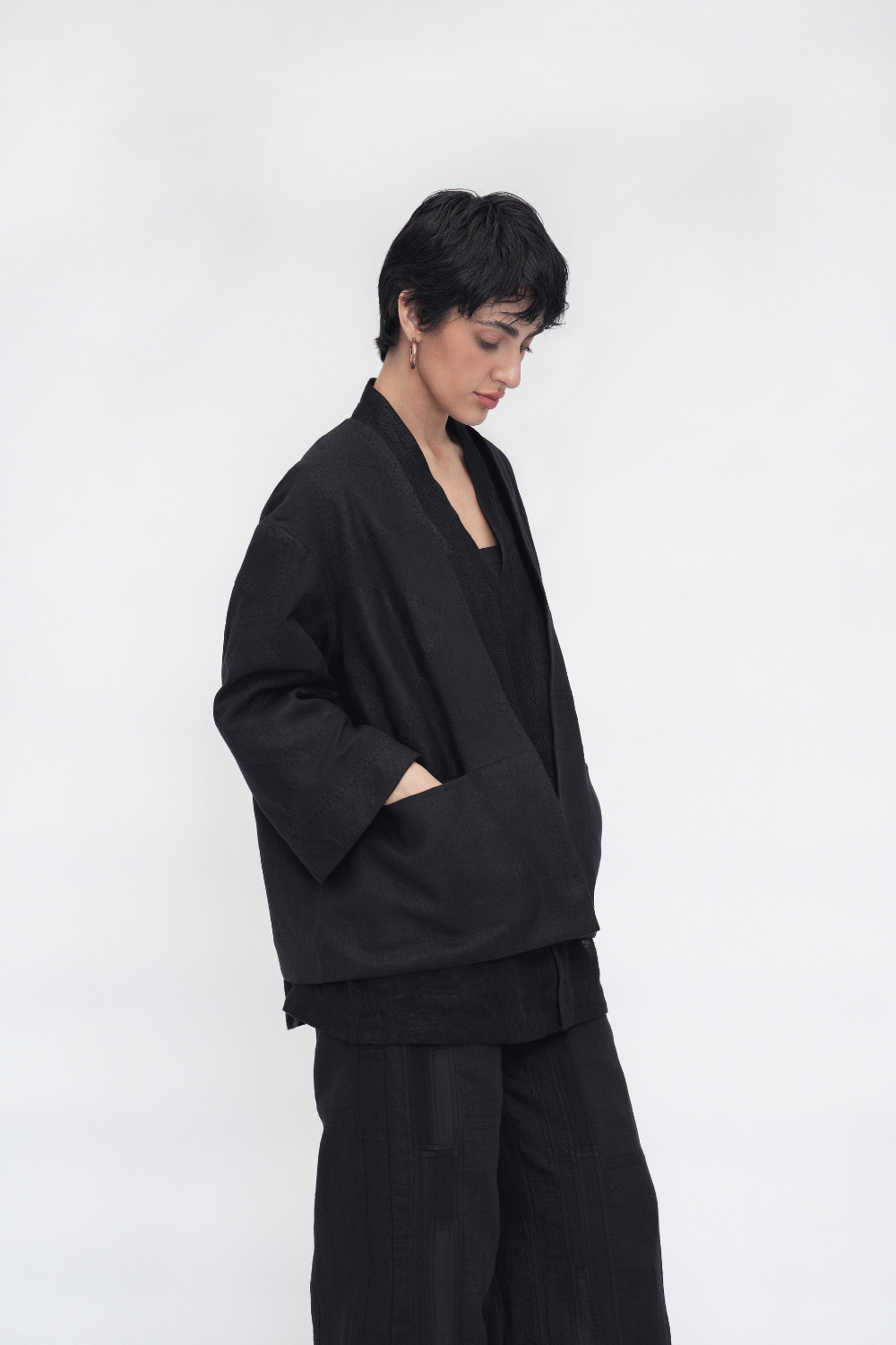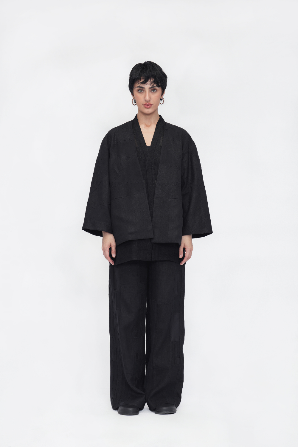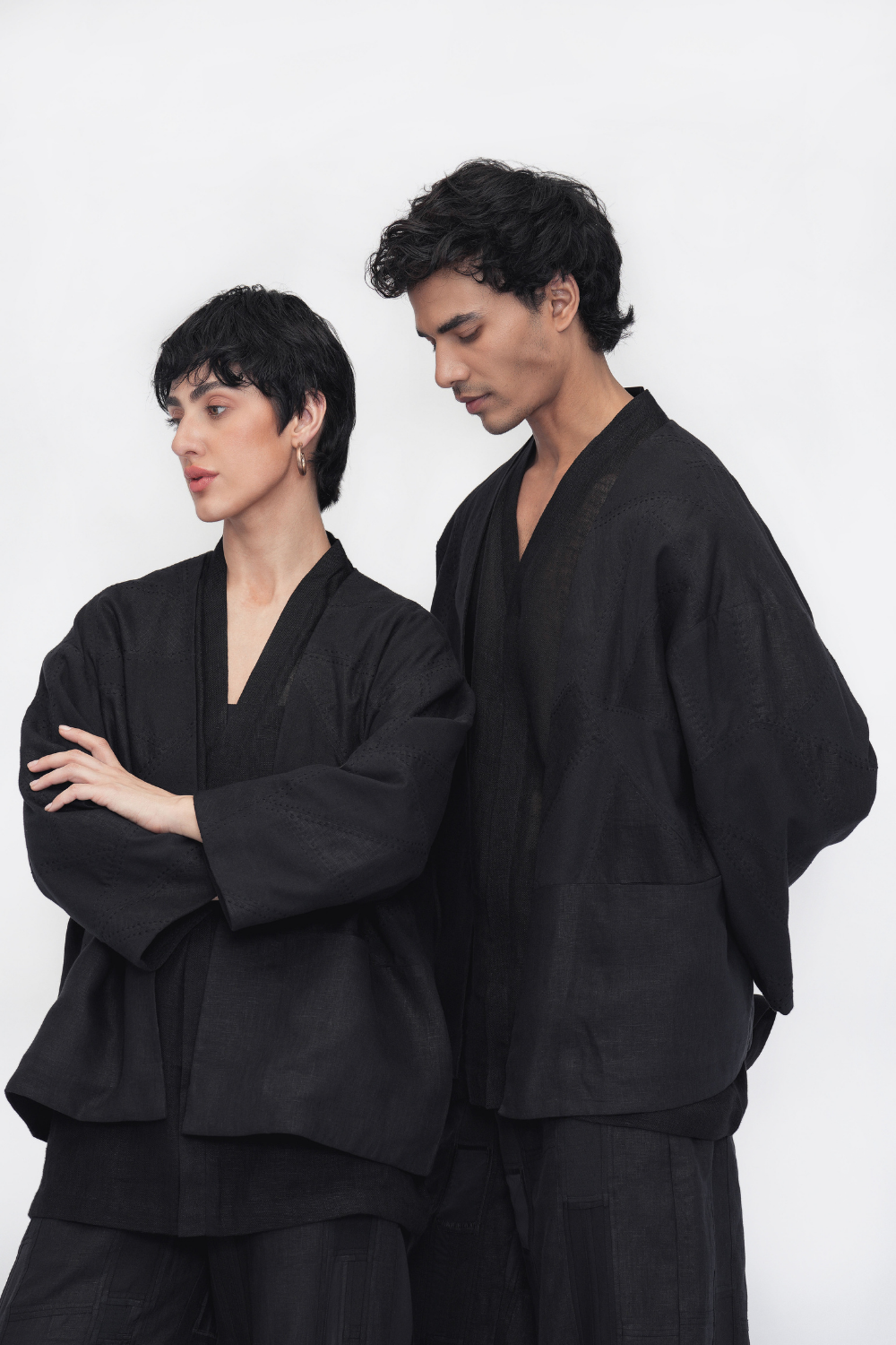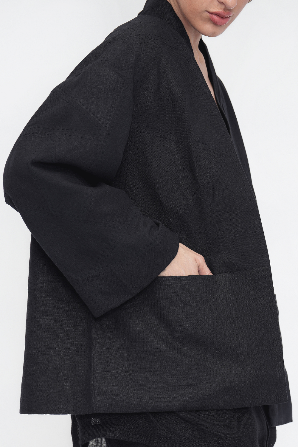An oversized, fully lined unisex overlay crafted in a patchwork of linen and handloom cotton, elevated with intricate kantha embroidery. Designed with a front opening, drop shoulders, three-quarter sleeves, and welt pockets—an ode to comfort and craft. Overlay Comes in Size: ONE (2XS,XS,S), TWO (M,L,XL), THREE (2XL,3XL,4XL)