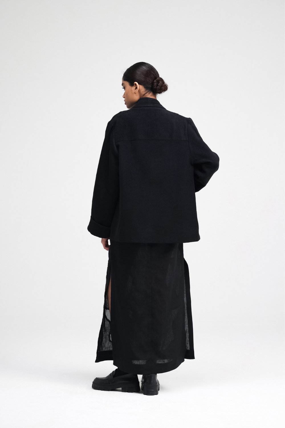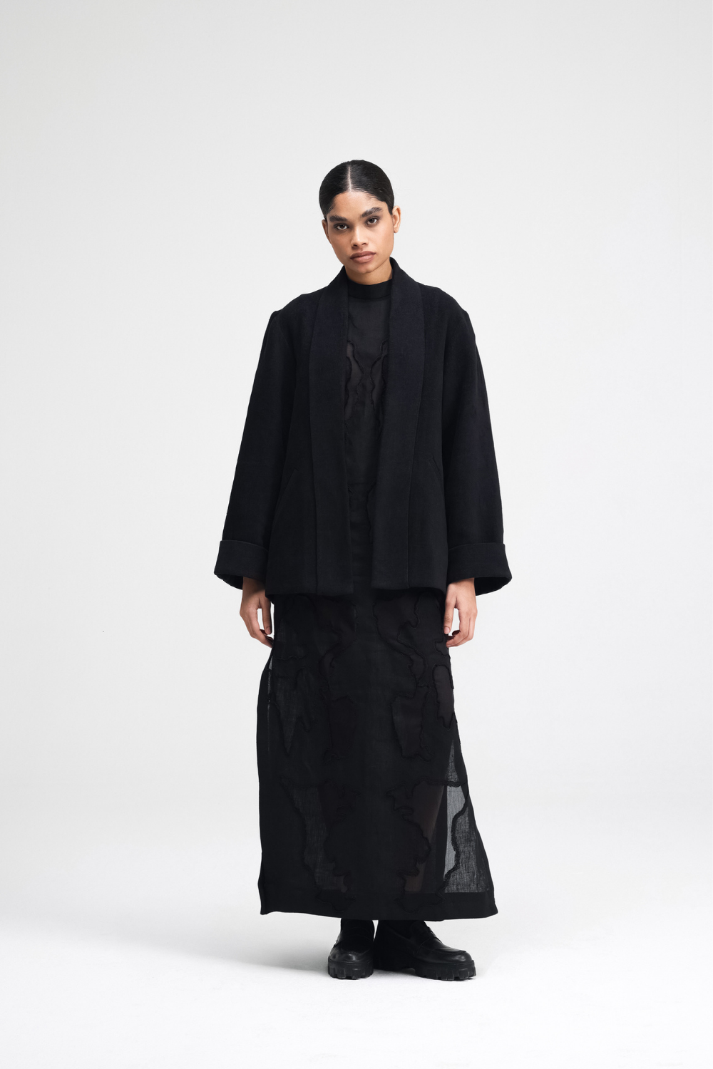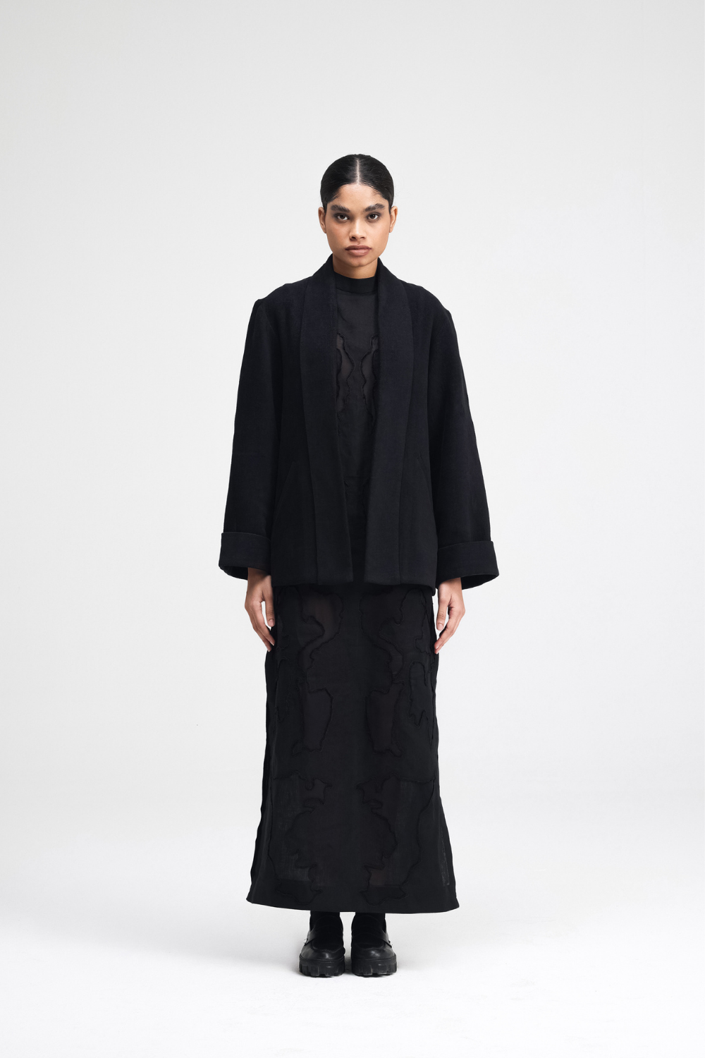 An oversized shawl collar jacket crafted from plush chenille. It comes with a front opening and full sleeves, accented by fold-over cuffs and front welt pockets. This versatile piece is a great layering option.