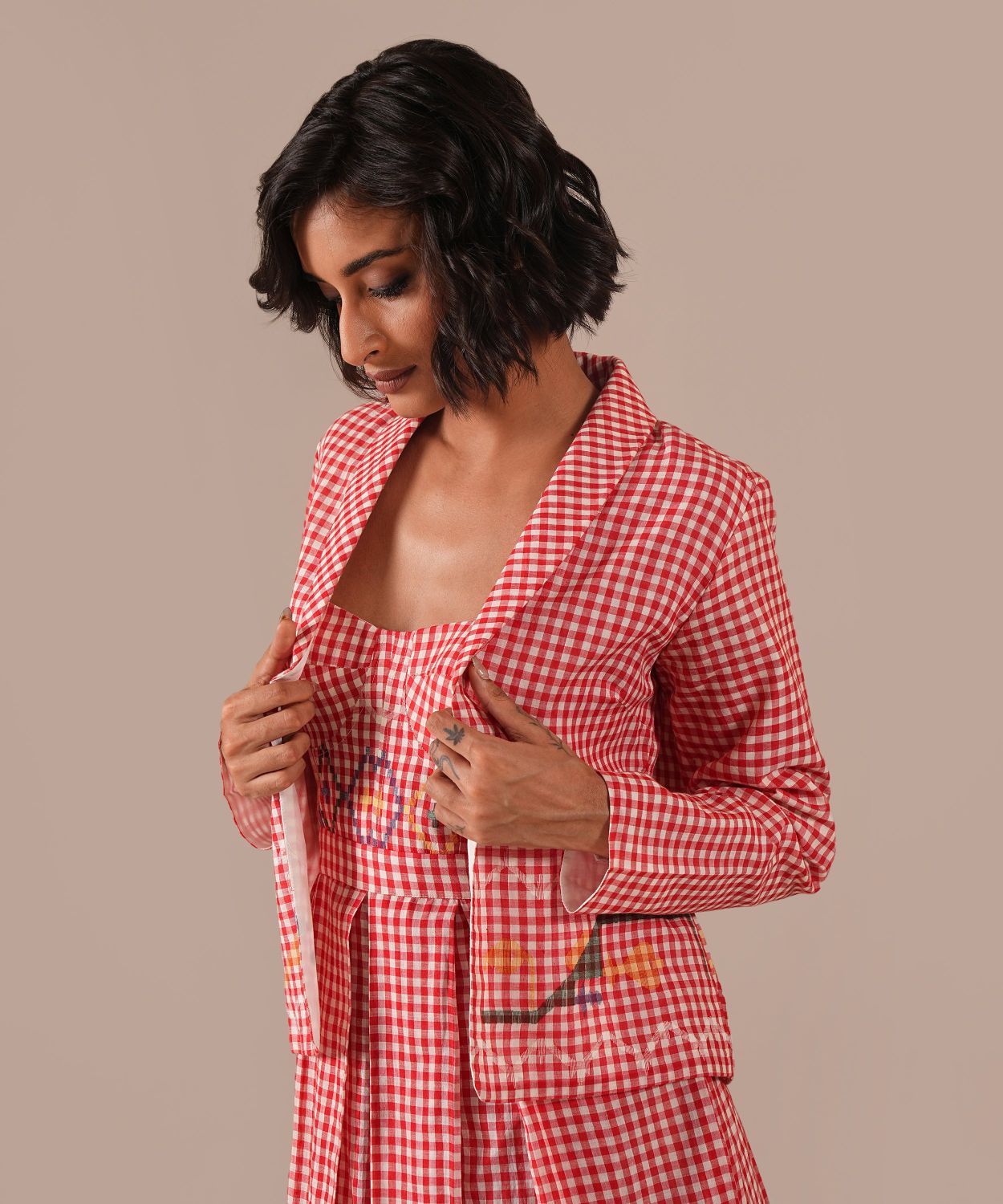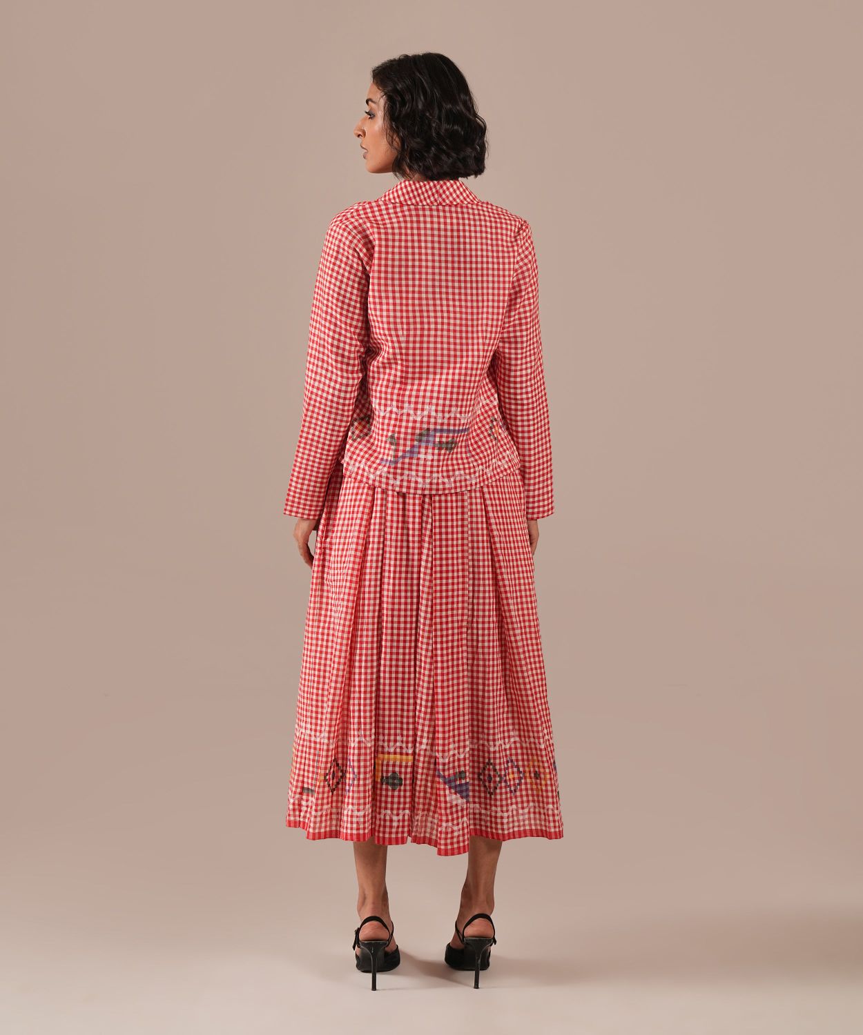 Discover our Jamdani Bralette Dress paired with a tailored co-ord jacket, meticulously handwoven by skilled artisans. Featuring elegant box pleats, functional side pockets, and adjustable straps for a perfect fit, this ensemble effortlessly combines traditional craftsmanship with contemporary style, offering versatile, timeless elegance for any wardrobe.
