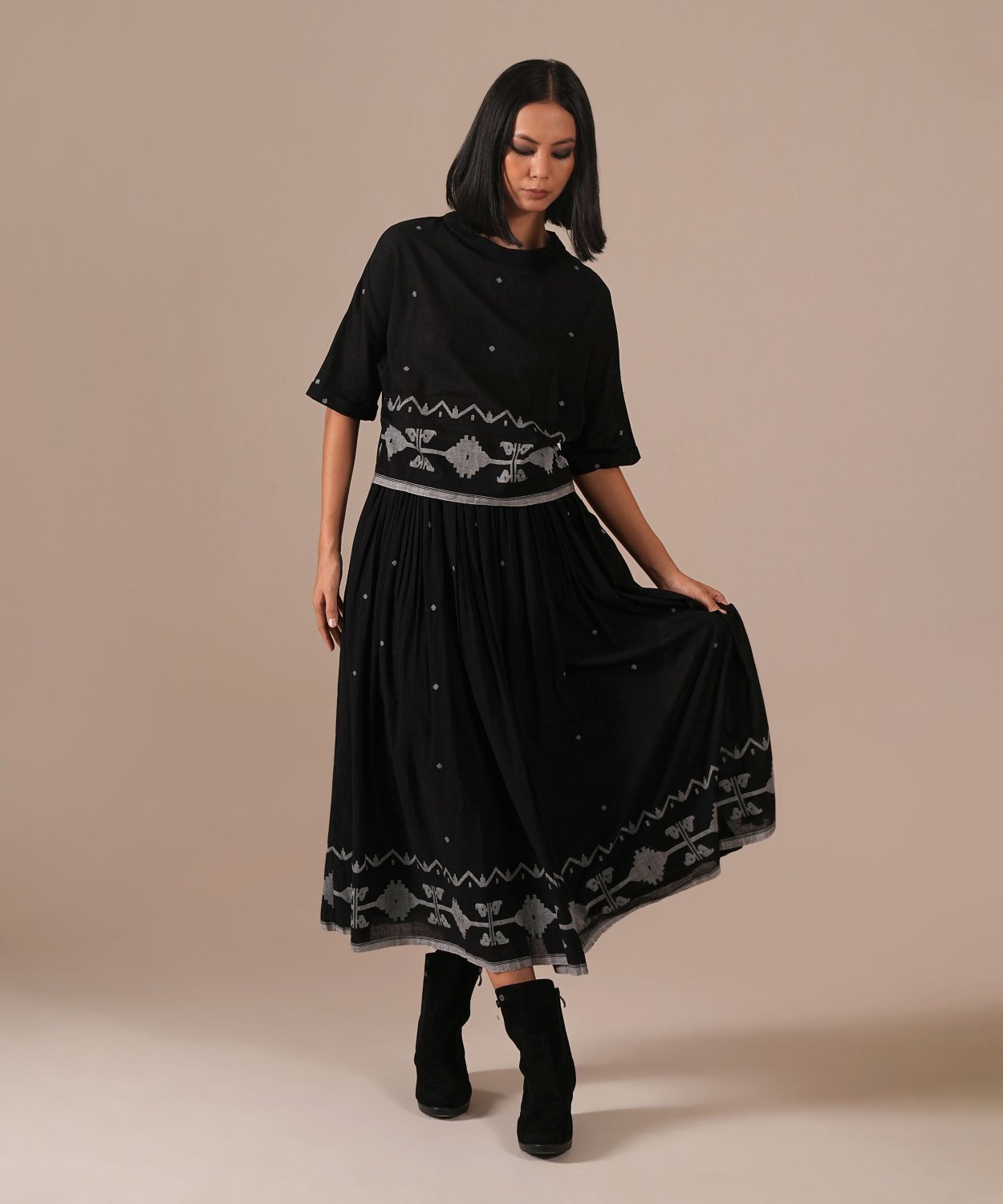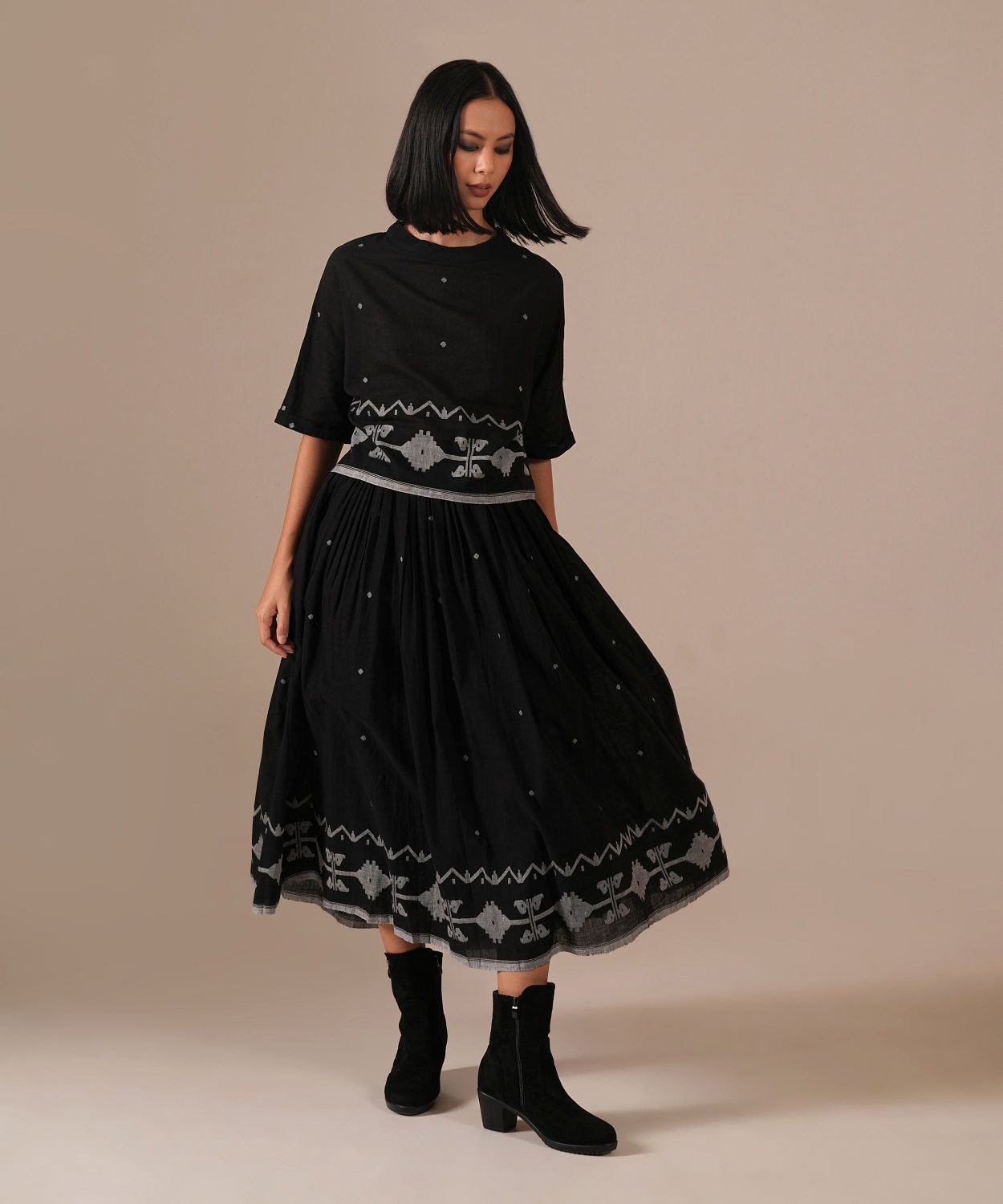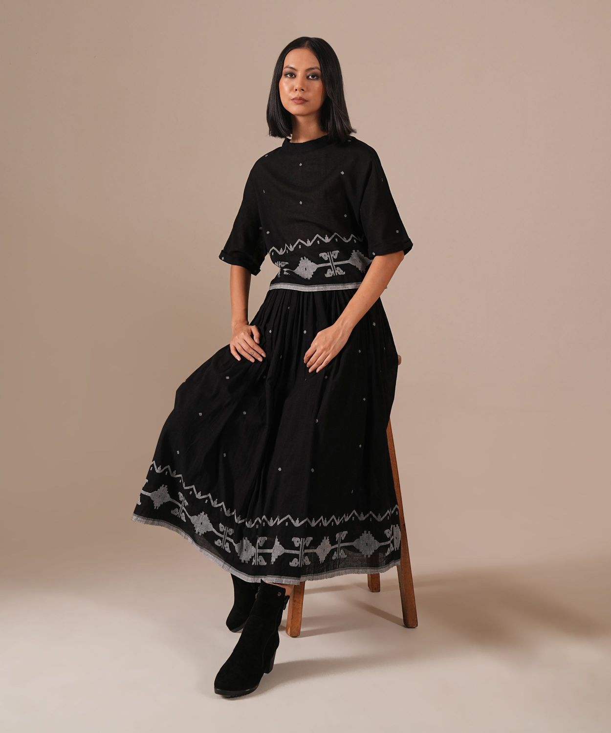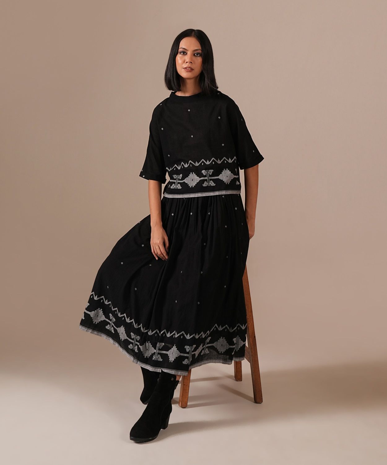 A classic Jamdani co-ord set with a gathered skirt with side pockets and a boxy top — a perfect choice for any wardrobe. Handwoven by Indian artisans.