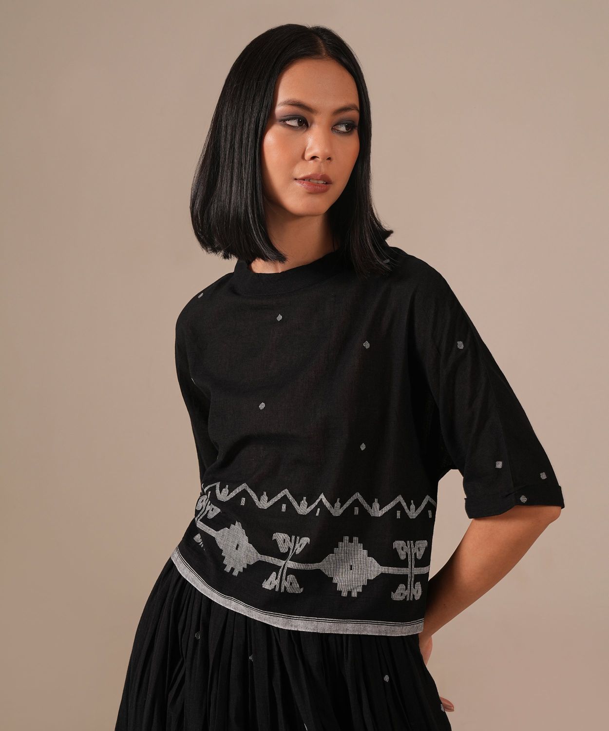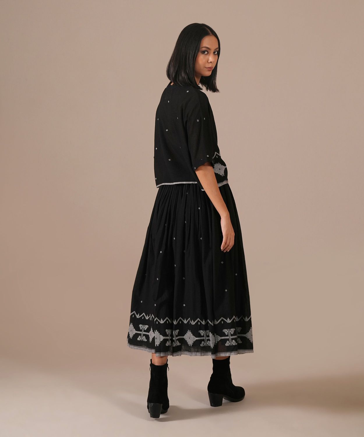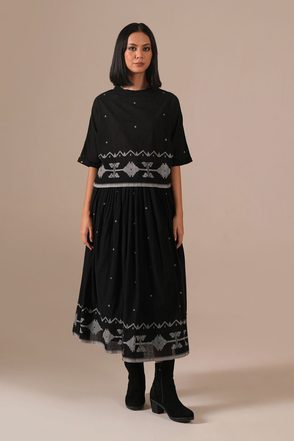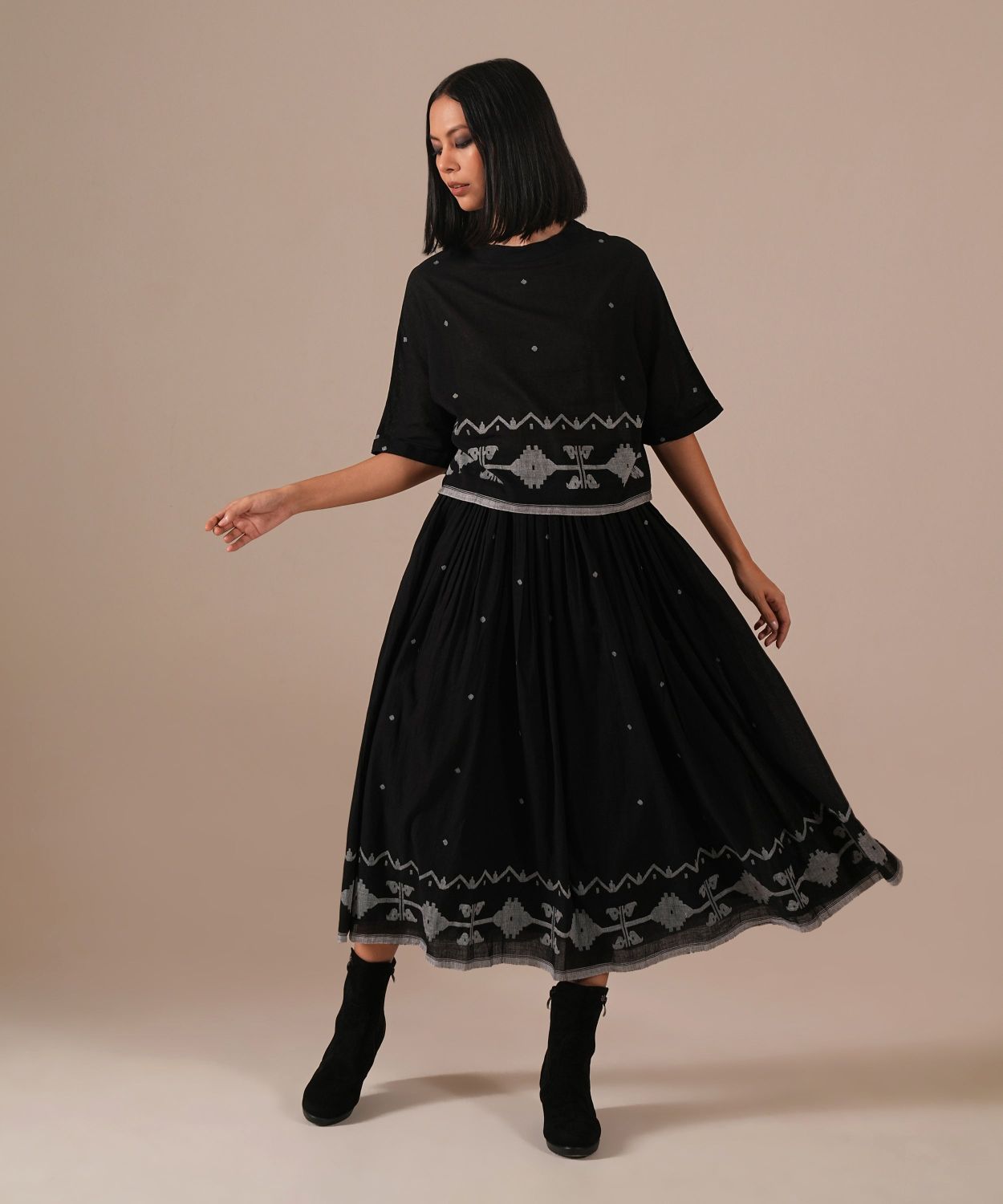 A classic Jamdani co-ord set with a gathered skirt with side pockets and a boxy top — a perfect choice for any wardrobe. Handwoven by Indian artisans.