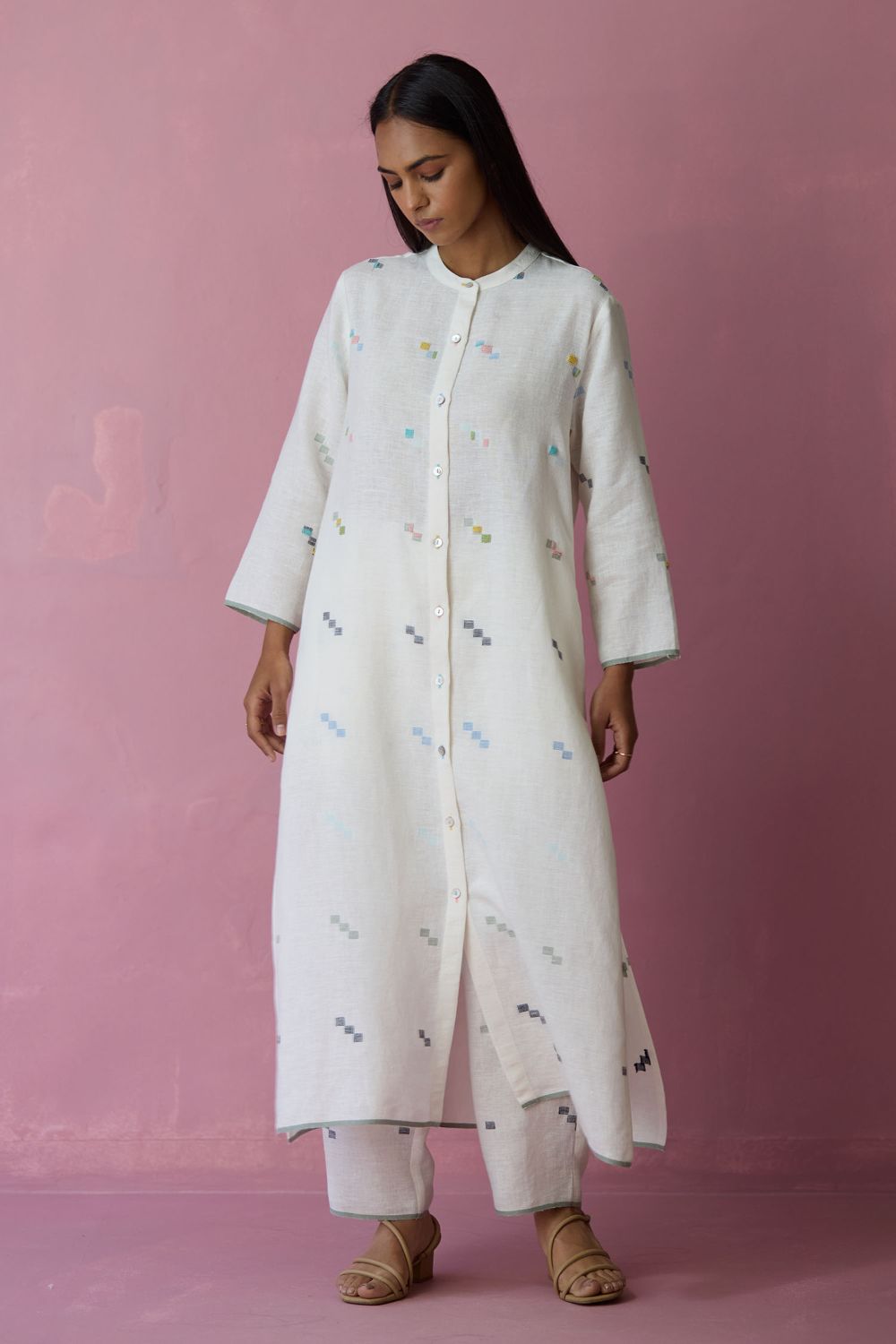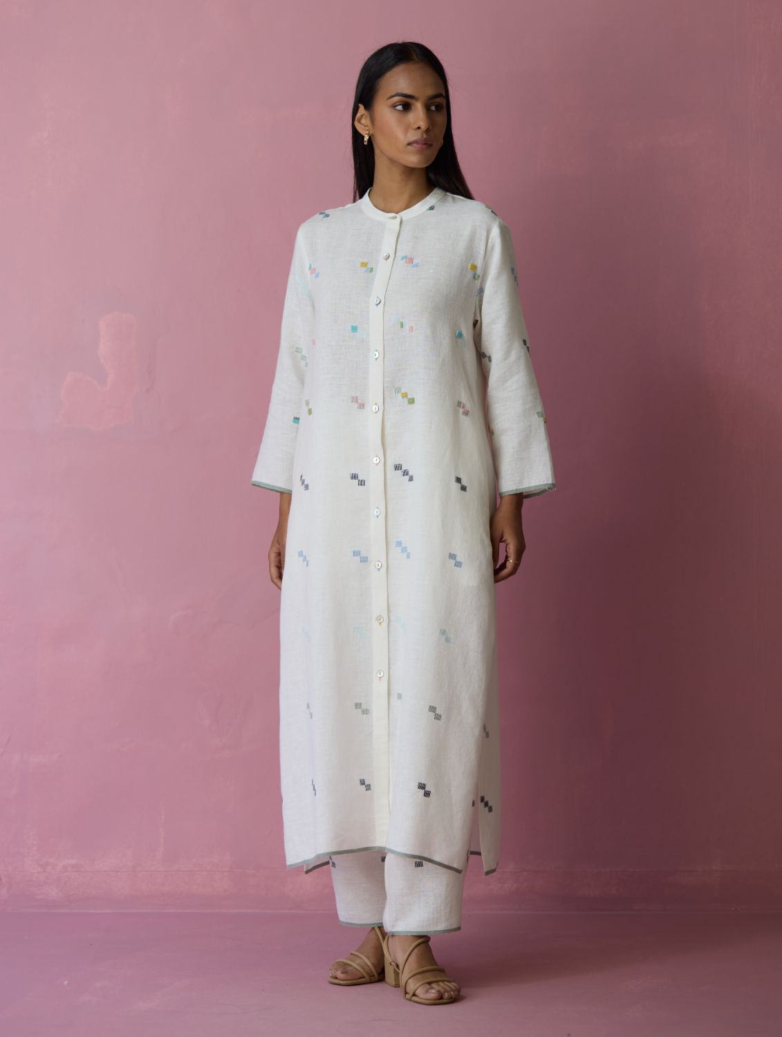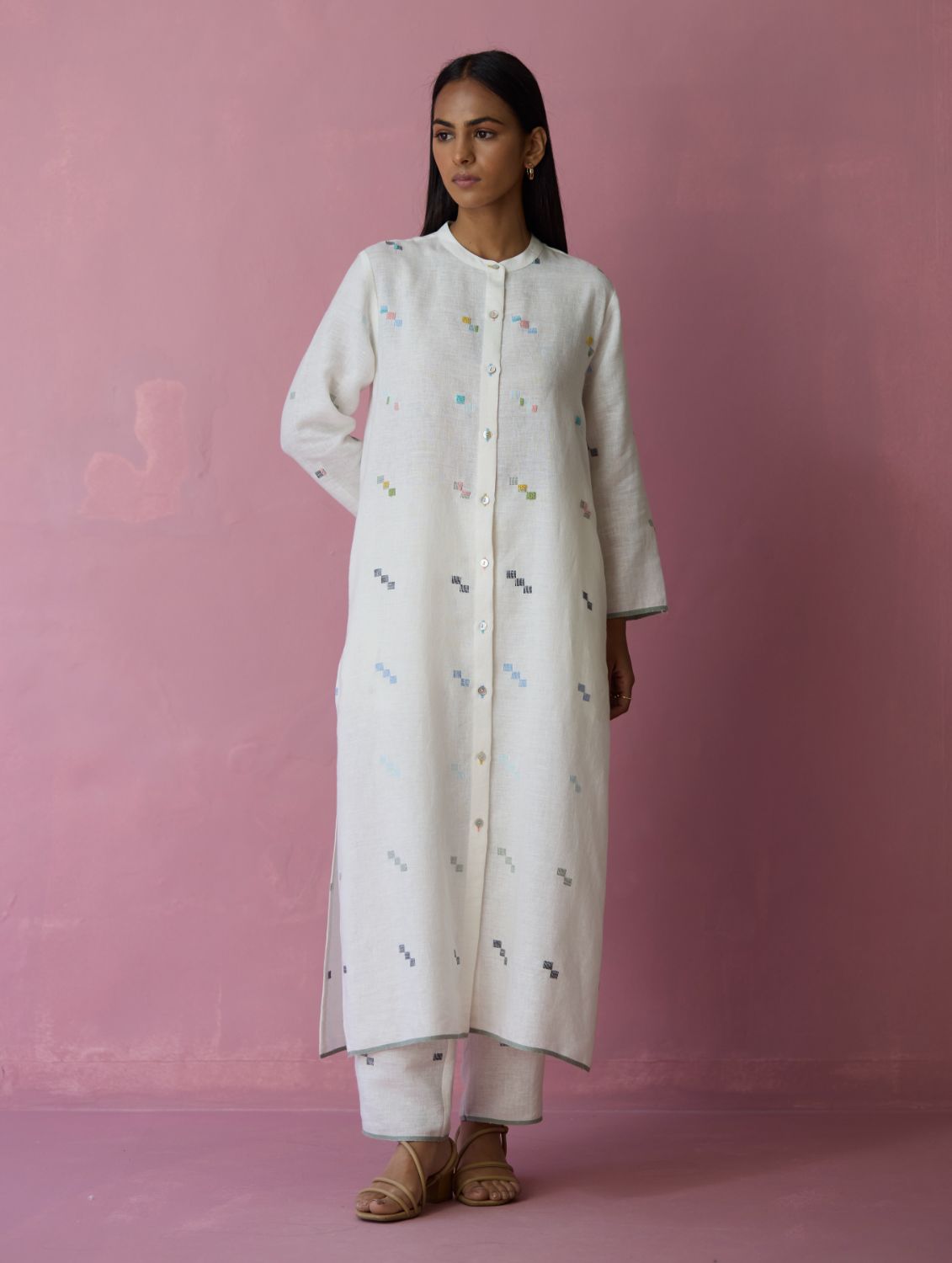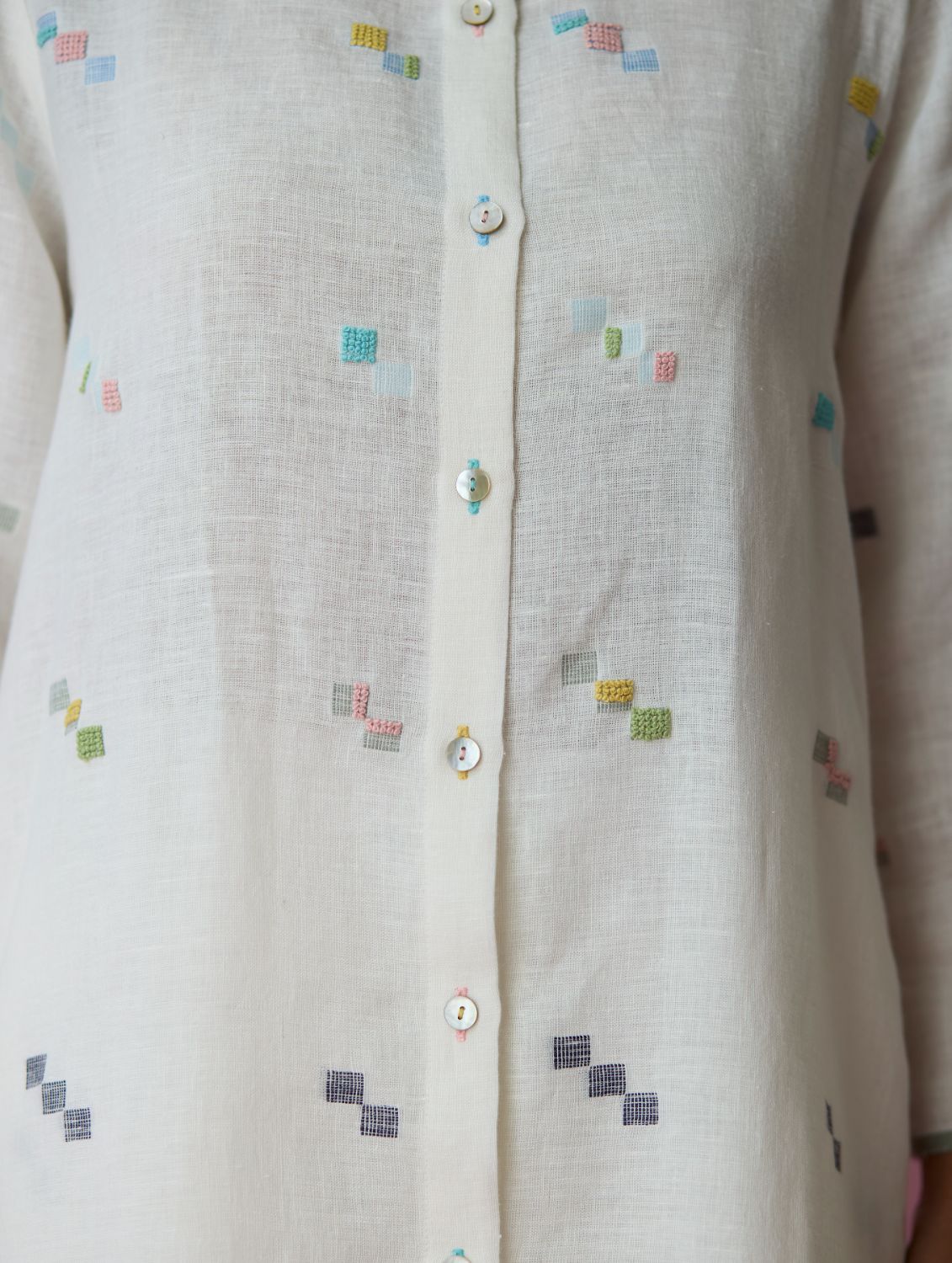 The Miel shirt kurta is designed in our soft handloom jamdani linen with 4-colour square motifs repeating in a 1-2-3 pattern. The Miel has a classic mandarin collar, pockets, a clean button-down front with mother-of-pearl buttons and intricate textural multi-colour french knot embroidery. The sleeve hems and bottom hemline are finished with contrast woven selvedge accents. Miel is a craft-forward shirt kurta that is wearable across seasons.