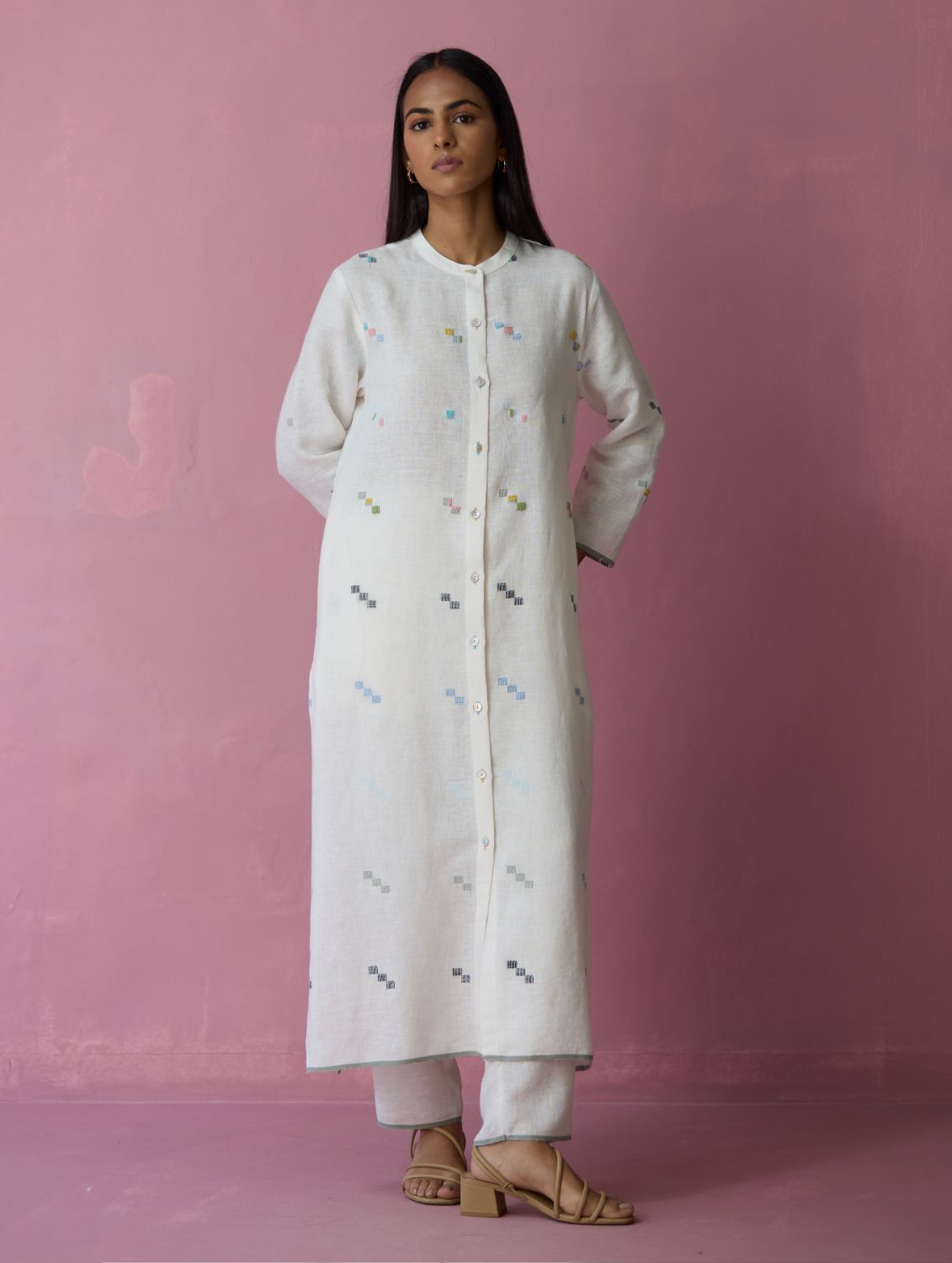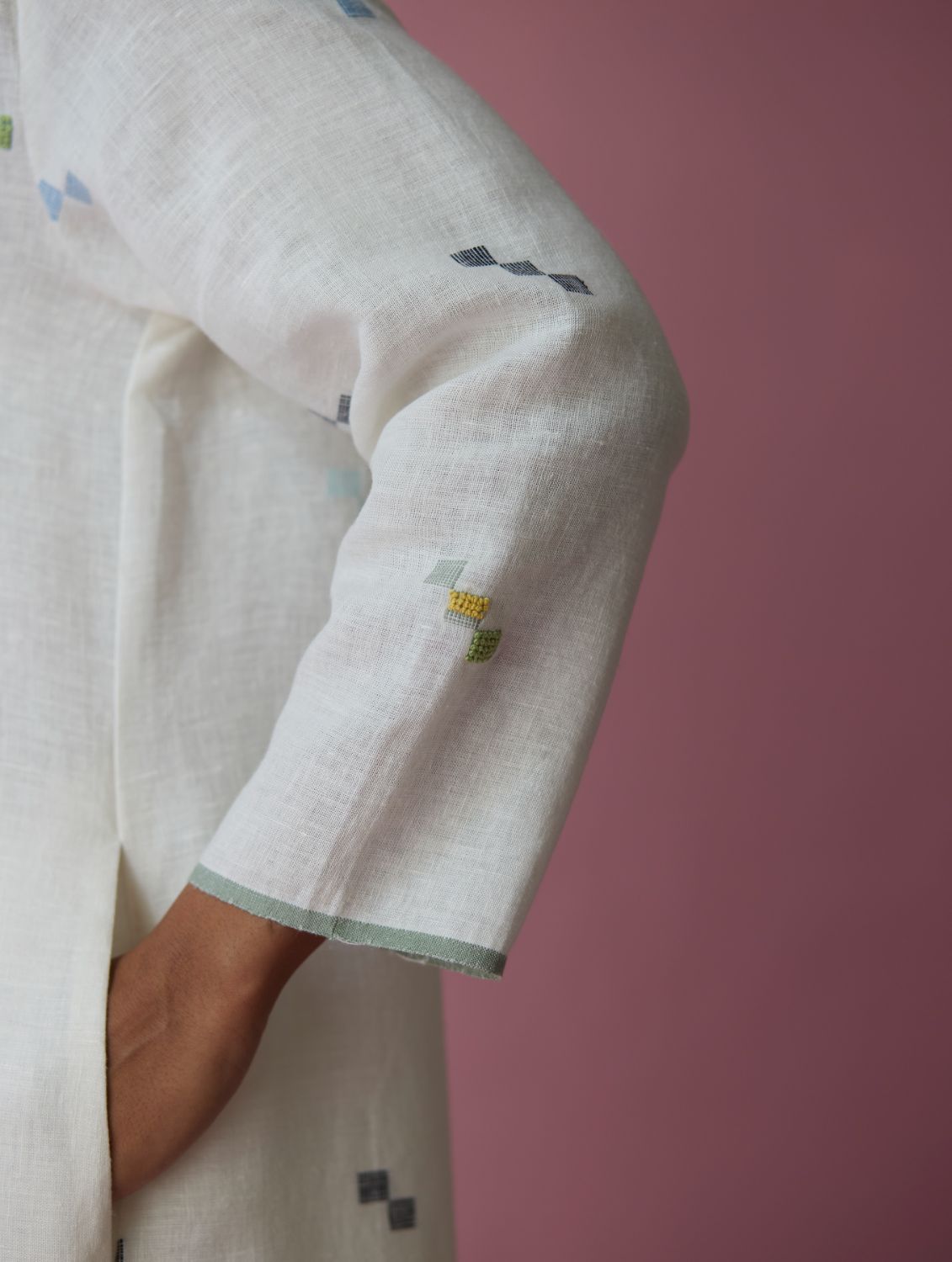 Miel Hand-Embroidered Jamdani Linen Shirt Kurta - Ivory