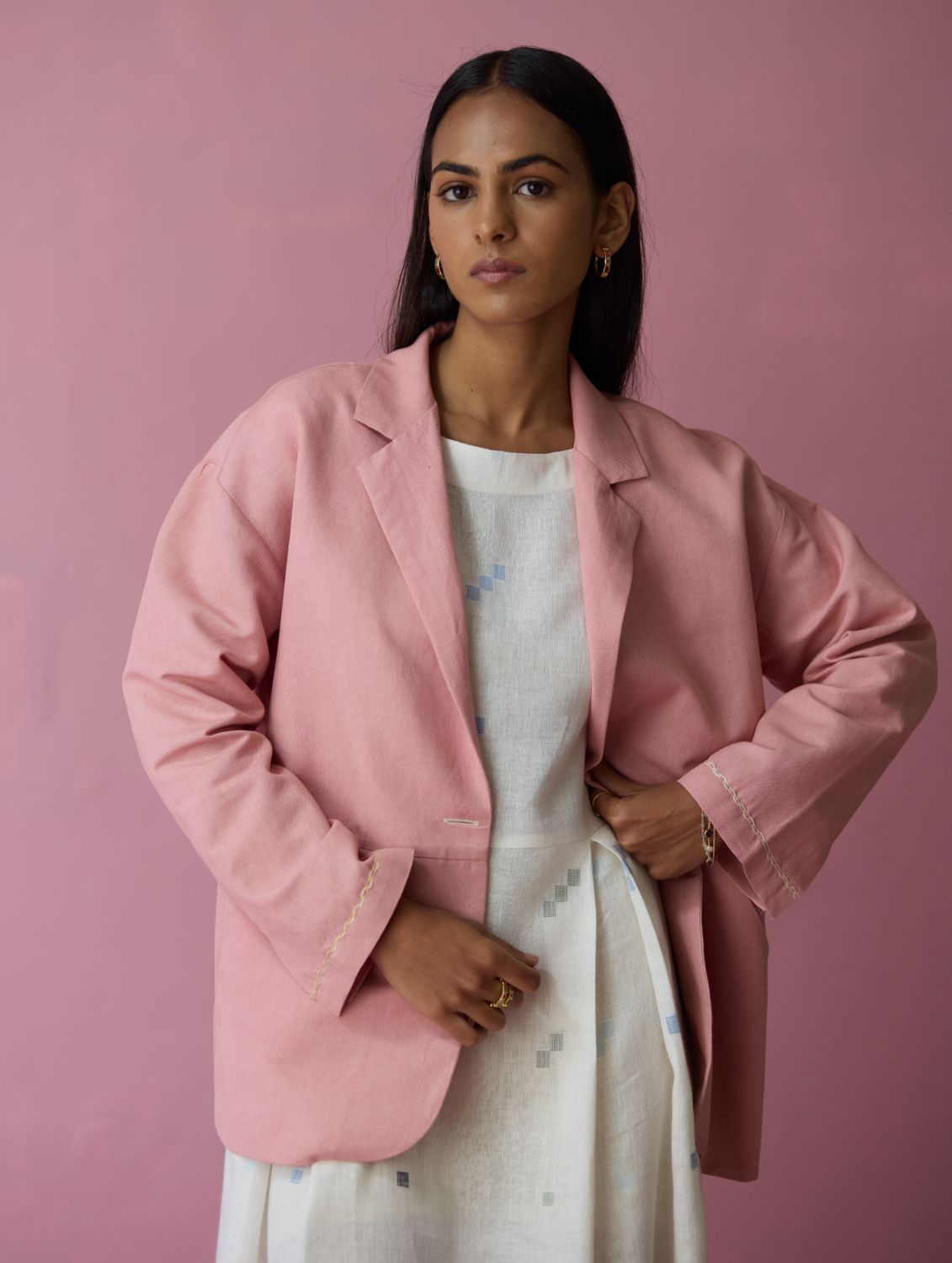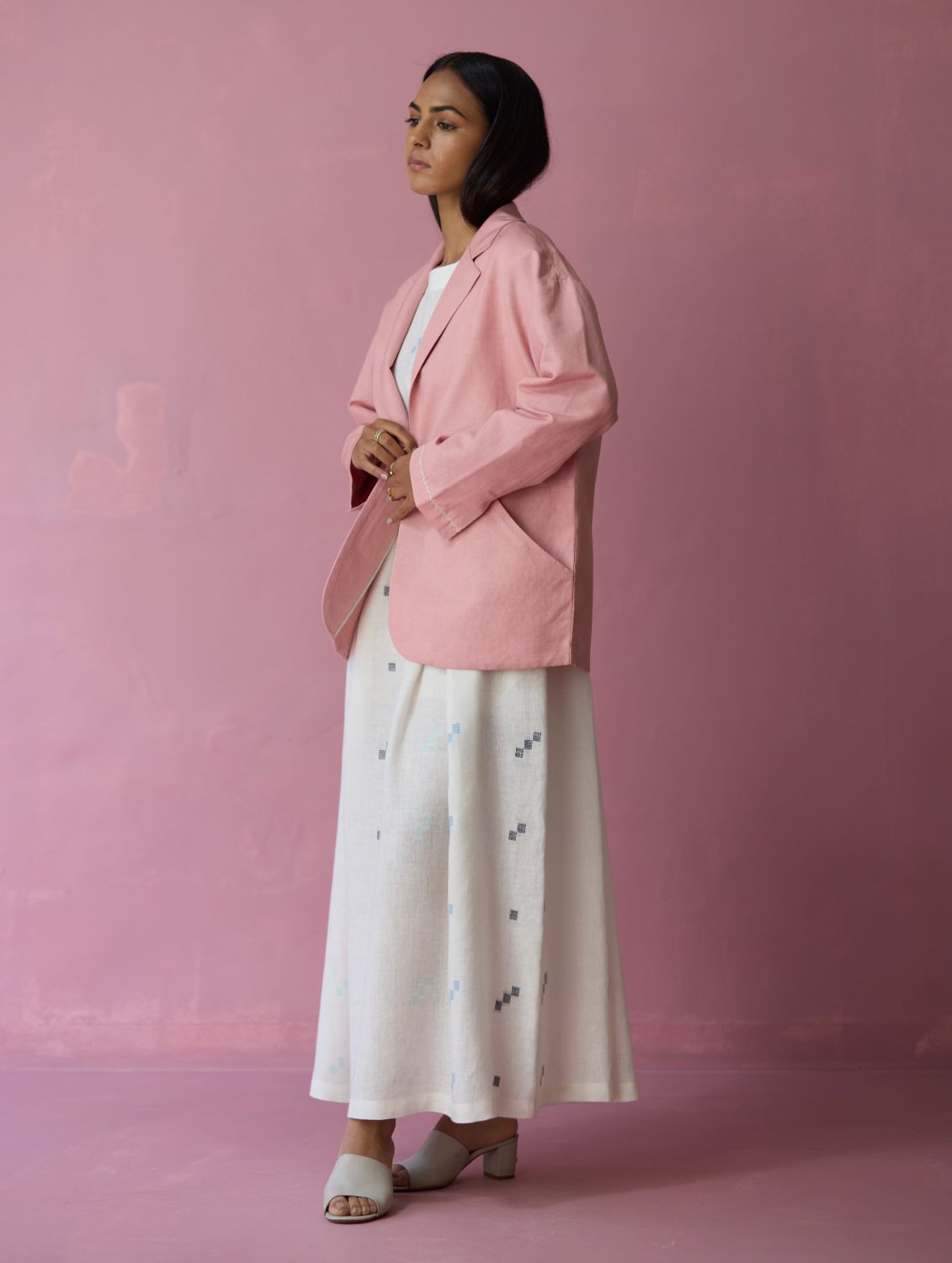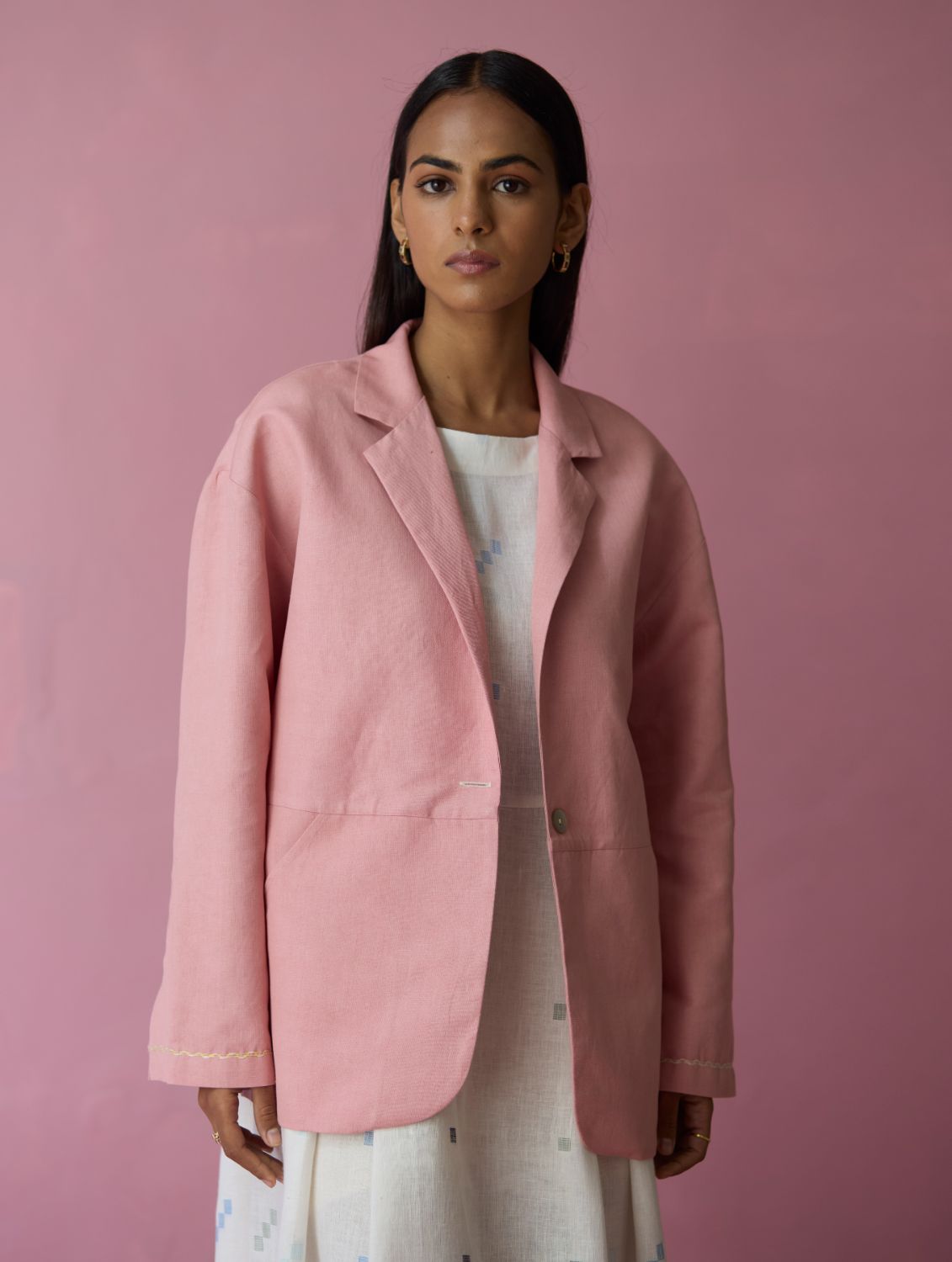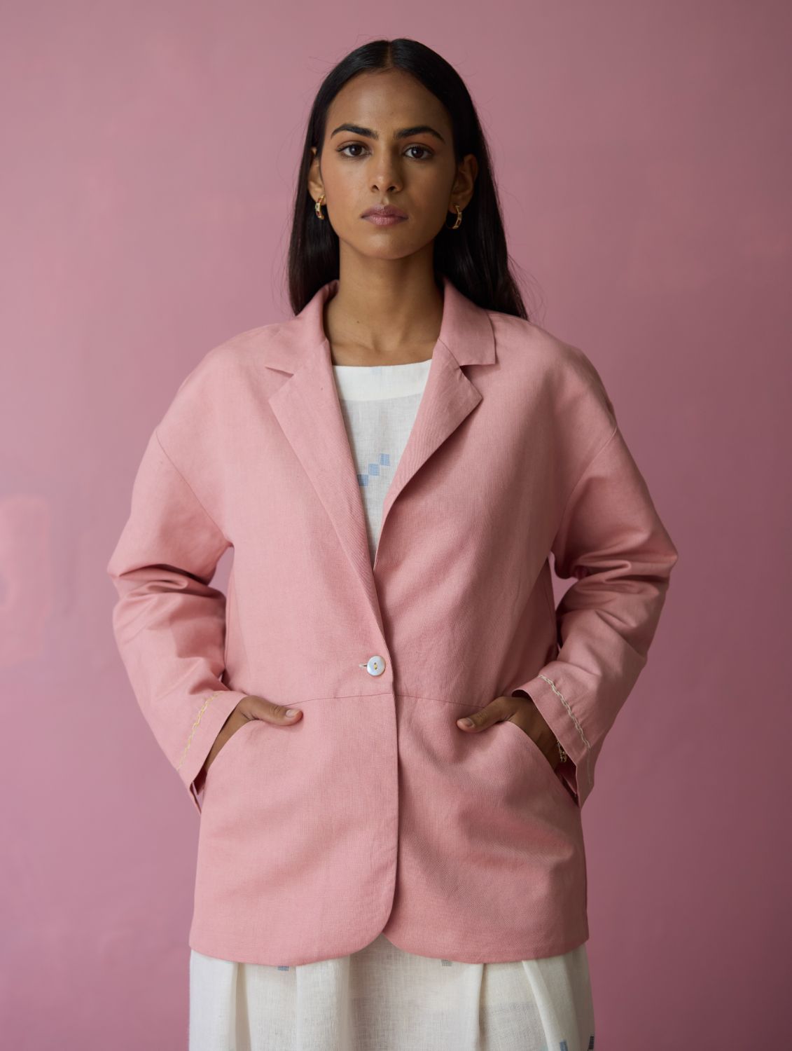 This comfort-first oversized blazer is crafted in our soft thick linen offering a structured yet versatile silhouette with a refined, tactile finish. The jacket is designed with thoughtfully constructed panels, side curved pockets extending into the panels and delicate handwork accents on the sleeve hems. A versatile layering piece, the Nina blazer transitions effortlessly from afternoons to evenings with understated elegance and comfort.