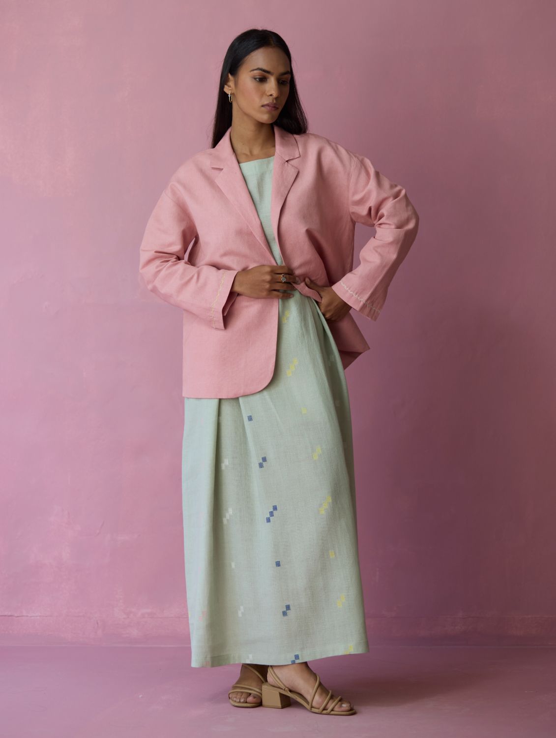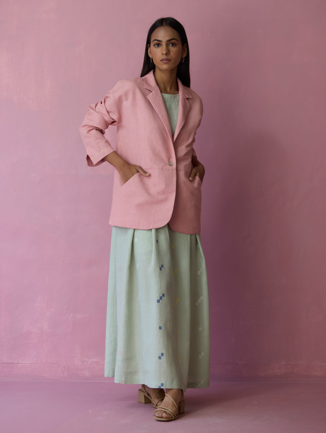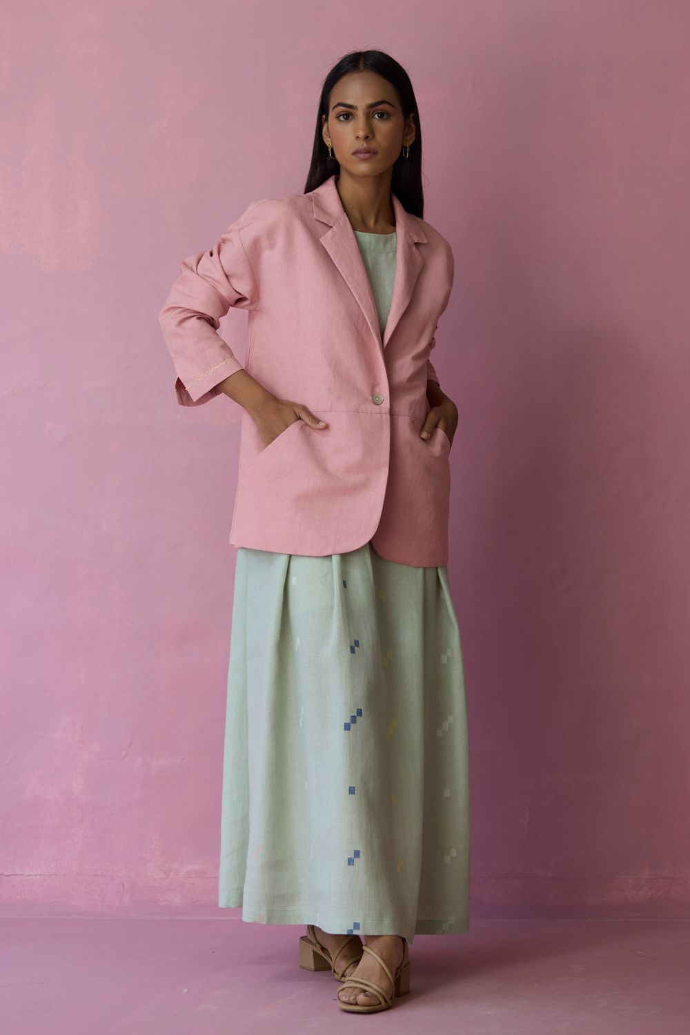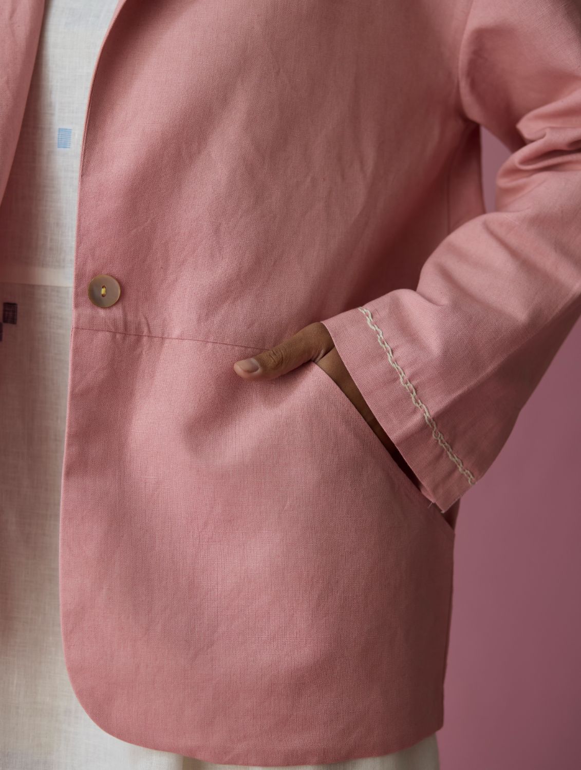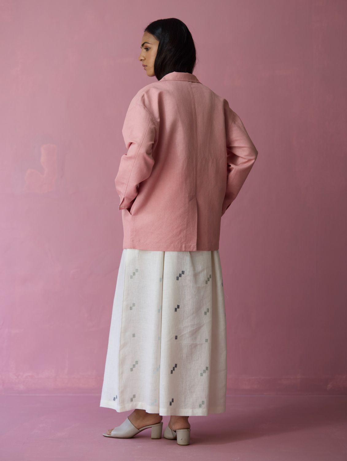 This comfort-first oversized blazer is crafted in our soft thick linen offering a structured yet versatile silhouette with a refined, tactile finish. The jacket is designed with thoughtfully constructed panels, side curved pockets extending into the panels and delicate handwork accents on the sleeve hems. A versatile layering piece, the Nina blazer transitions effortlessly from afternoons to evenings with understated elegance and comfort.