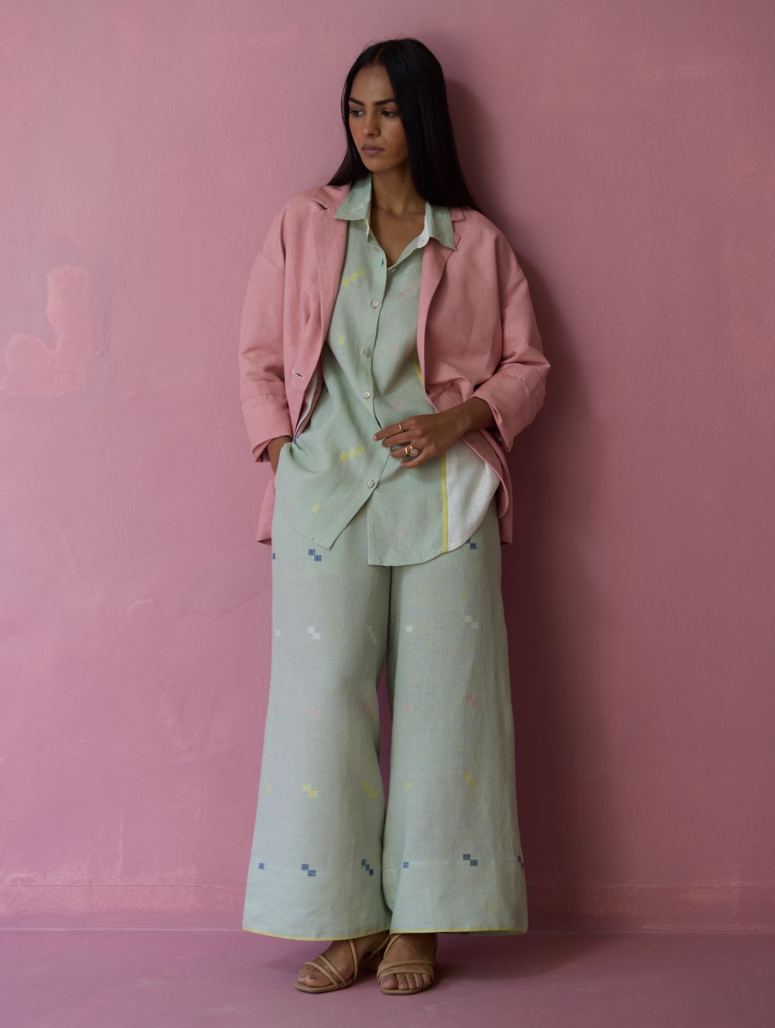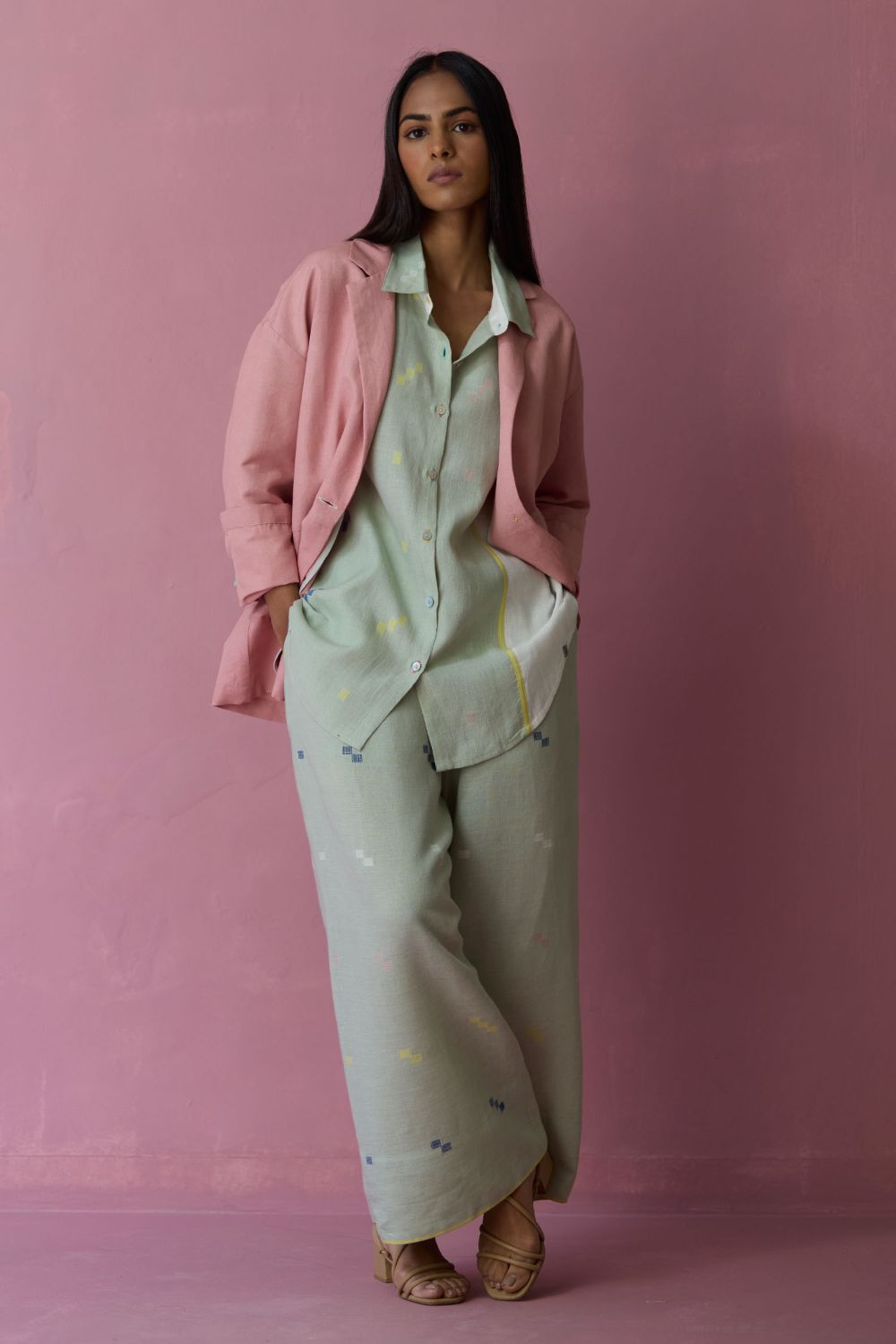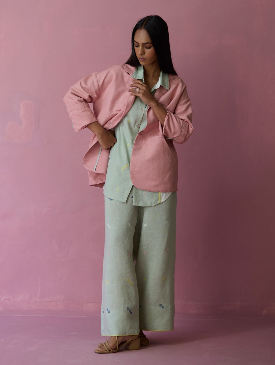 Their signature linens soften beautifully with time, eventually returning to the earth. They work with eri (ahimsa) silk, celebrated for its strength and gentle texture, and craft thoughtful blends of viscose, cotton, silk, and linen for pieces designed to last. Yarn-dyed techniques minimise chemical use and create the subtle, heathered tones that have become a quiet Manan signature.