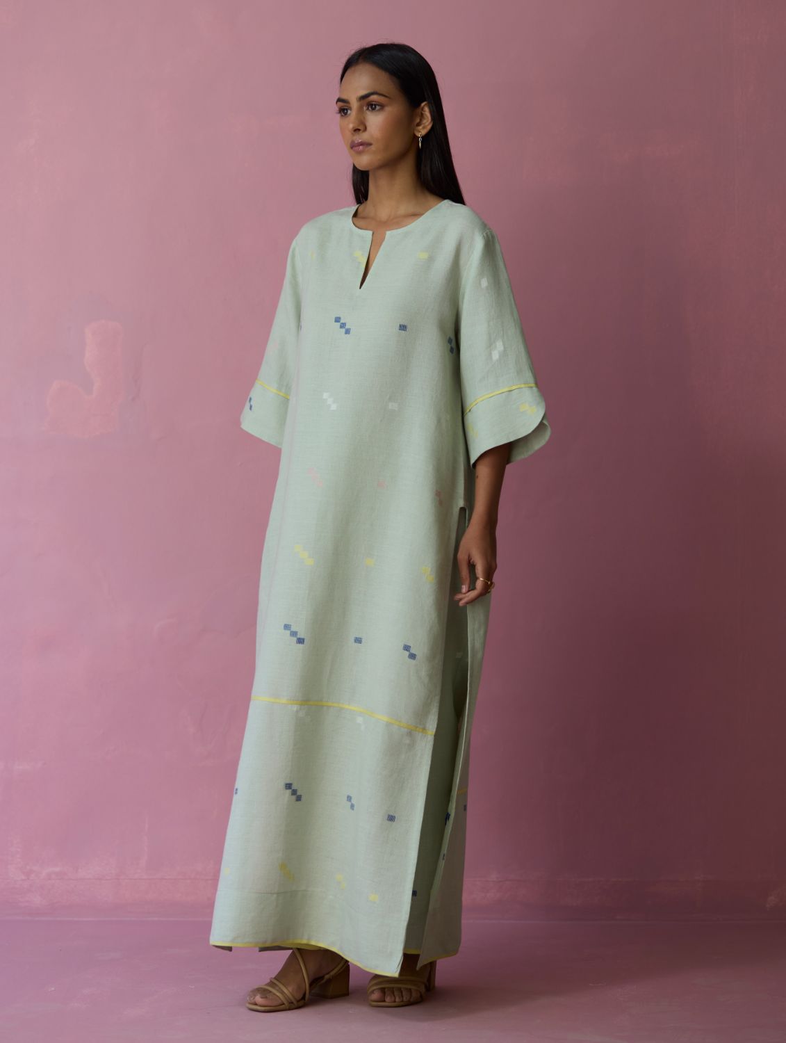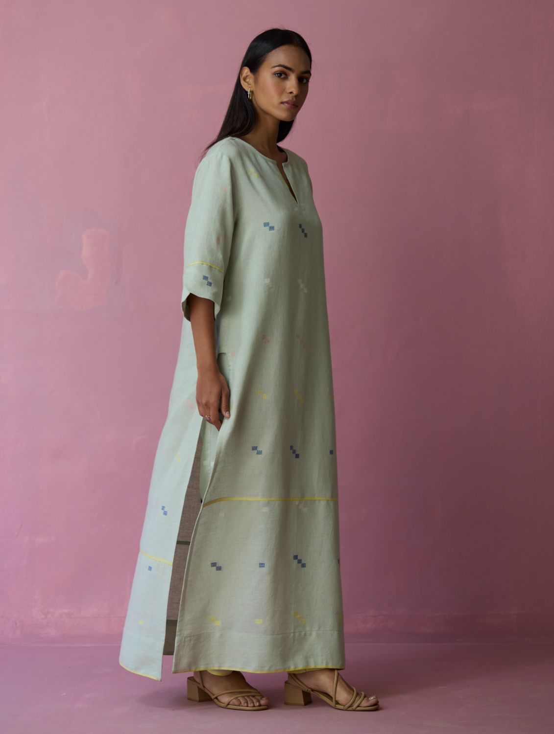 The Rina kurta is thoughtfully crafted in our soft handloom jamdani linen with a distinct varying 4 color square motif weave. The kurta is designed with a bold long square side slits for flow and ease-of-movement, detailed with woven selvedge detailing along the bottom panel and finished with intricately detailed sleeve cuffs. A versatile kurta bodice that can help you transition easily from afternoons to evenings.