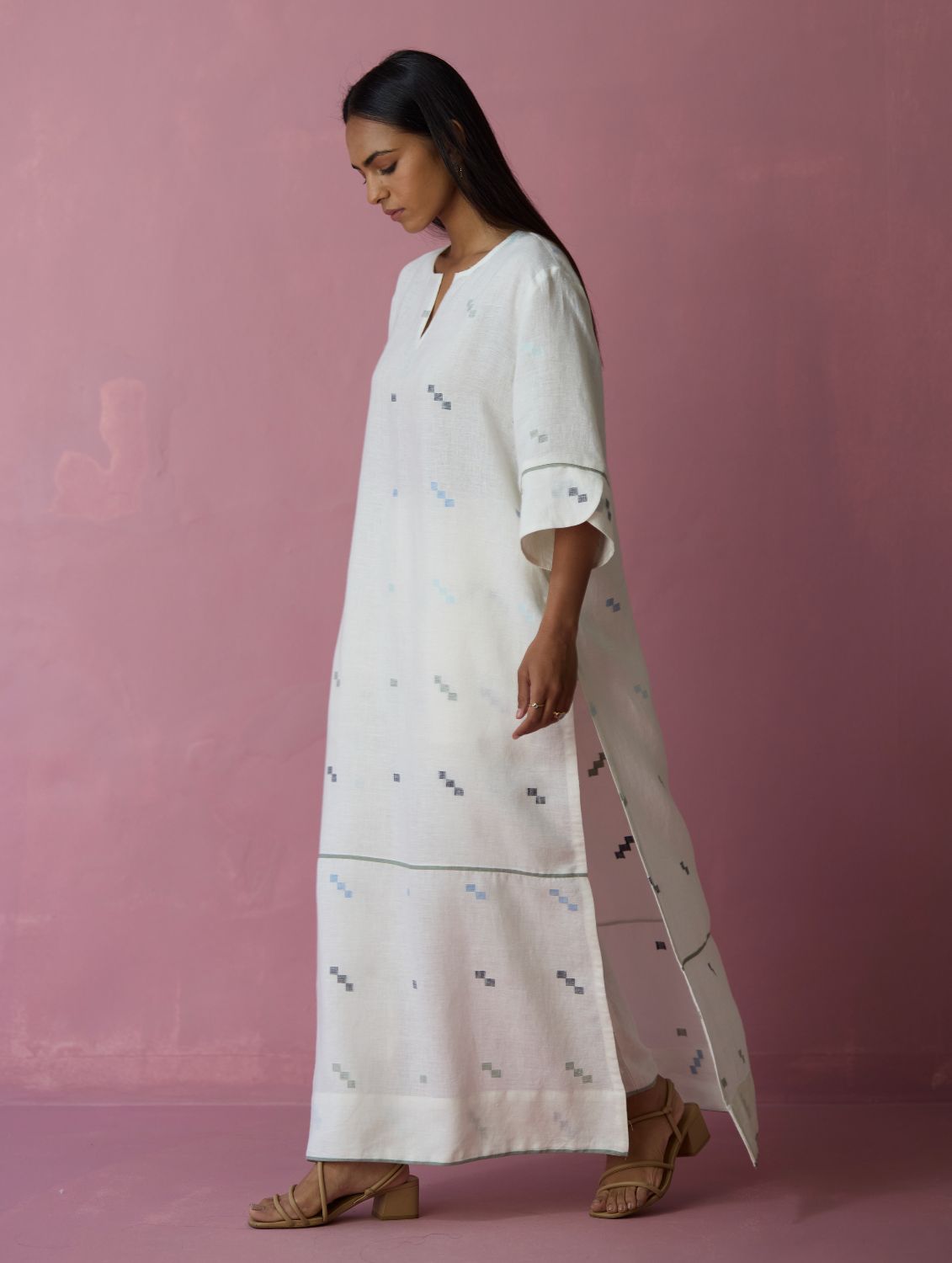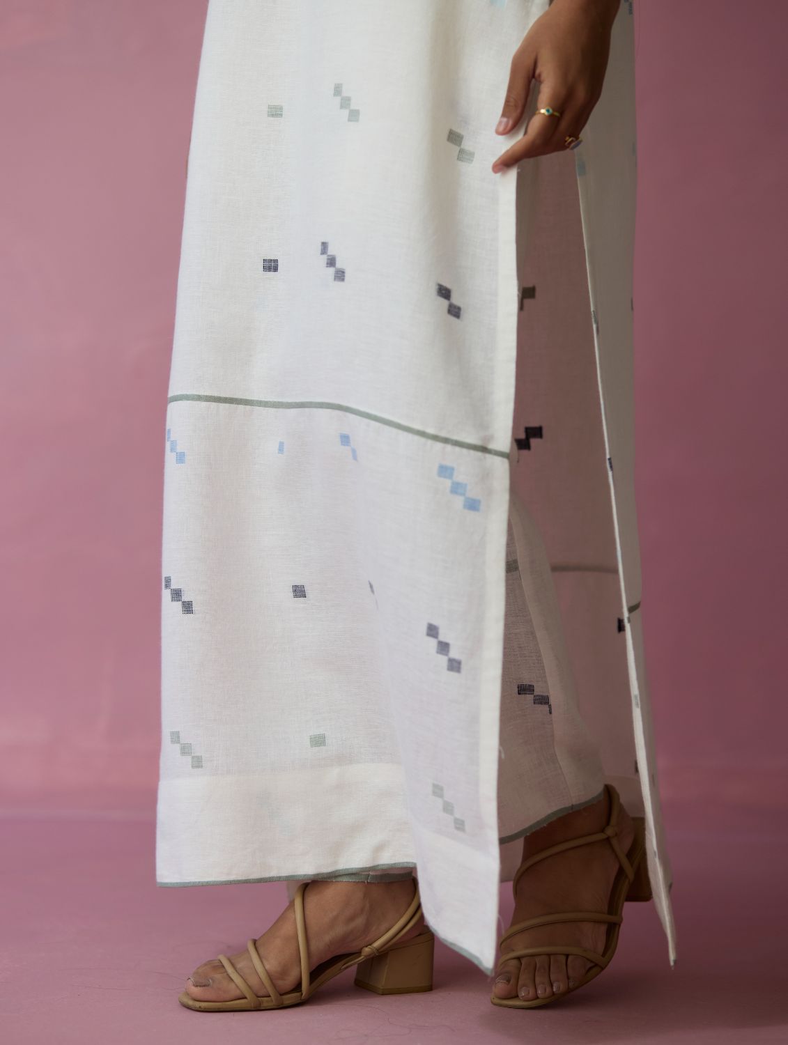 The Rina kurta is thoughtfully crafted in our soft handloom jamdani linen with a distinct varying 4 colour square motif weave. The kurta is designed with a bold long square side slits for flow and ease-of-movement, detailed with woven selvedge detailing along the bottom panel and finished with intricately detailed sleeve cuffs. A versatile kurta bodice that can help you transition easily from afternoons to evenings.