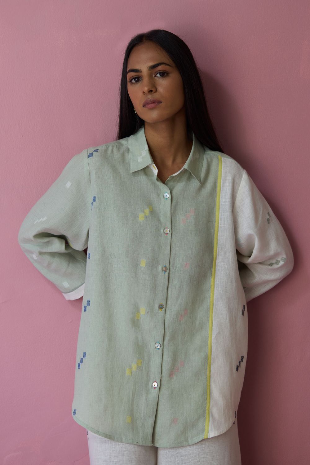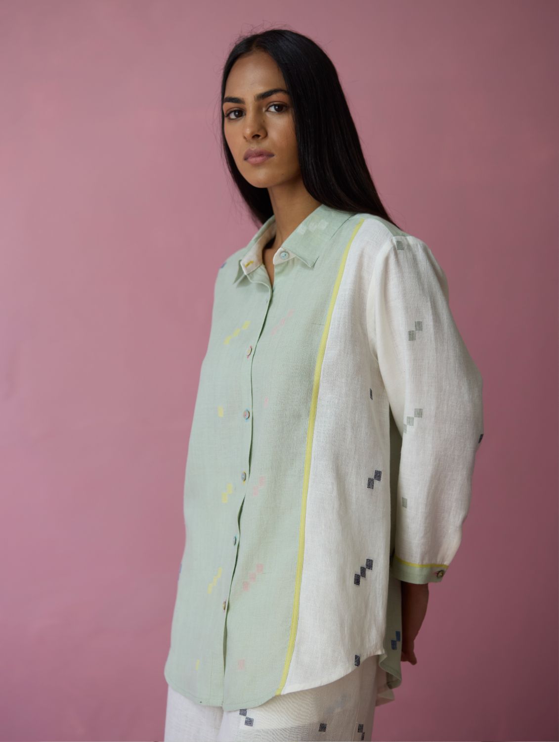 The Sela colour-block shirt is our expression of handwoven craft and thoughtful design. Our signature best-selling shirt bodice is crafted in handloom soft jamdani linen with a distinctive varying 4-colour square motif weave. Designed with carefully constructed colour-block panels of aqua jamdani linen and ivory jamdani linen with woven selvedge details thoughtfully placed along the front, back, and sleeve cuffs. Designed for ease and movement, the shirt is detailed with a back inverted pleat and is finished with small mother-of-pearl buttons. One of our favorites this year!