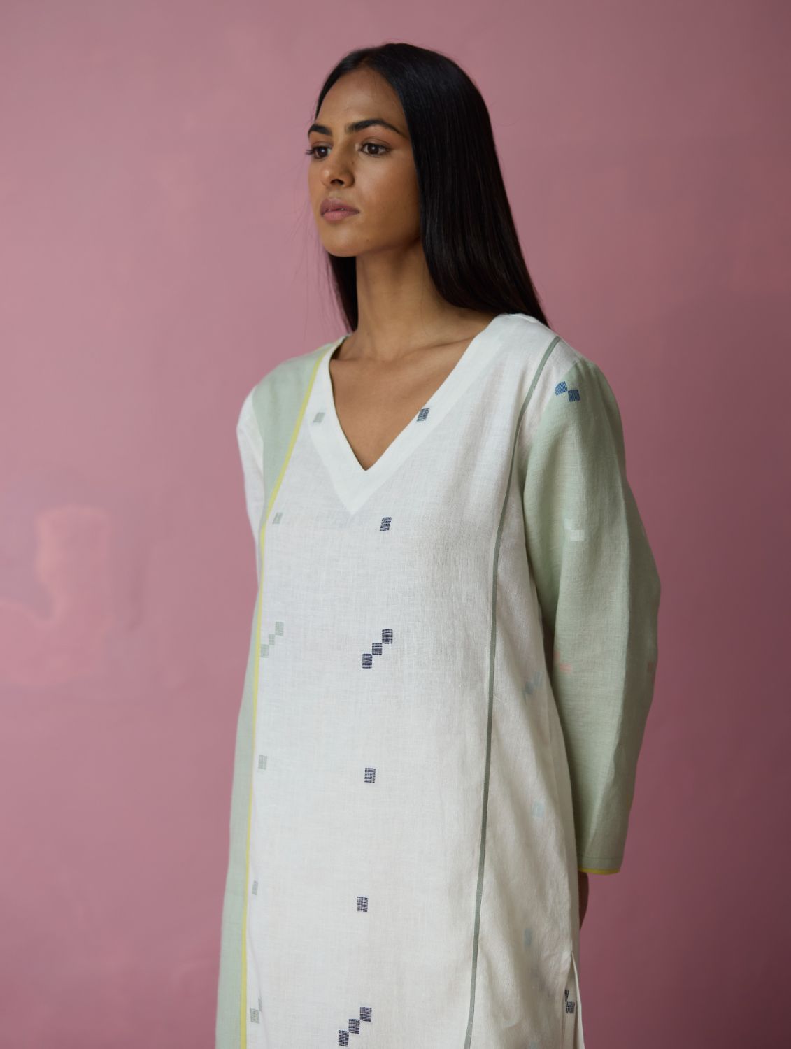The Siza color-block kurta is crafted in two yarn-dyed handloom soft jamdani linens with unique varying 4-colour square motif weaves. Designed with a timeless v-neckline and thoughtful colorblock panelling placed along the front, back, and sleeve hems, with woven selvedge edging across the bodice. The kurta silhouette is a signature timeless Manan style that has functional side pockets and extended side slits for movement and easy wearability. Our founder's favorite pick from the collection!