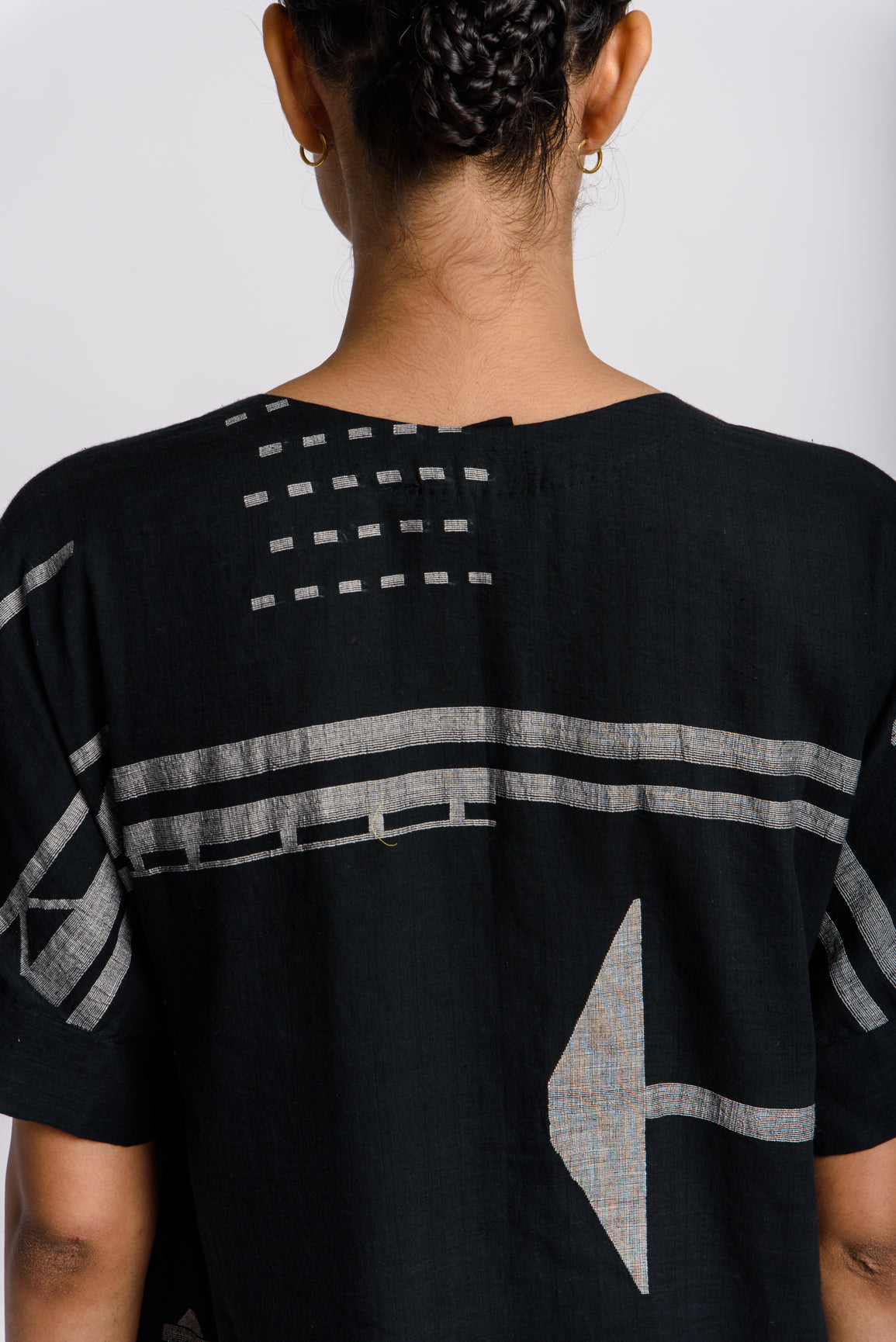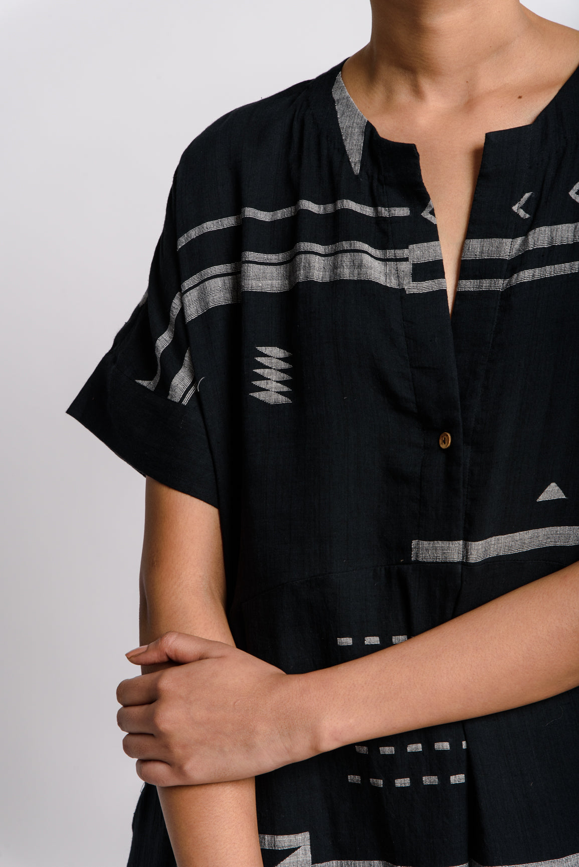 Be a true trend setter with this black striped jamdani shift dress. The dress is made from the finest quality 100% cotton fabric and manufactured with traditional techniques handed down from generation to generation. This dress has a front placket, steep v-neckline, and an A-line flare and side pockets. Pair with black stilettos for a simple but classy look, or get creative with Birkenstocks.