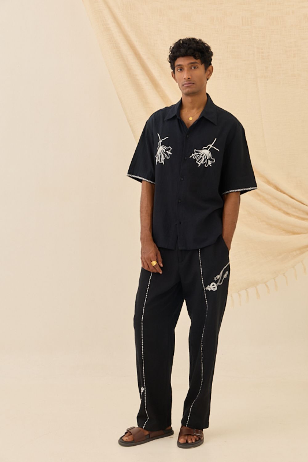A boxy fit, short-sleeved black shirt with an open collar. The shirt is beautifully accented with bold white hand-embroidery of large, stylized floral motifs on the chest. White contrast hand embroidery outlines the sleeve hems and there is a heart embroidery at the back yoke, pairing rustic texture with intricate needlework.
