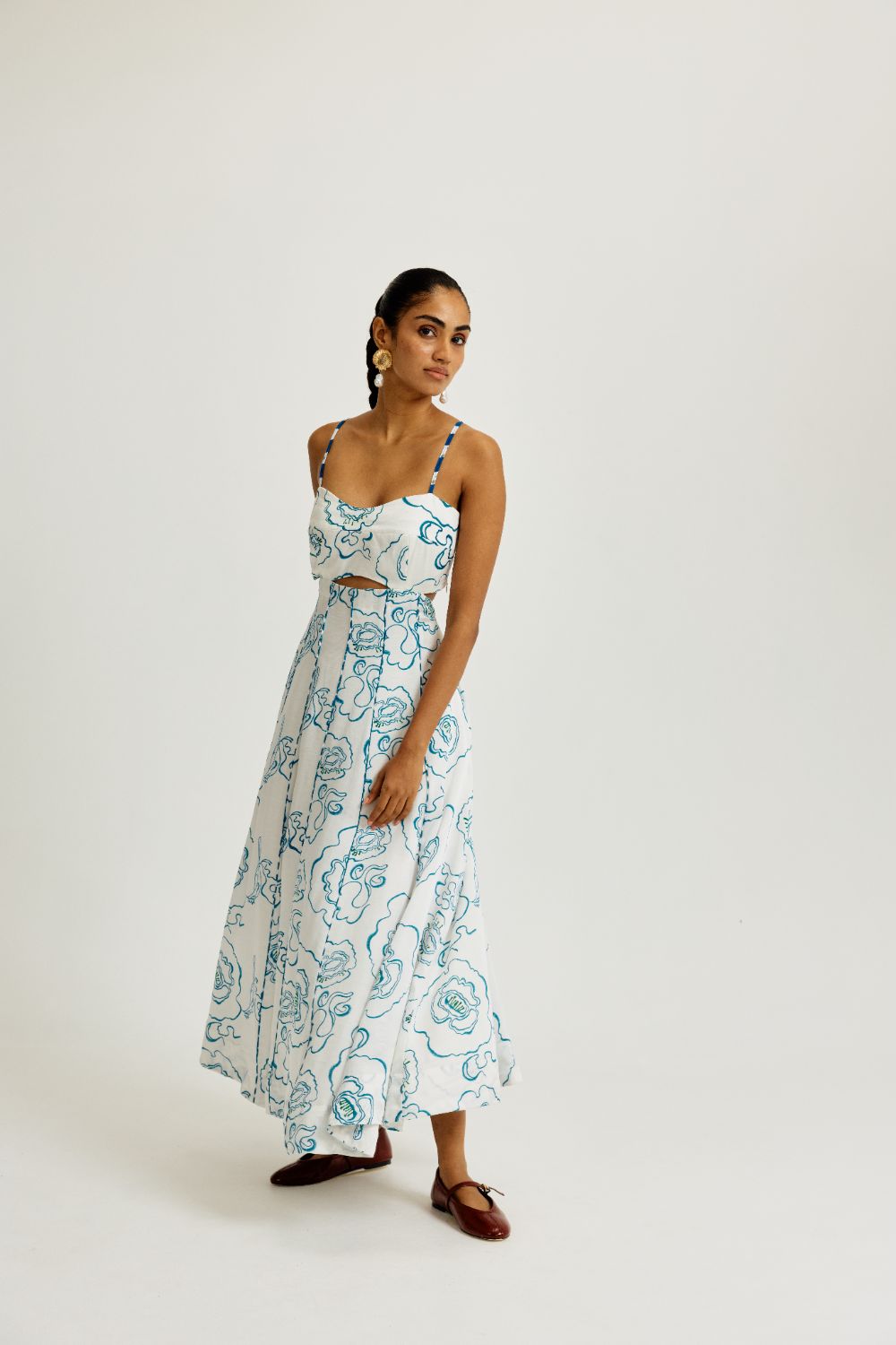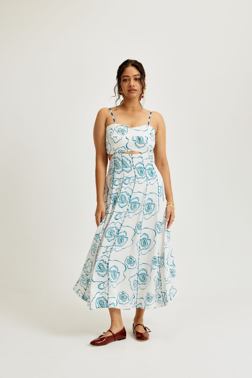 Featuring a flattering sweetheart neckline with slender shoulder straps, this silhouette is all about feminine ease. The cinched waist opens into a flared, pleated skirt that moves beautifully with every step. A subtle midriff cutout adds just the right hint of sass, while the elasticated back in contrast stripe print ensures comfort without compromising on style.