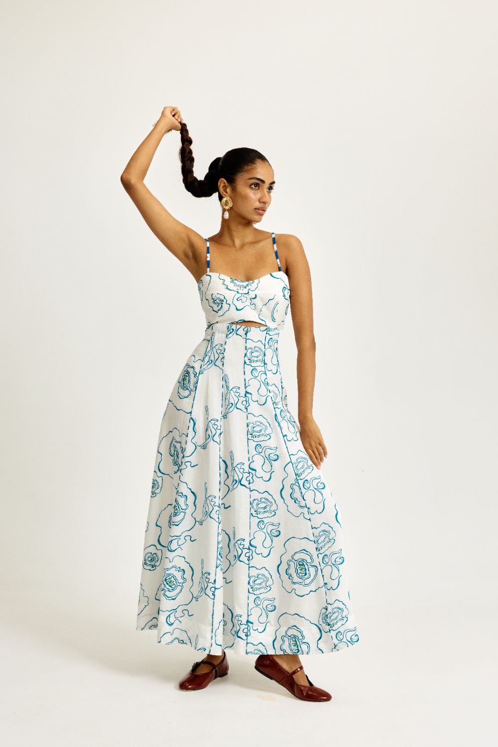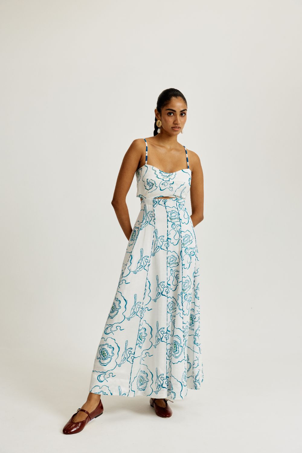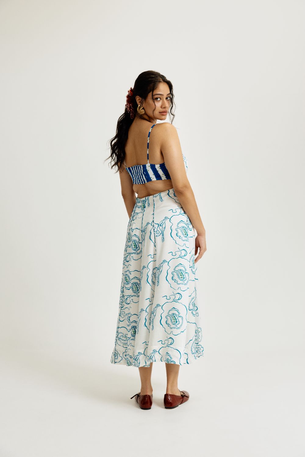 Hand block–printed textiles become canvases of unexpected geometry; colours flirt and converse rather than simply match; silhouettes carry an ease that mirrors the modern woman’s rhythm. There is a certain audacity to their aesthetic — not loud, but liberated. Not trendy, but timeless in its cultural fidelity.