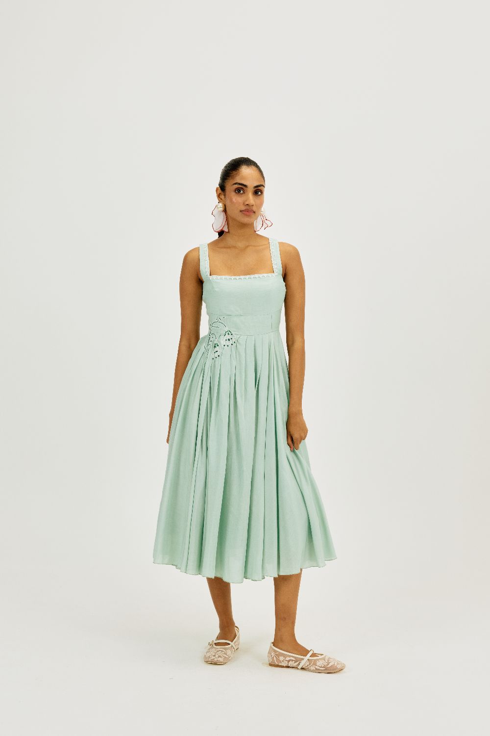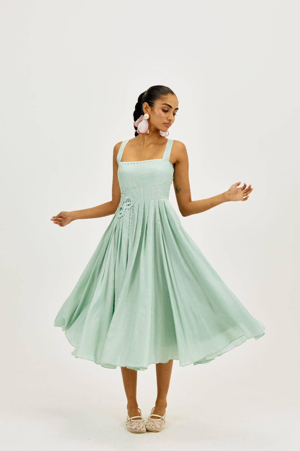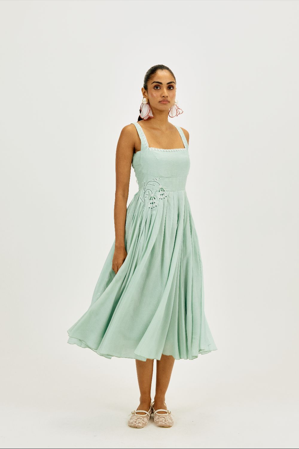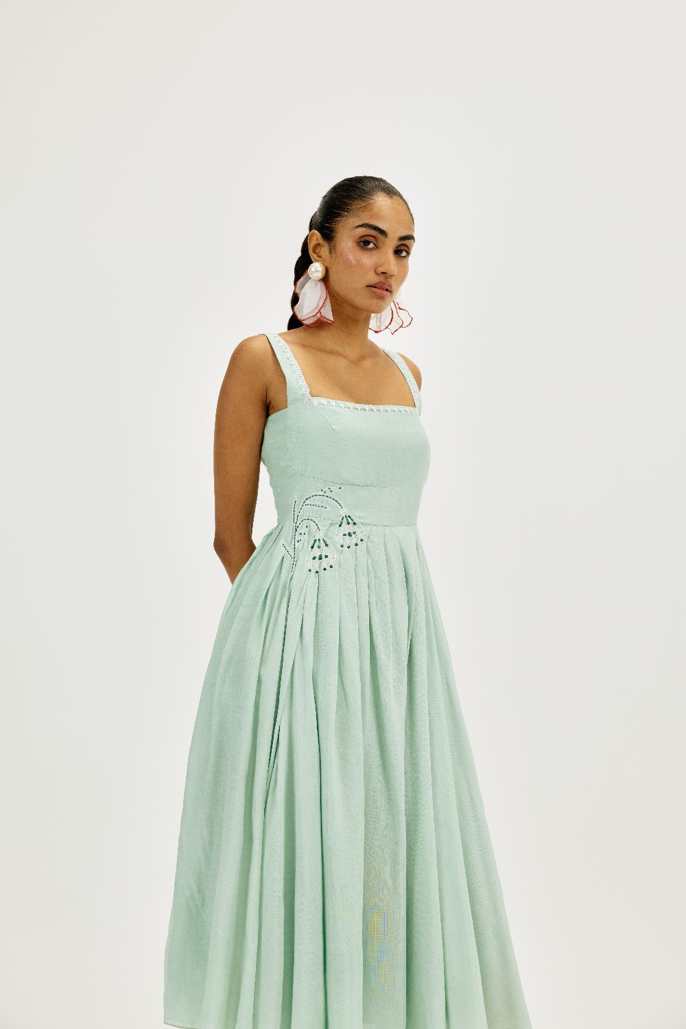 Soft, romantic, and made for balmy days. The dress is crafted in muslin silk, dyed in the dreamiest pastel green. It features delicate hand embroidery along the waist and neckline, adding a touch of artisanal detail. The pleated skirt creates gentle volume, while wide straps and a flattering square neckline keep the look modern yet nostalgic.