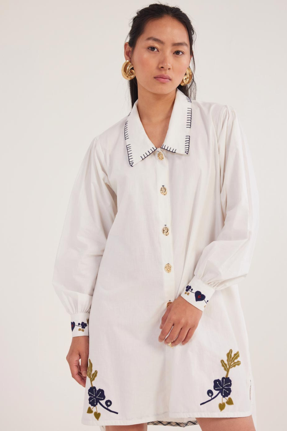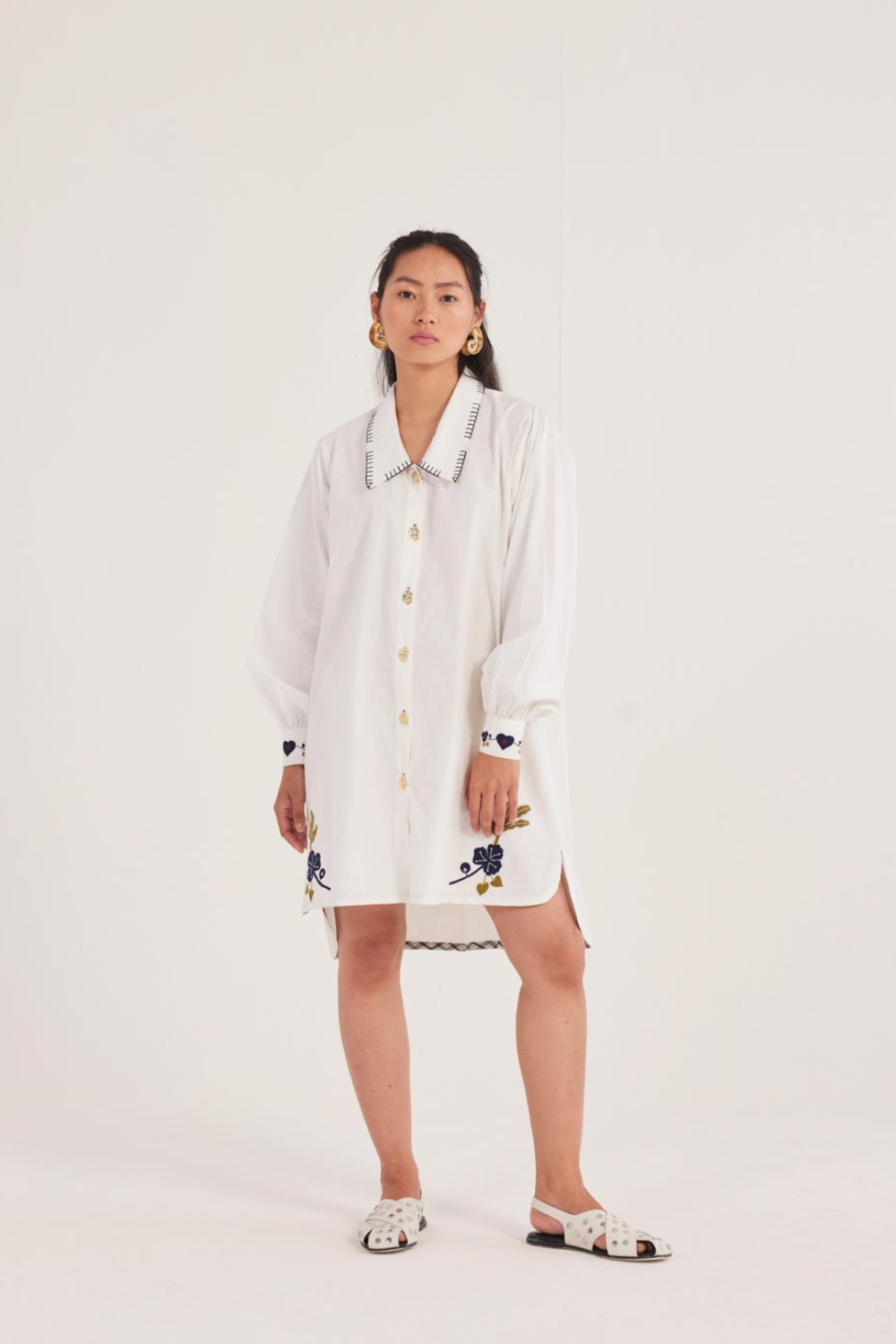 Our Kiji shirt dress is relaxed enough for vacation dressing but casual enough to do, well, anything else. It features an asymmetrical hemline with an under hem detail, charming detailed embroidery on the back, hem and cuff with a handmade kaaj detail.