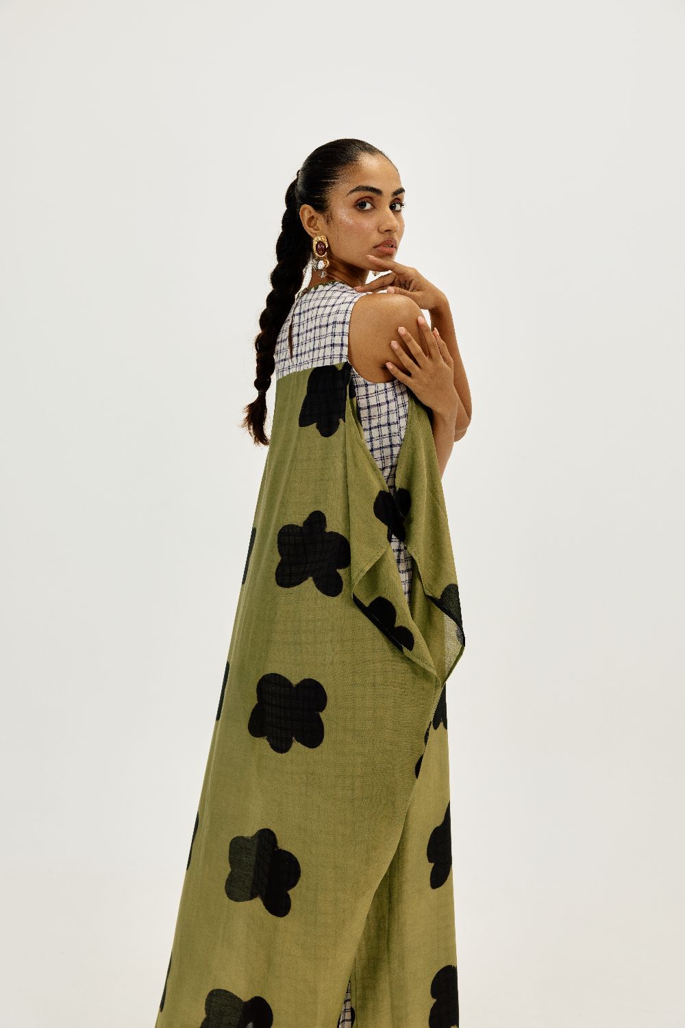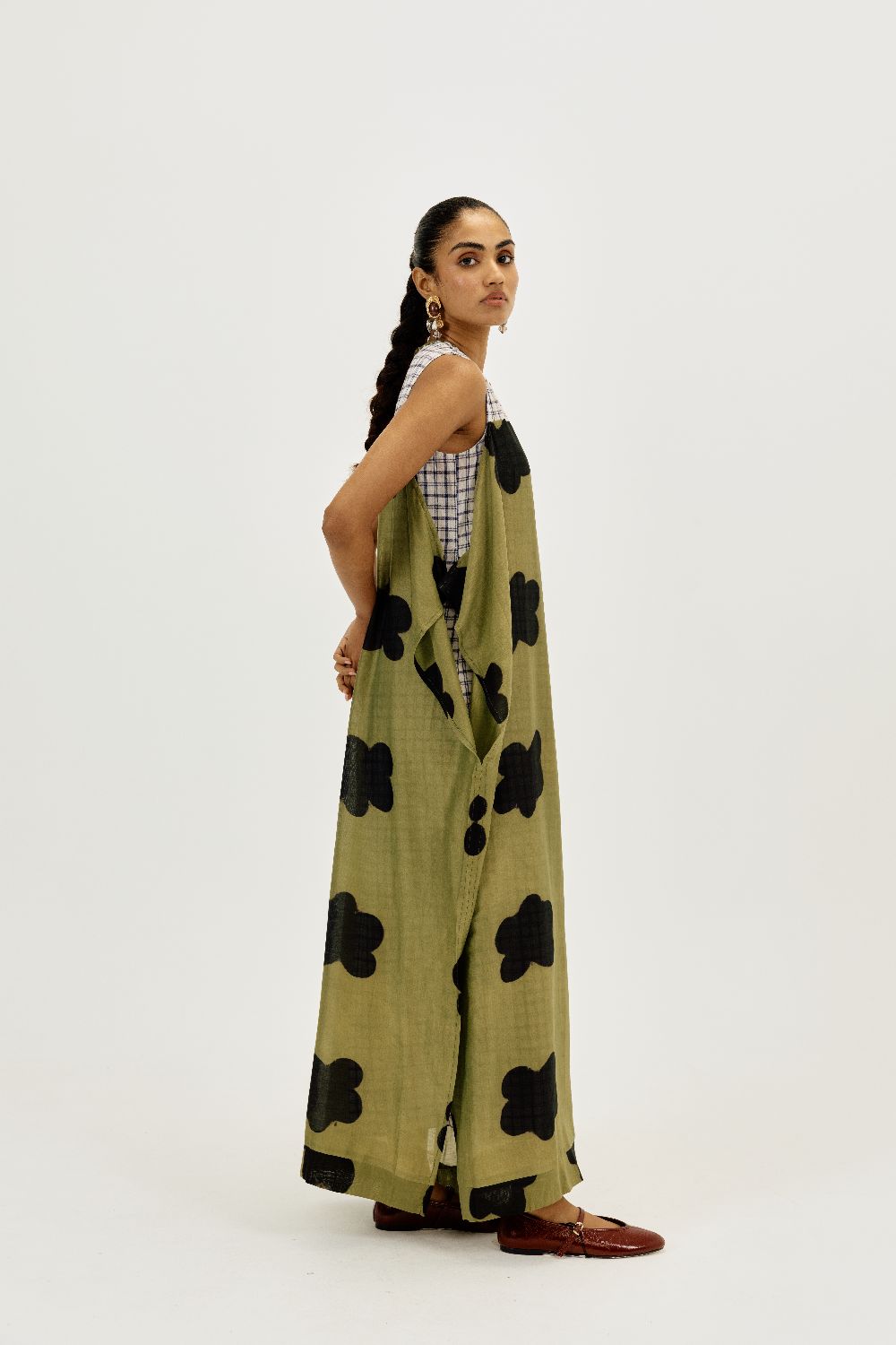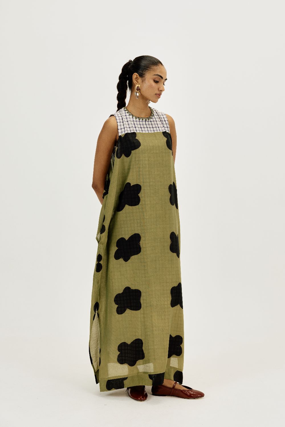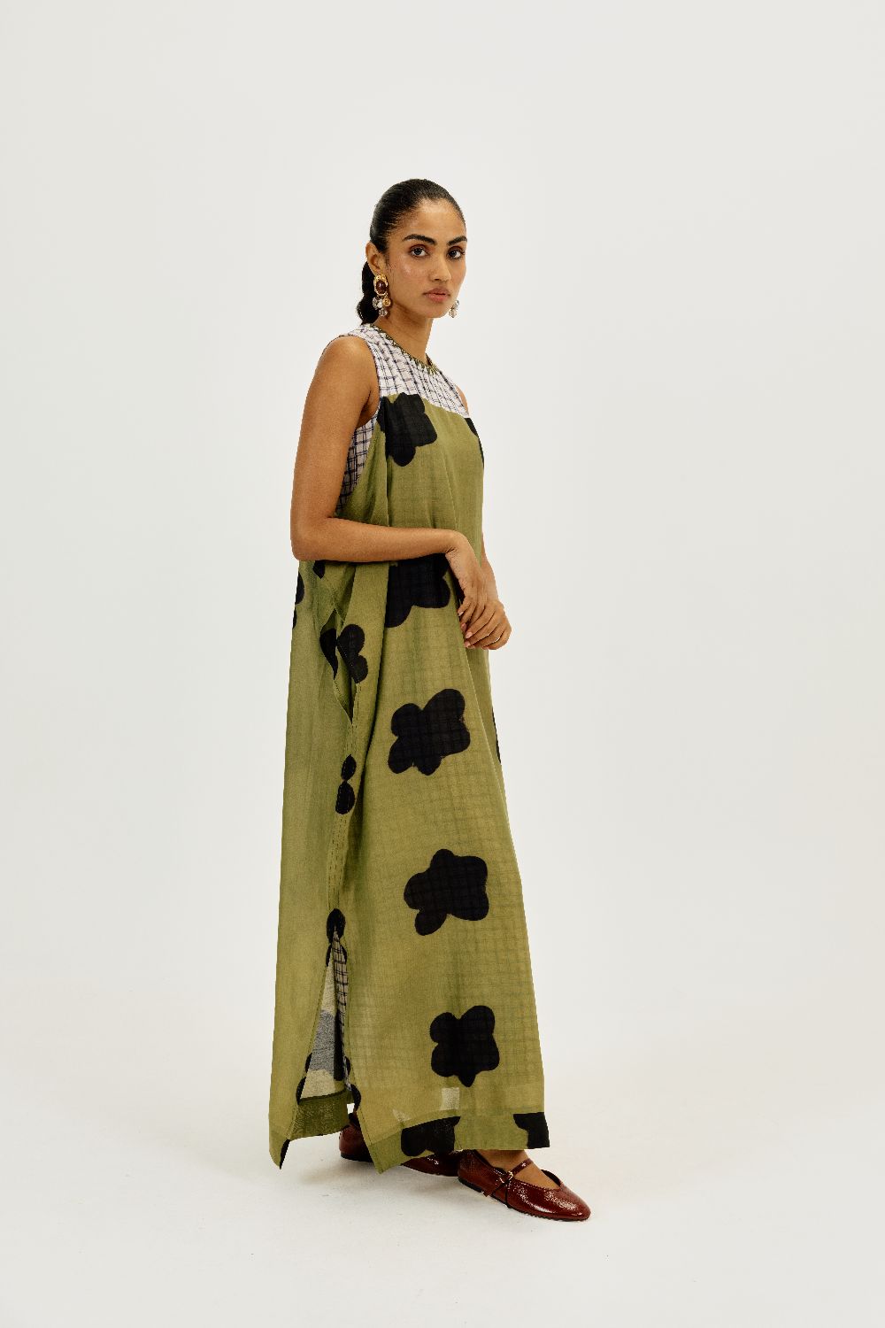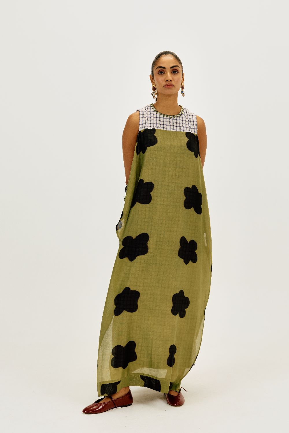 A statement piece that feels as comfortable as it looks striking. This relaxed-fit maxi dress is crafted in airy clamp-dyed Chanderi fabric. The contrast full checkered lining brings playful structure to the flowy silhouette.