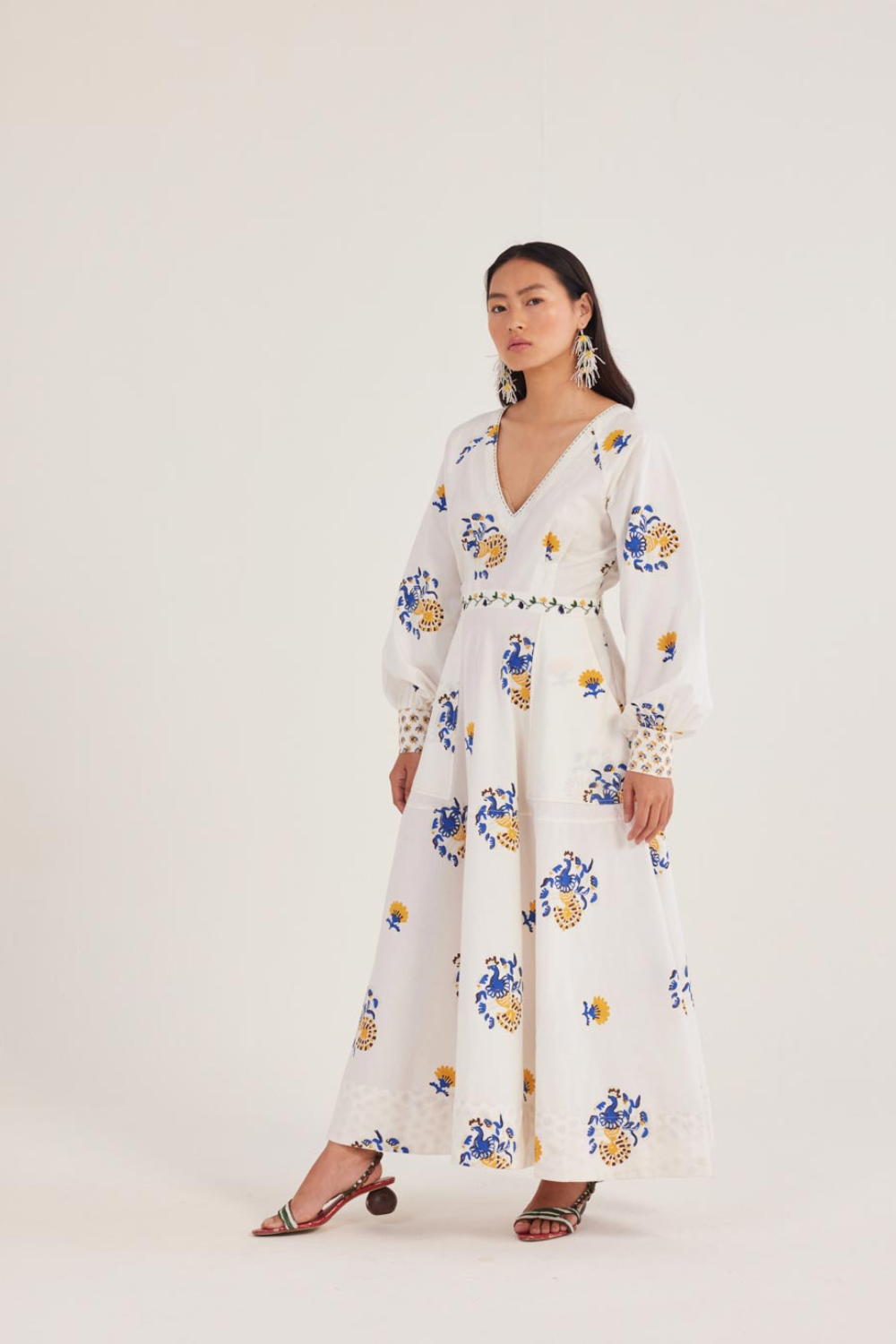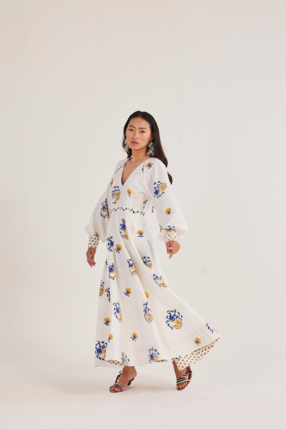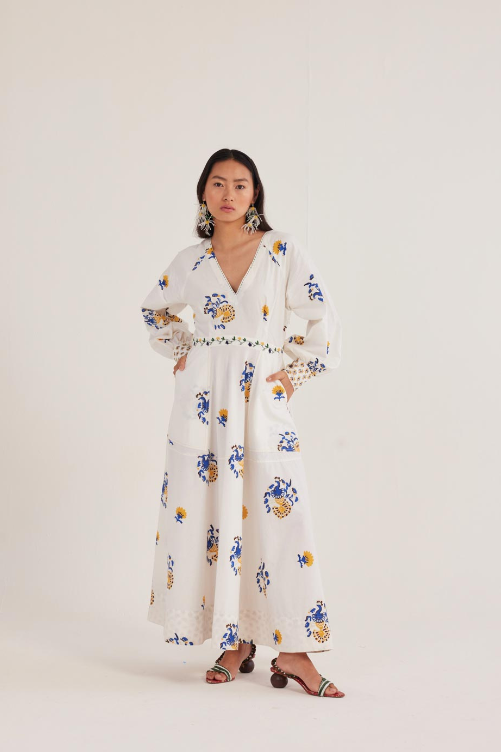 This dress is made for summer! The perfect fit and flare dress is hand block printed in cotton with an embroidered waistline and hand embroidery on the neck.