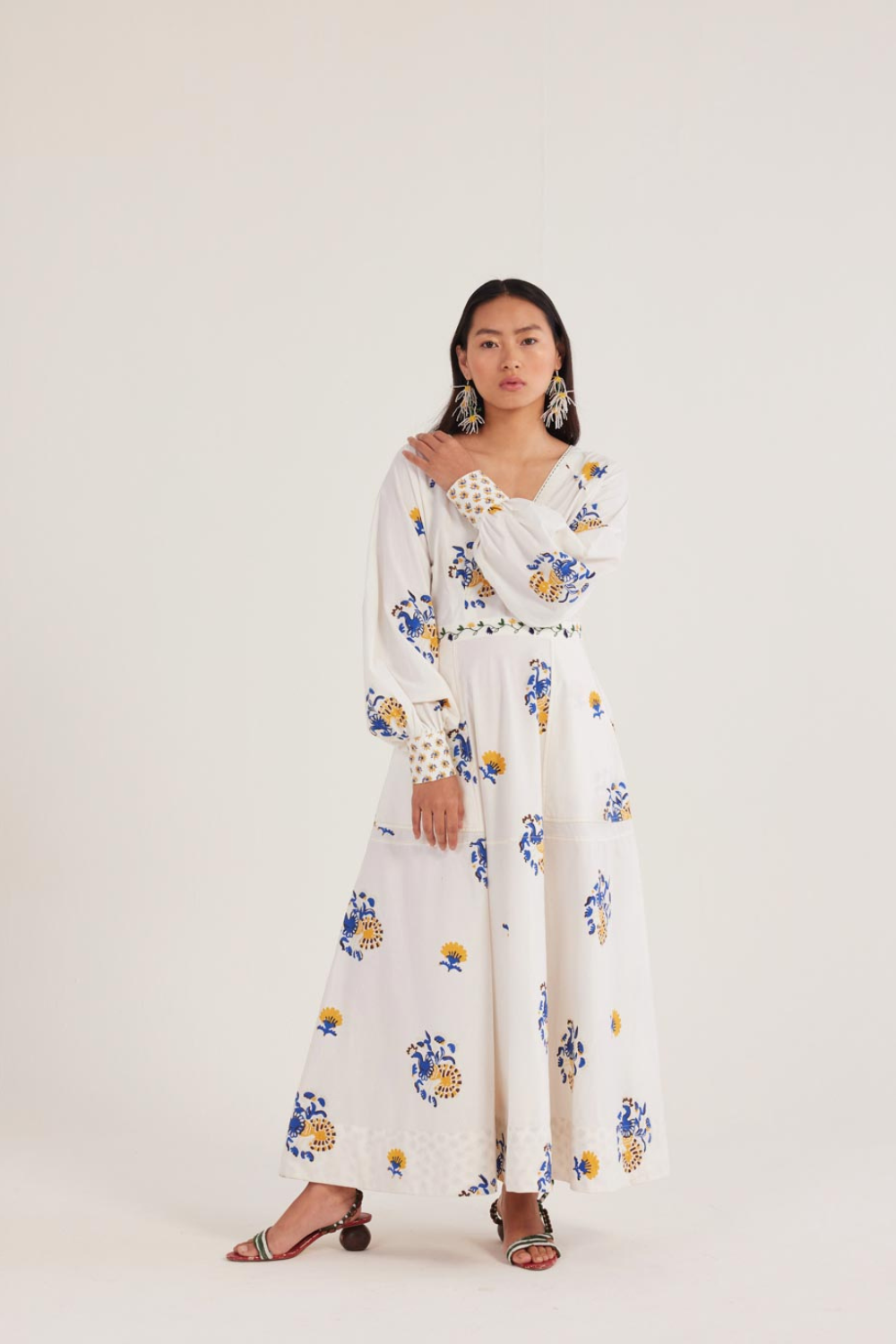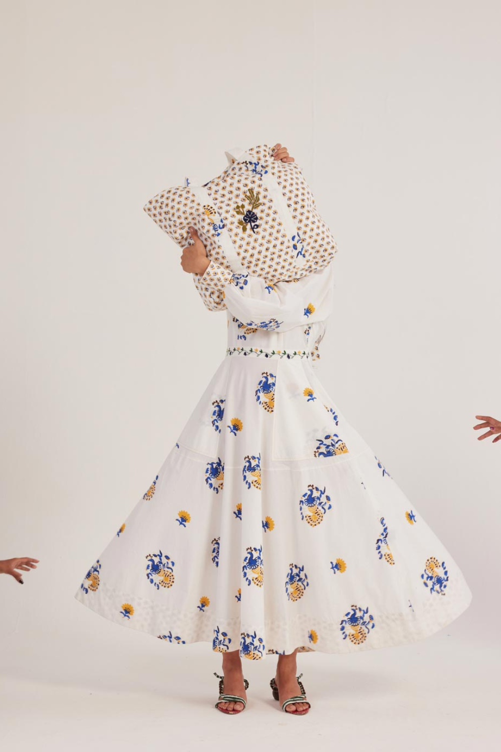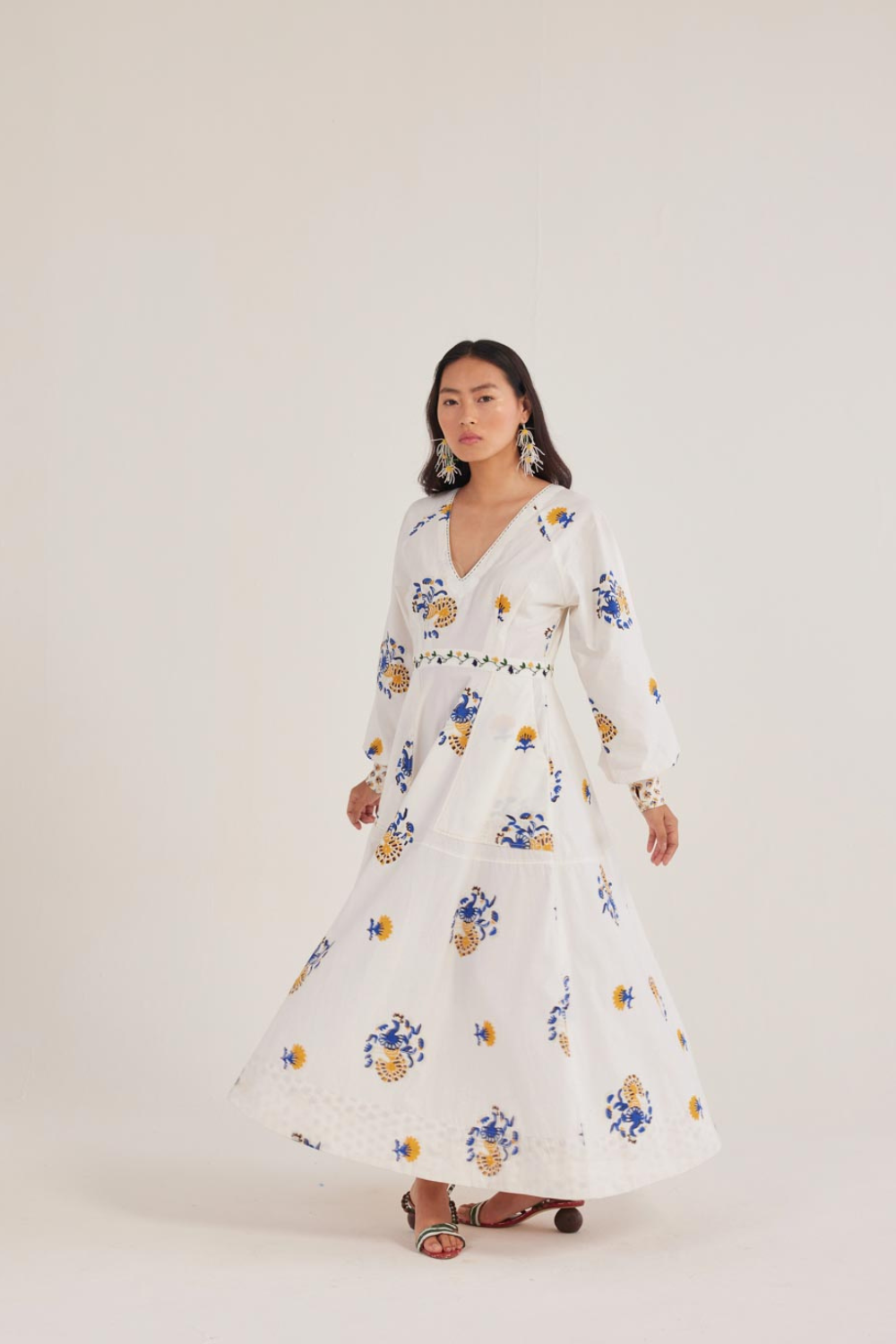 This dress is made for summer! The perfect fit and flare dress is hand block printed in cotton with an embroidered waistline and hand embroidery on the neck.
