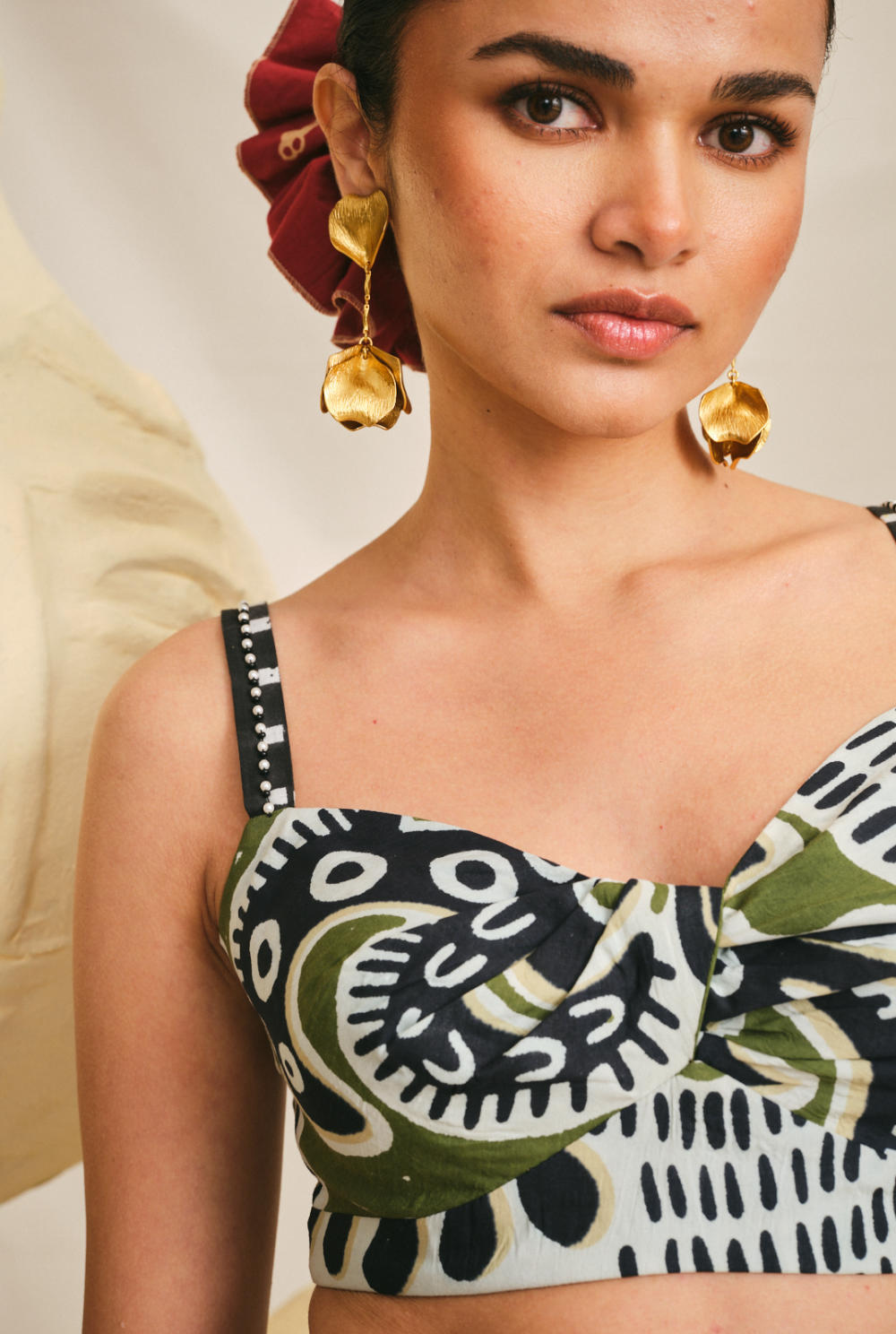 Our draped Sohrai bralette features a cute pearl embroidery on the strap. Pair it with our high-waist Sohrai shorts to complete the look.