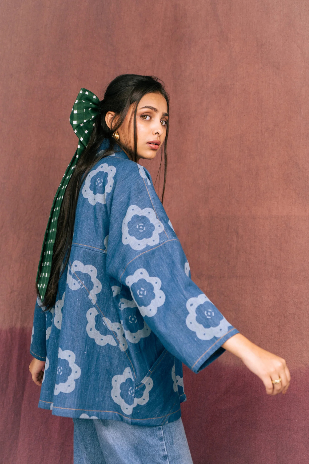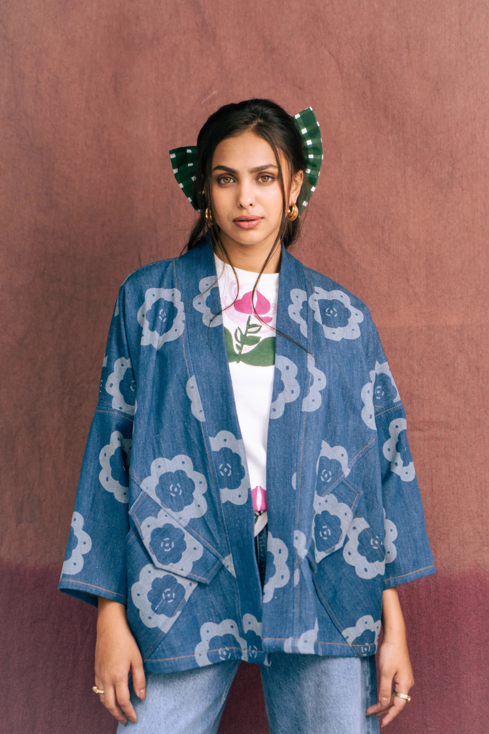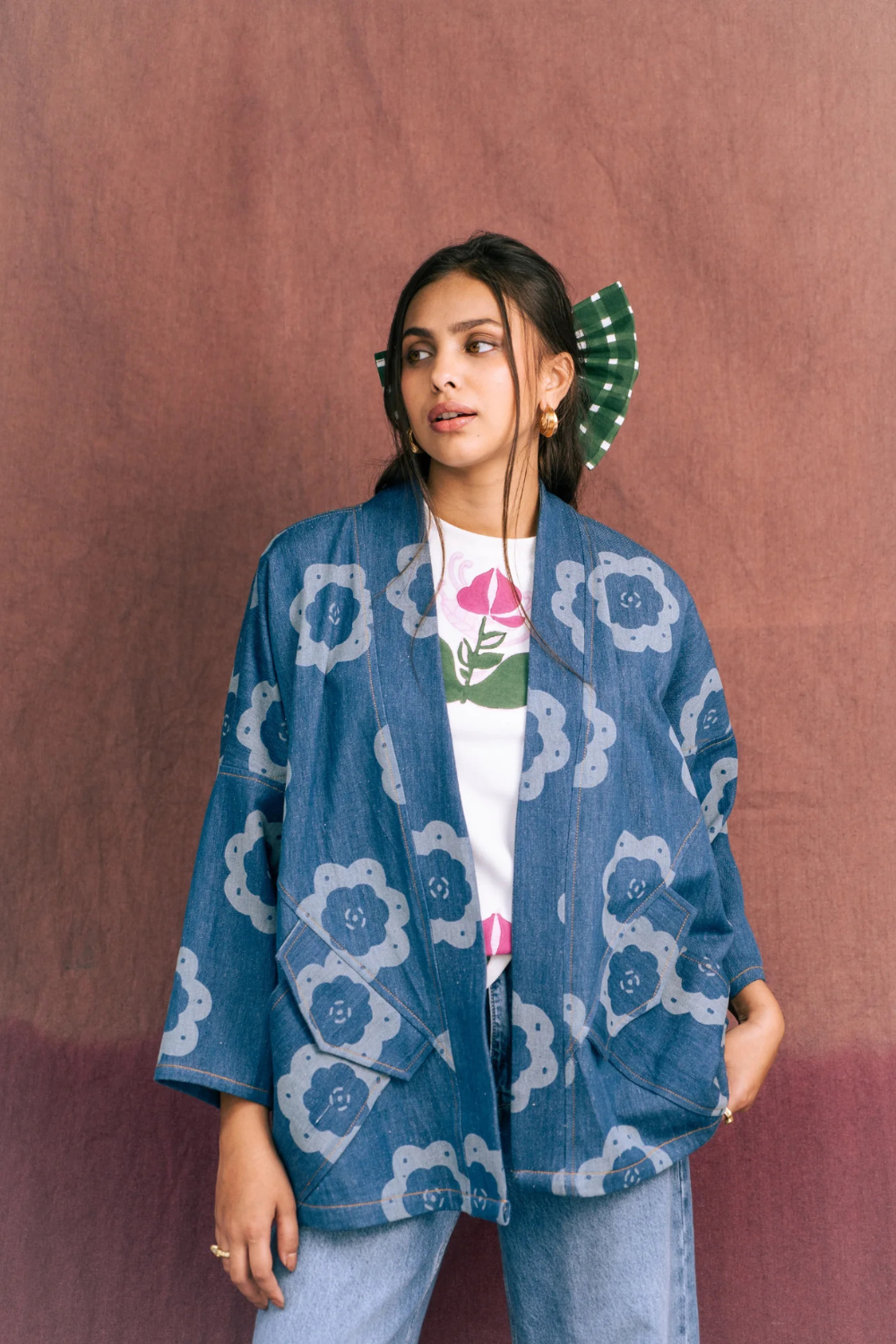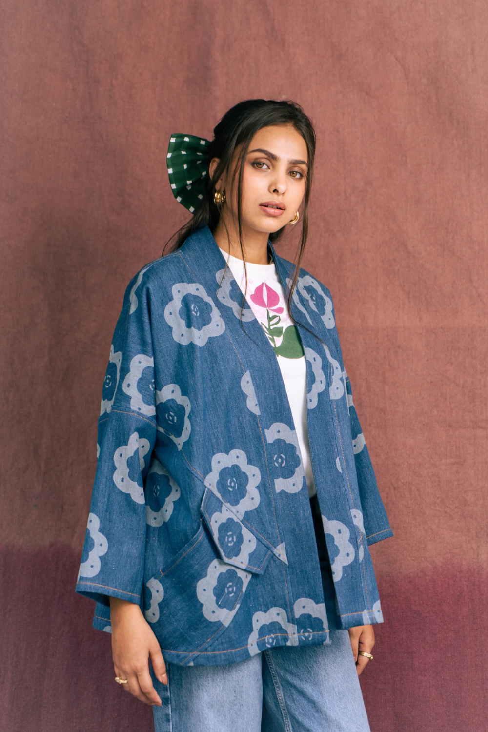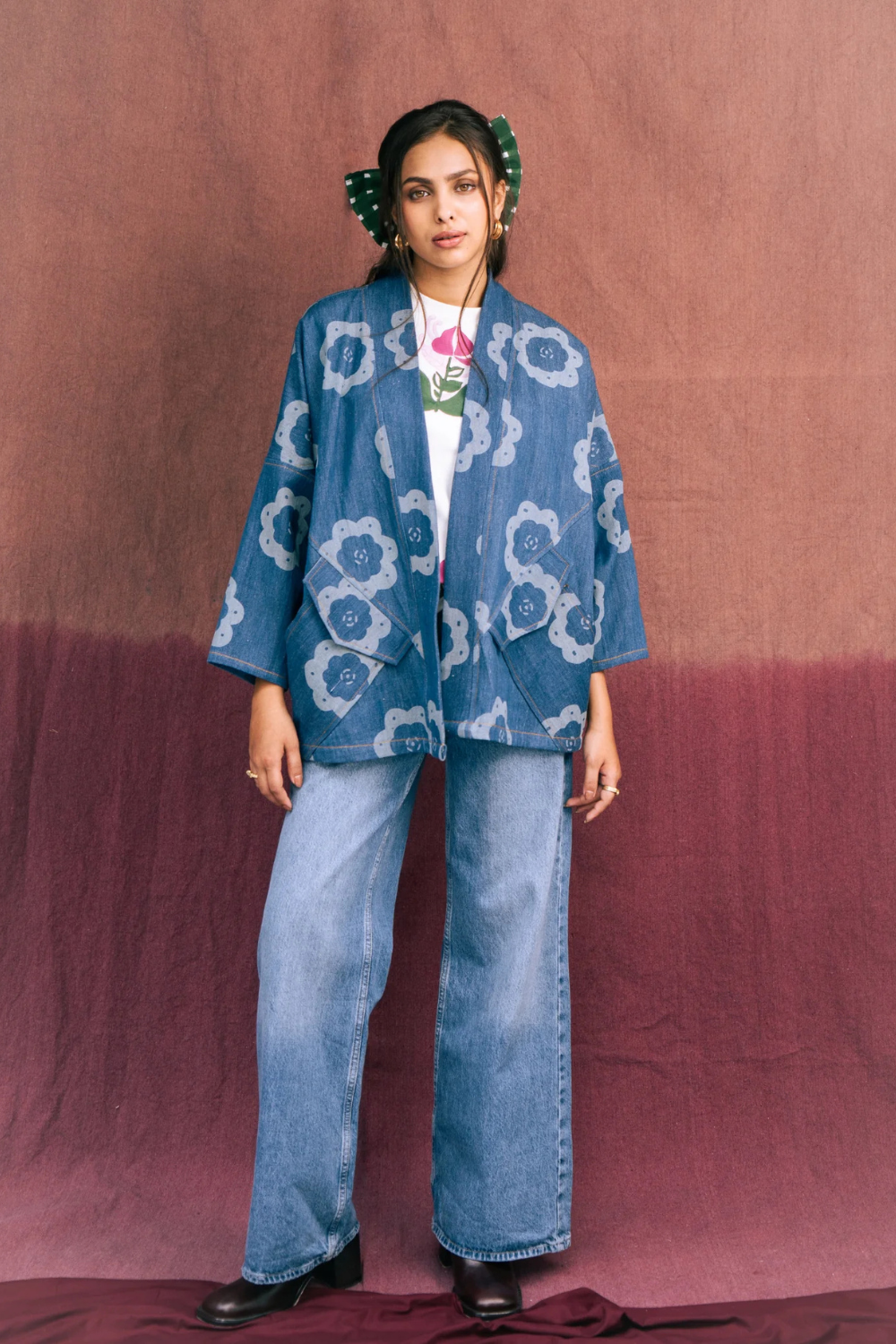 JODI DENIM is special. This one-of-a-kind denim is handwoven, dyed in natural dyes, and then laser-printed with a signature JODI print. A purely handcrafted denim, like no other. Designed with front-angled pockets and kimono sleeves, this jacket is the perfect layer for fall weather.