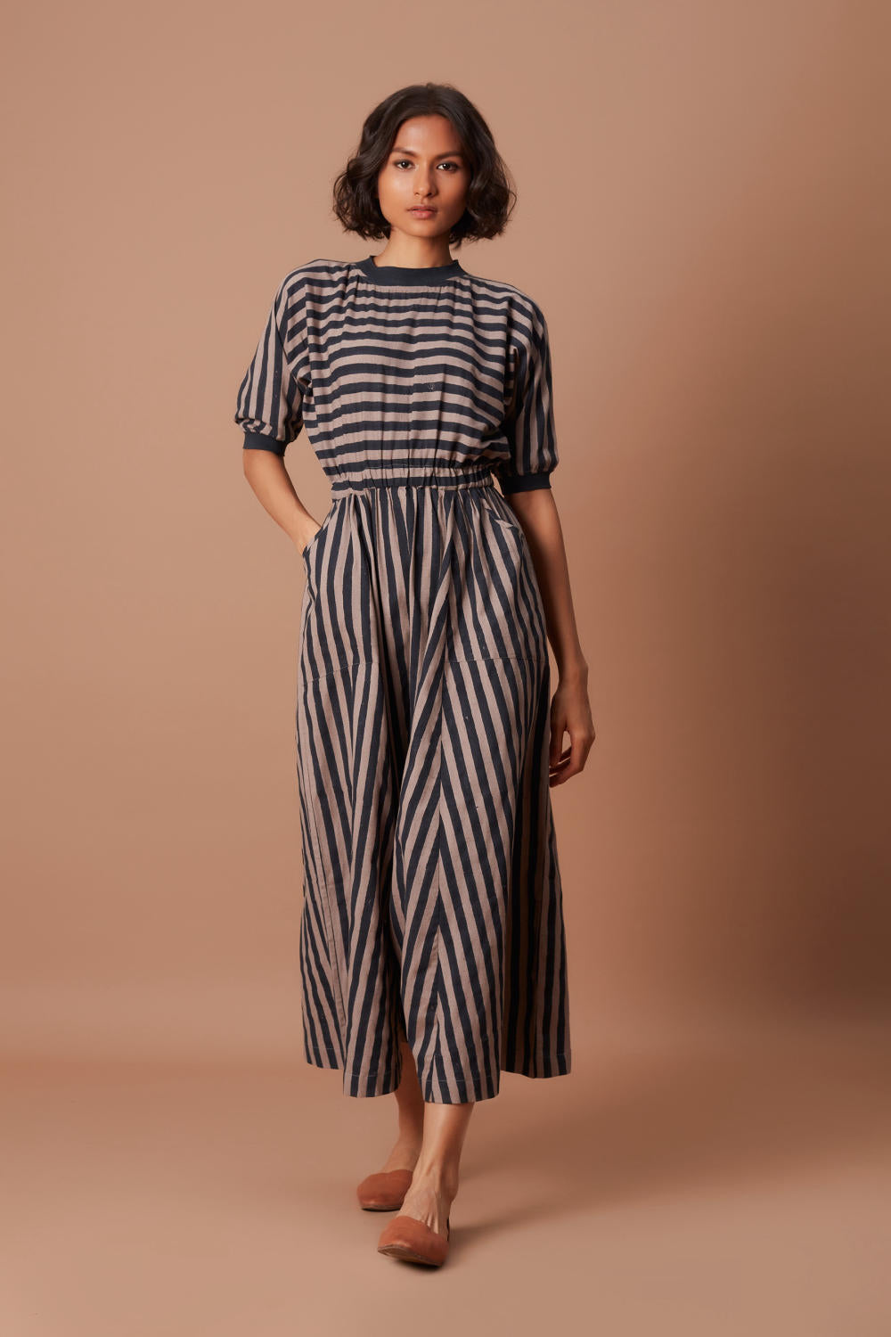 Travel in style and comfort in this jumpsuit. With a ribbed t-shirt collar around the neck, this sporty outfit in stripes with side pockets is versatile for all occasions! With back button closer and rib detail at the sleeve this jumpsuit is ready to be your new go to outfit this summer!!