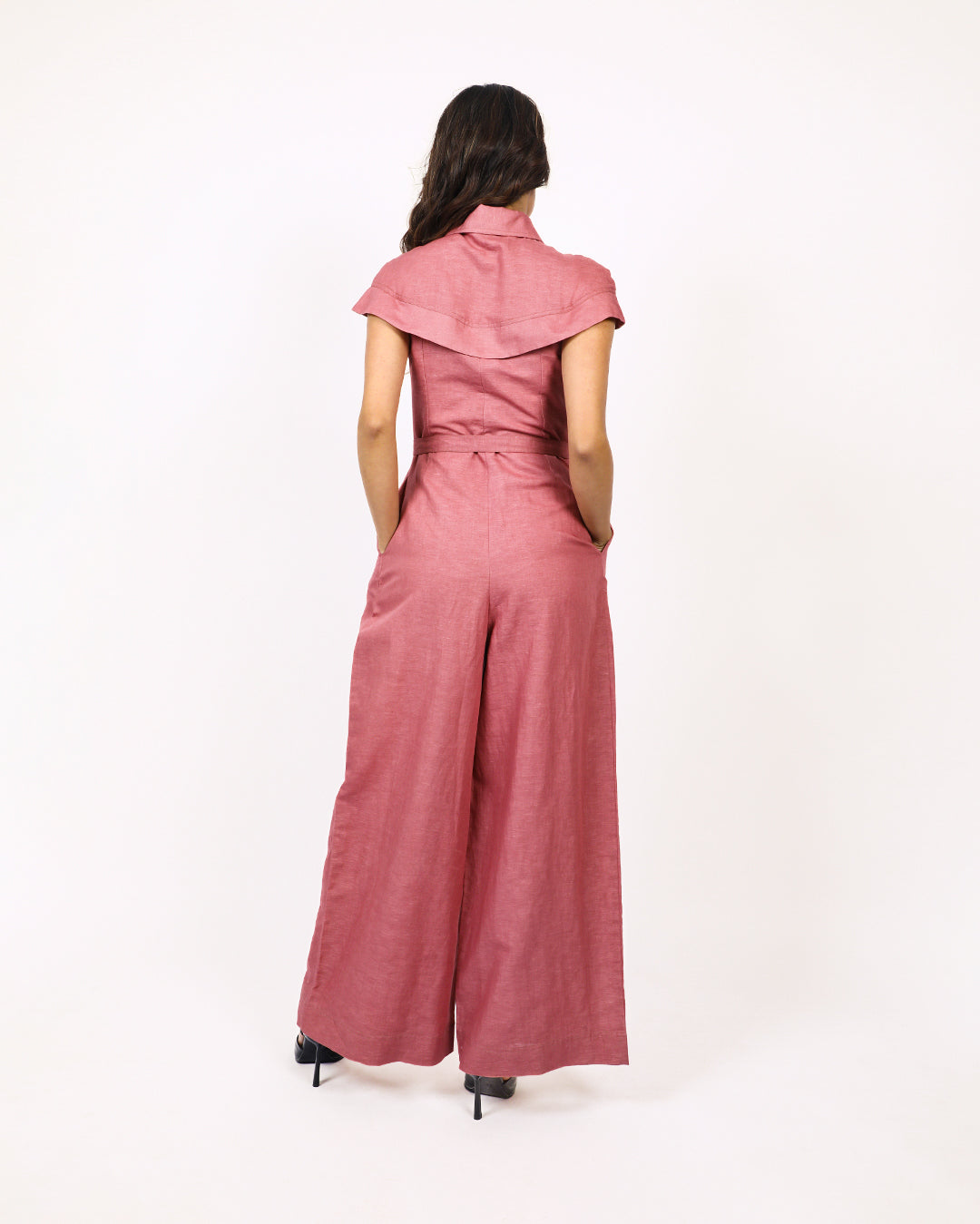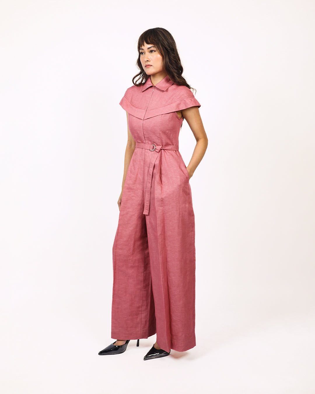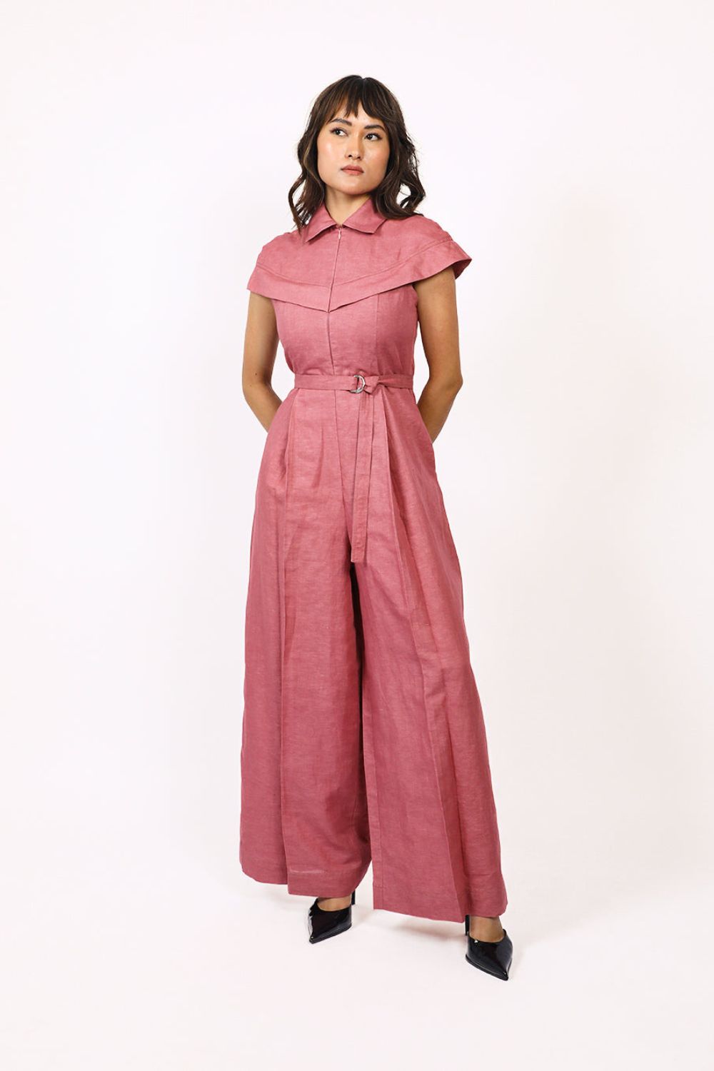 This front pleated linen jumpsuit features a sleek and modern design, with short cape sleeves that extends from the front bodice all the way to the back giving a sharp look to the silhouette. The jumpsuit is completed with a front concealed zip closure and a detachable belt. Crafted from breathable linen, this jumpsuit offers both comfort and sophistication. Model wear size S model height is 5'8 garment length is 58"