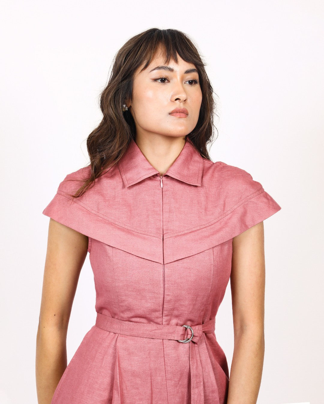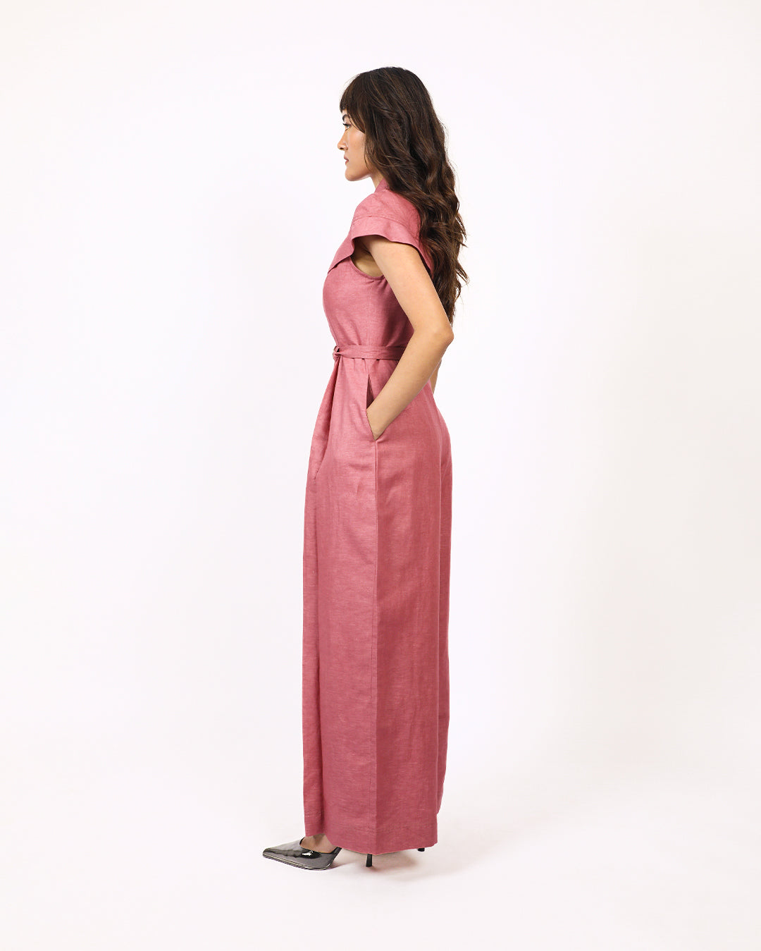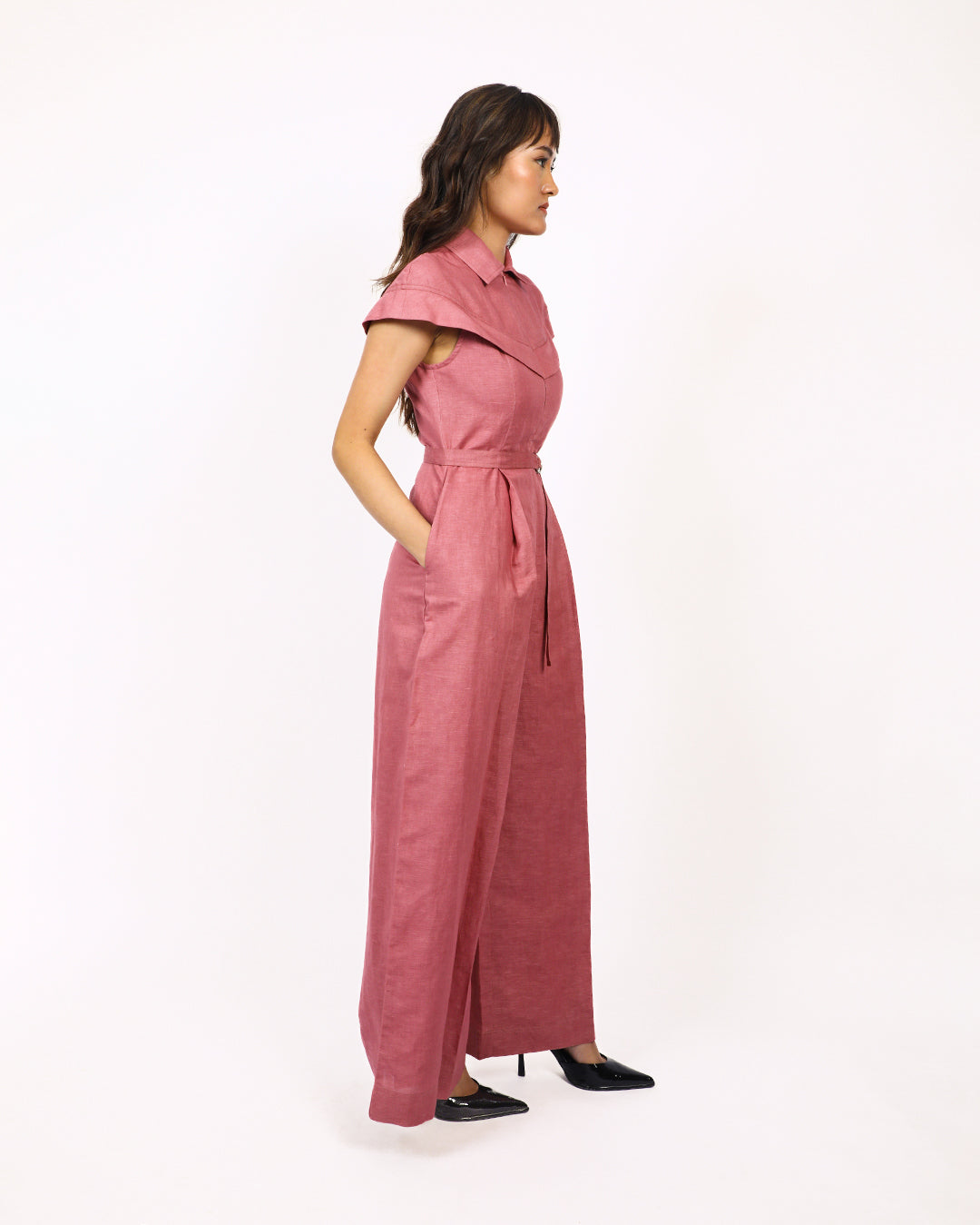 This front pleated linen jumpsuit features a sleek and modern design, with short cape sleeves that extends from the front bodice all the way to the back giving a sharp look to the silhouette. The jumpsuit is completed with a front concealed zip closure and a detachable belt. Crafted from breathable linen, this jumpsuit offers both comfort and sophistication. Model wear size S model height is 5'8 garment length is 58"