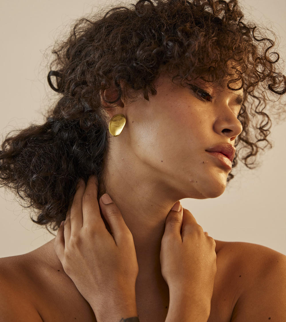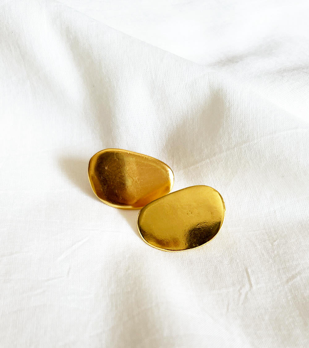 An asymmetrical pair of ear studs that has a unique cutwork and is beautifully crafted to complete your minimalistic look. All our pieces are made in Jaipur, India. Constructed in brass and dipped in 18 karat gold by our artisans. Designed for effortless & minimal styling. Handcrafted in India.